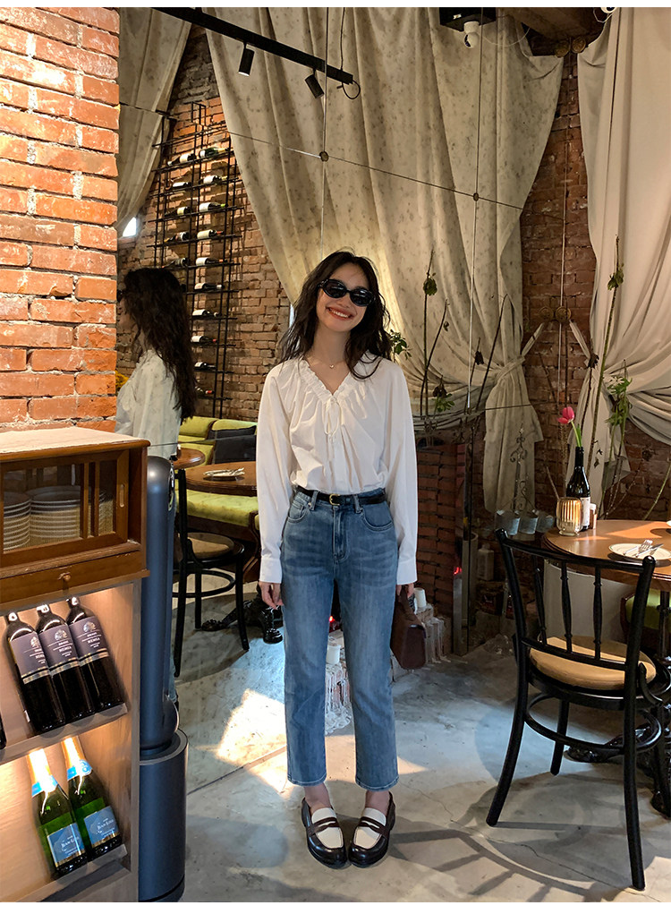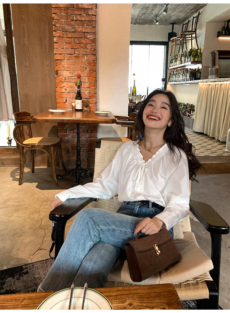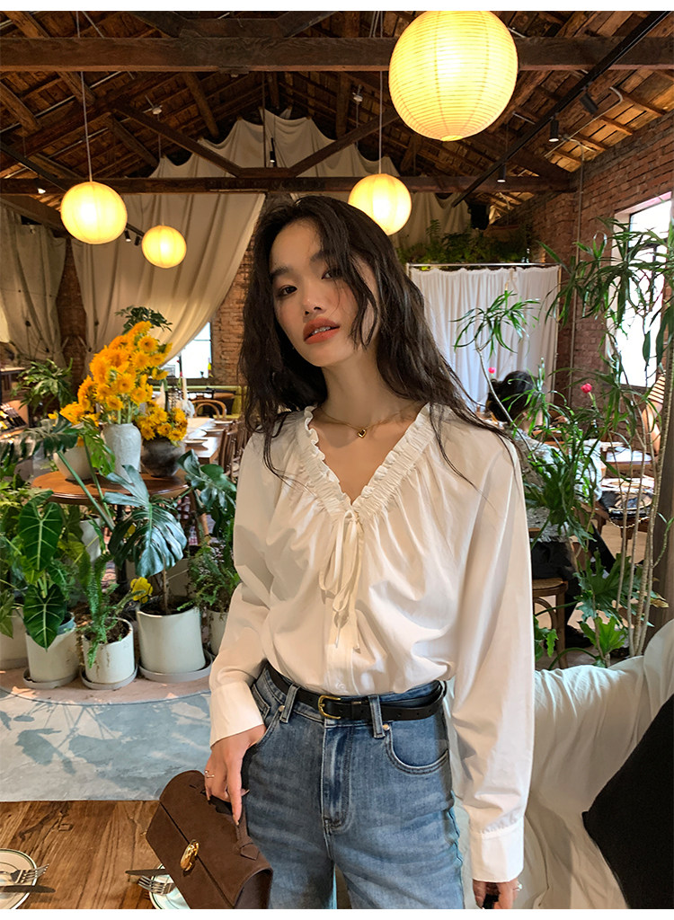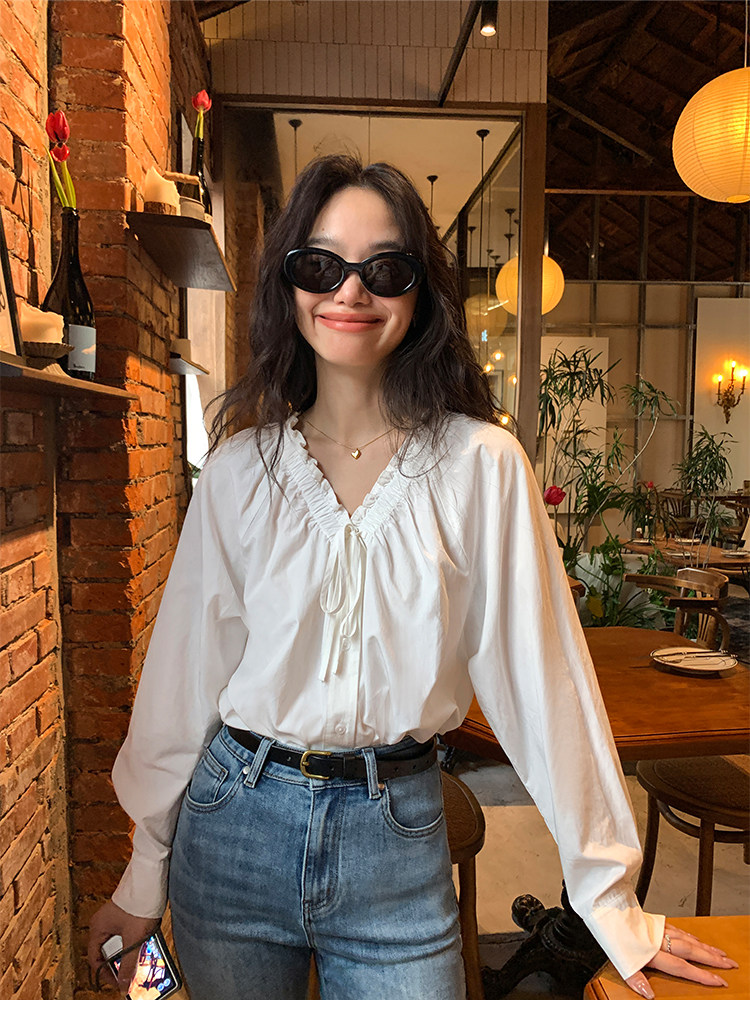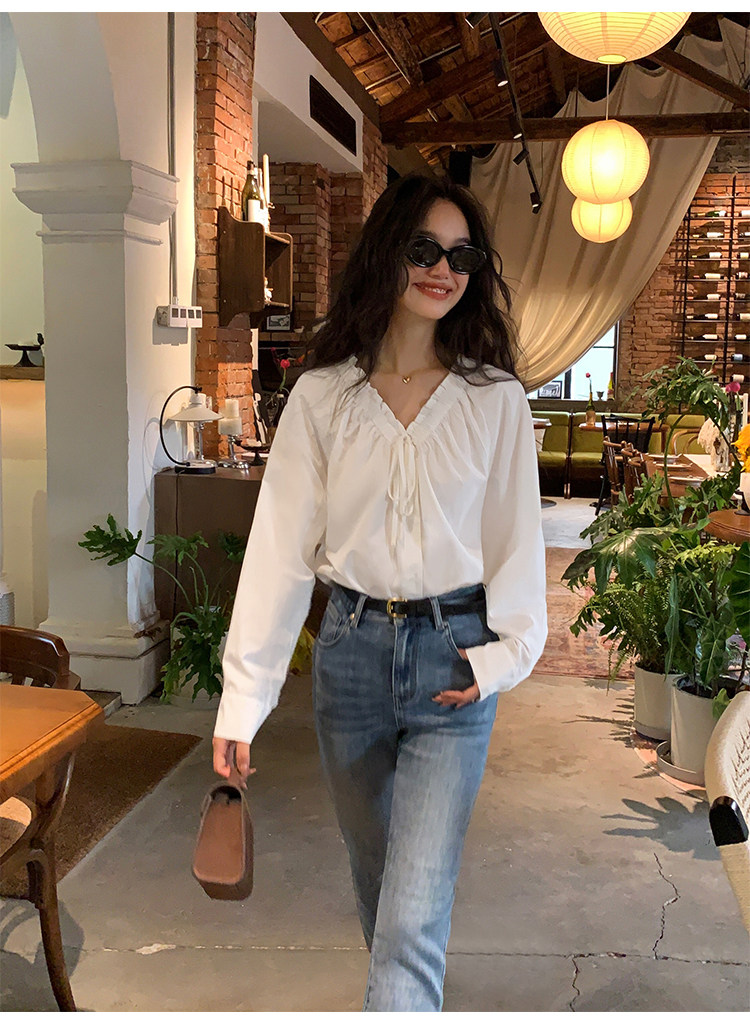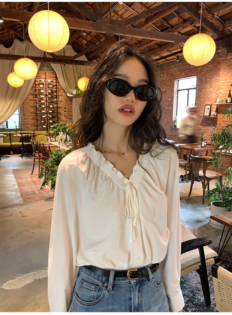 pusumede Ретро рубашка, лонгслив, французский стиль, V-образный вырез, по фигуре