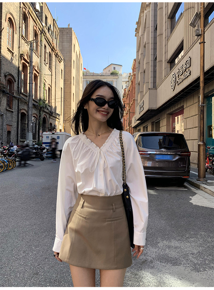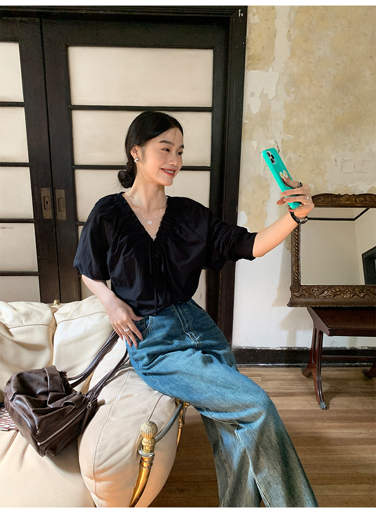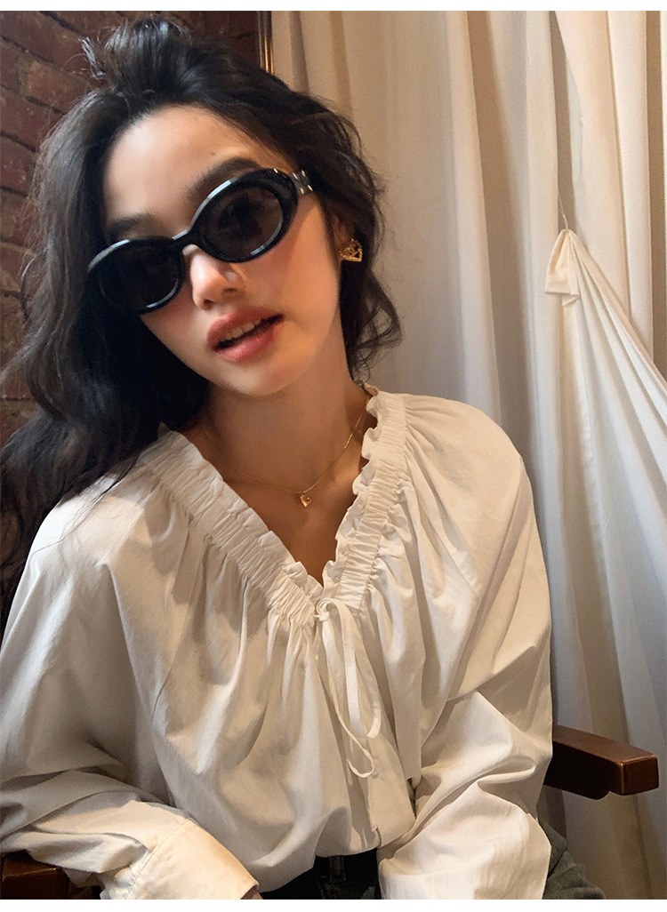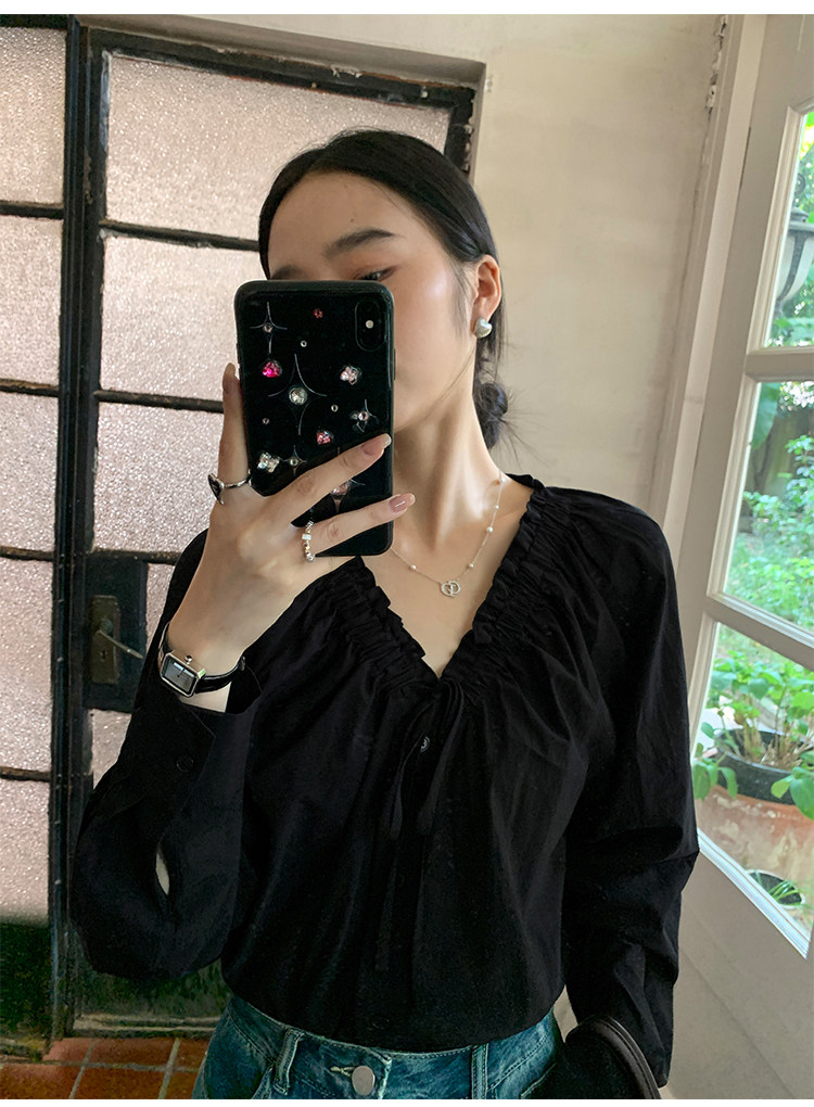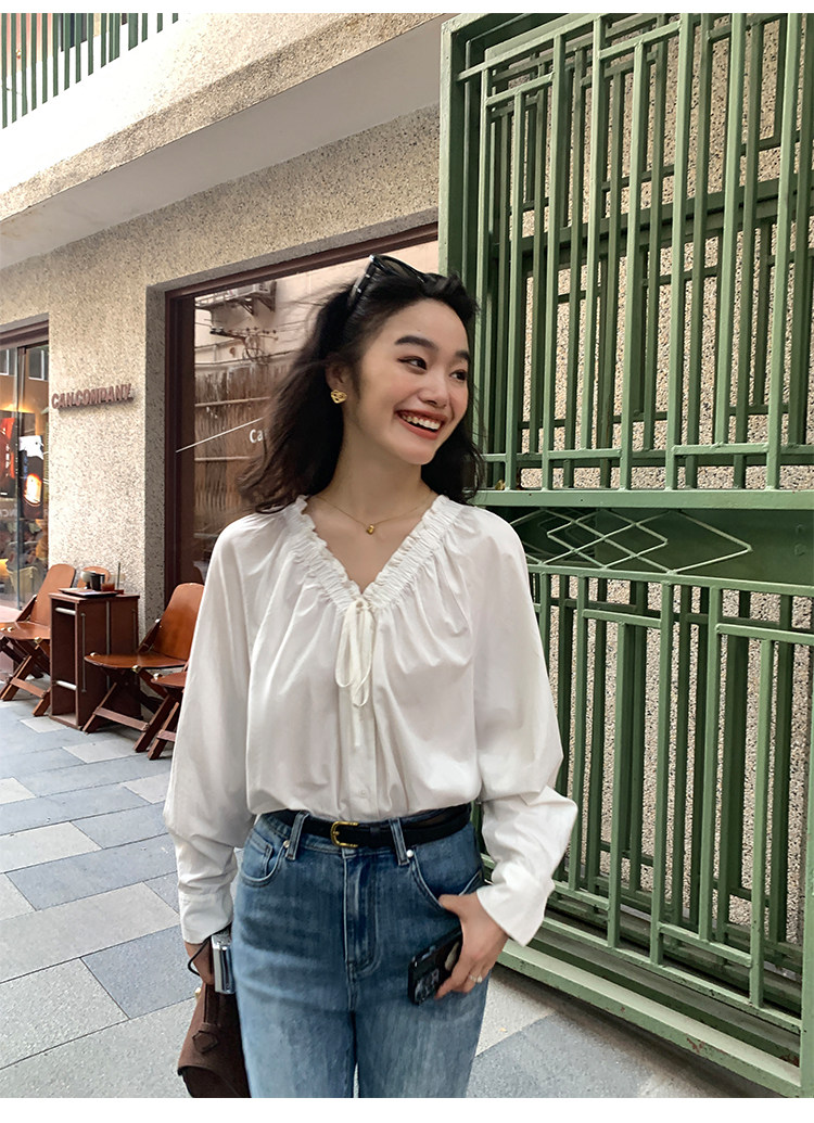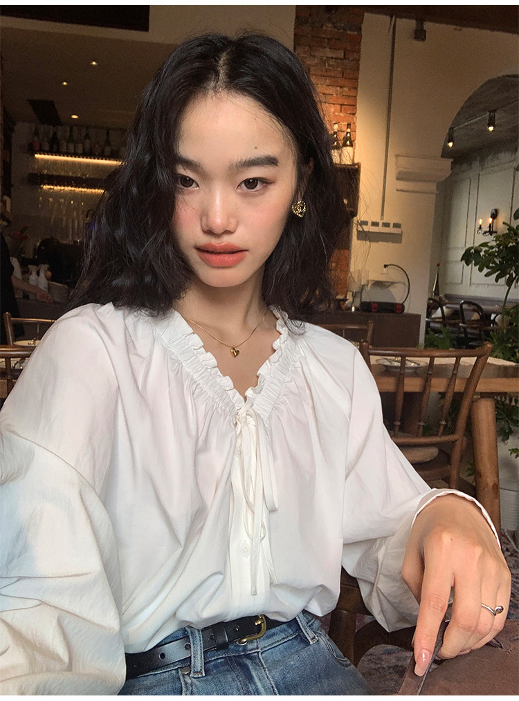 pusumede Ретро рубашка, лонгслив, французский стиль, V-образный вырез, по фигуре