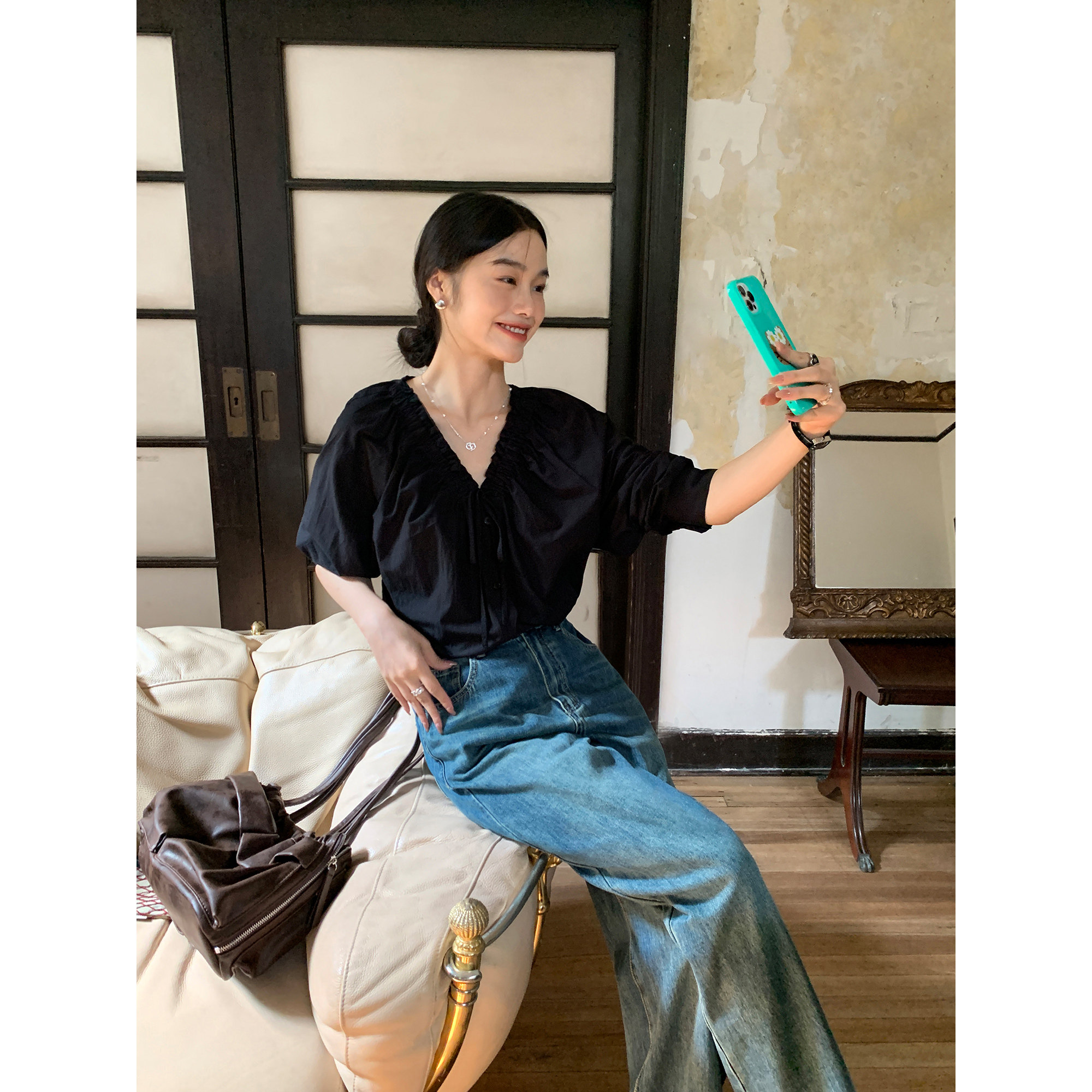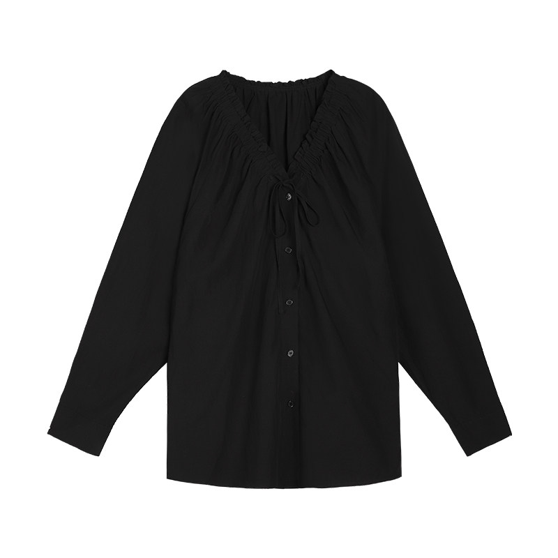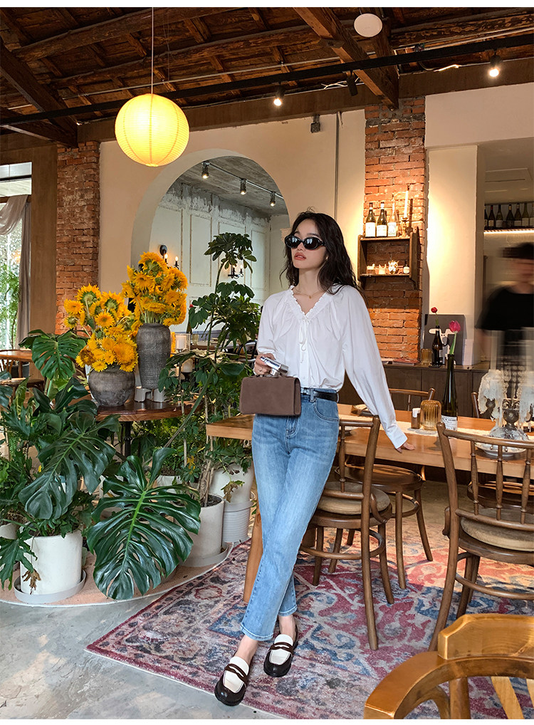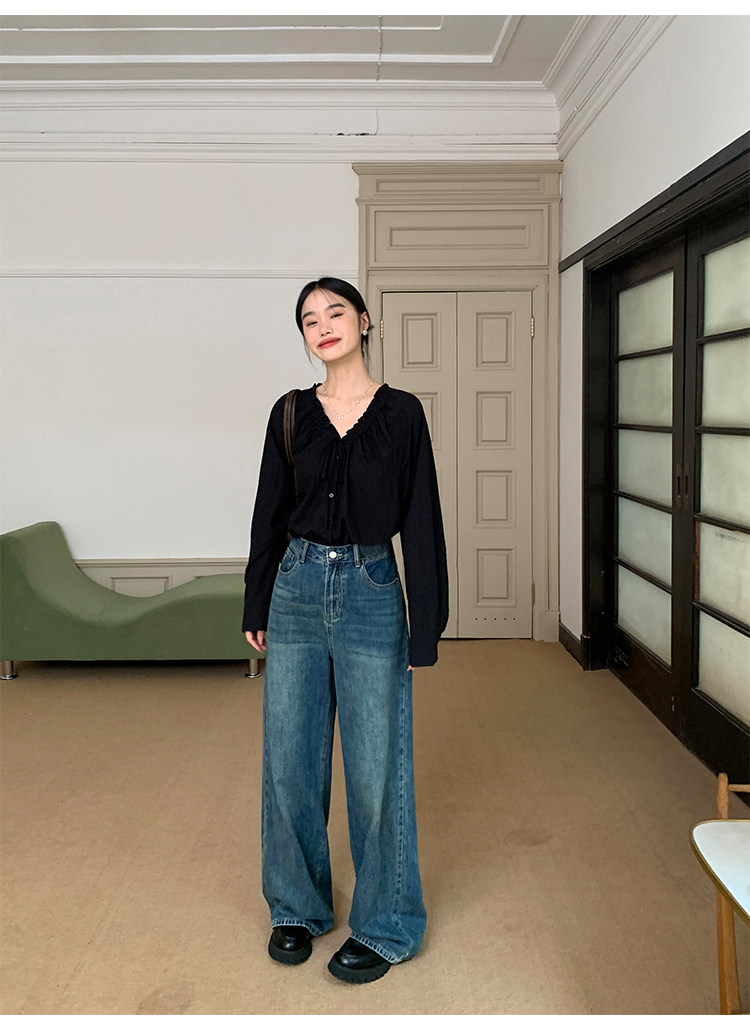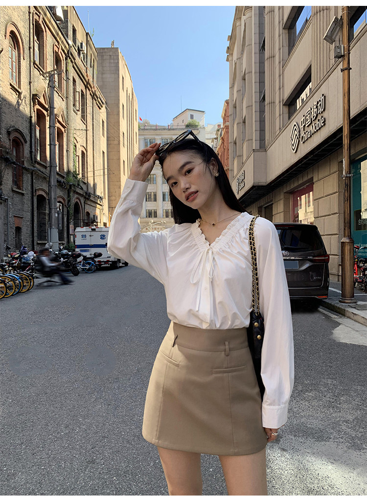 pusumede Ретро рубашка, лонгслив, французский стиль, V-образный вырез, по фигуре