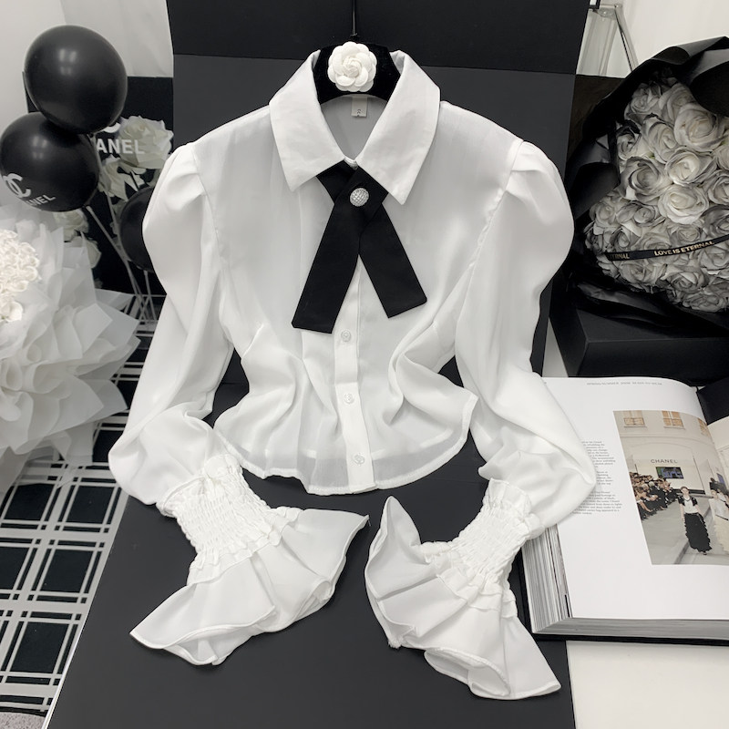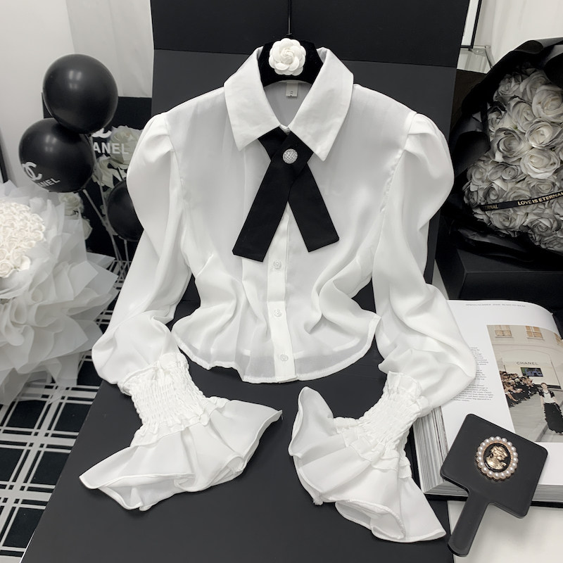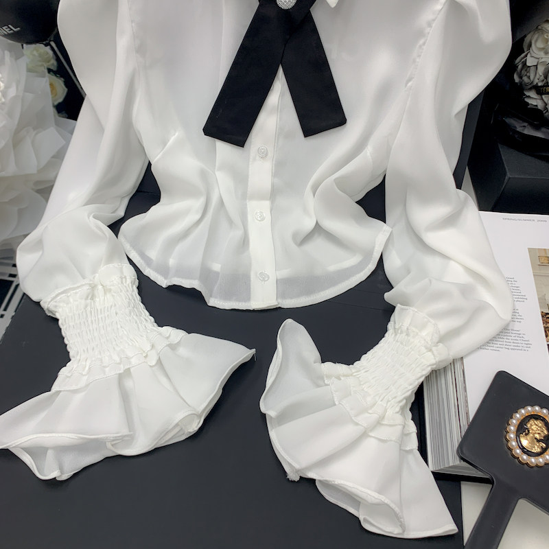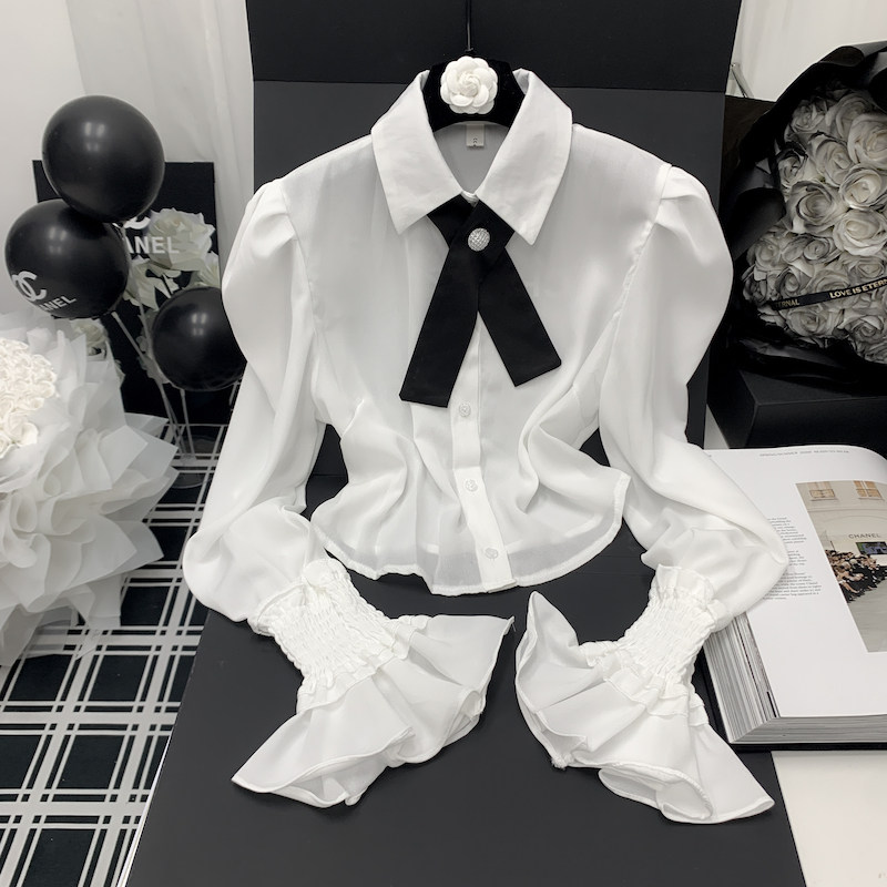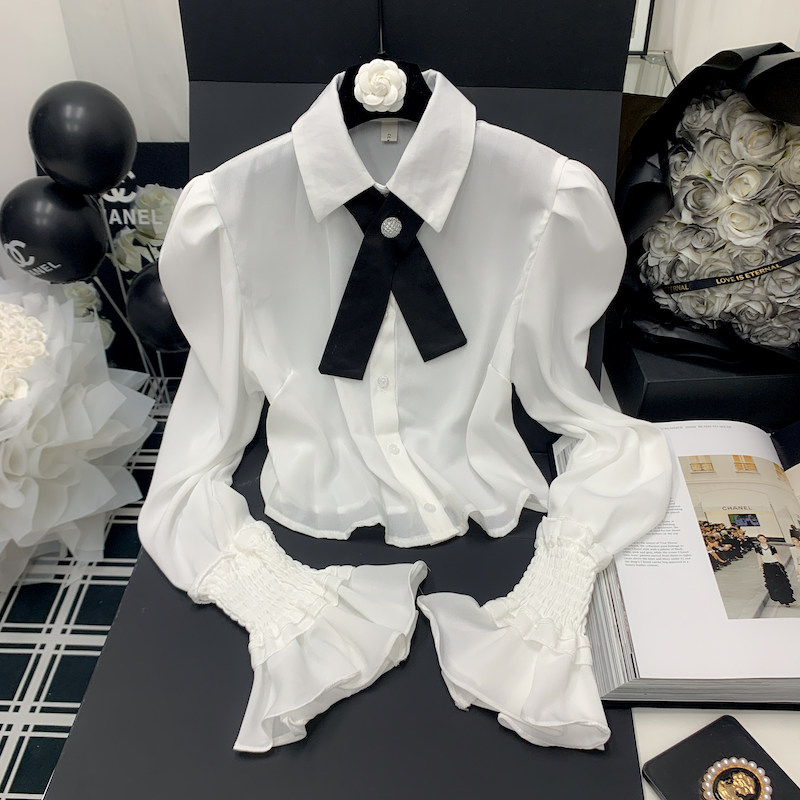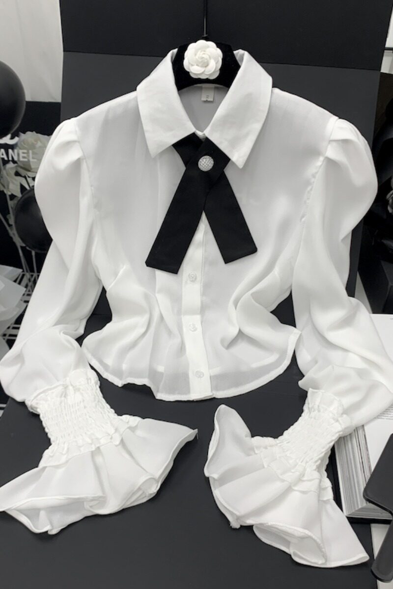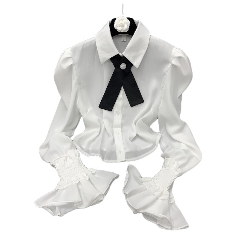 Осенняя рубашка с бантиком, дизайнерский белый мегафон, французский стиль, воротник поло, коллекция 2023, новая коллекция