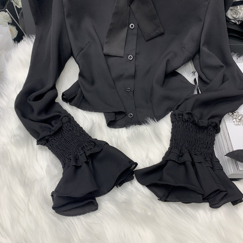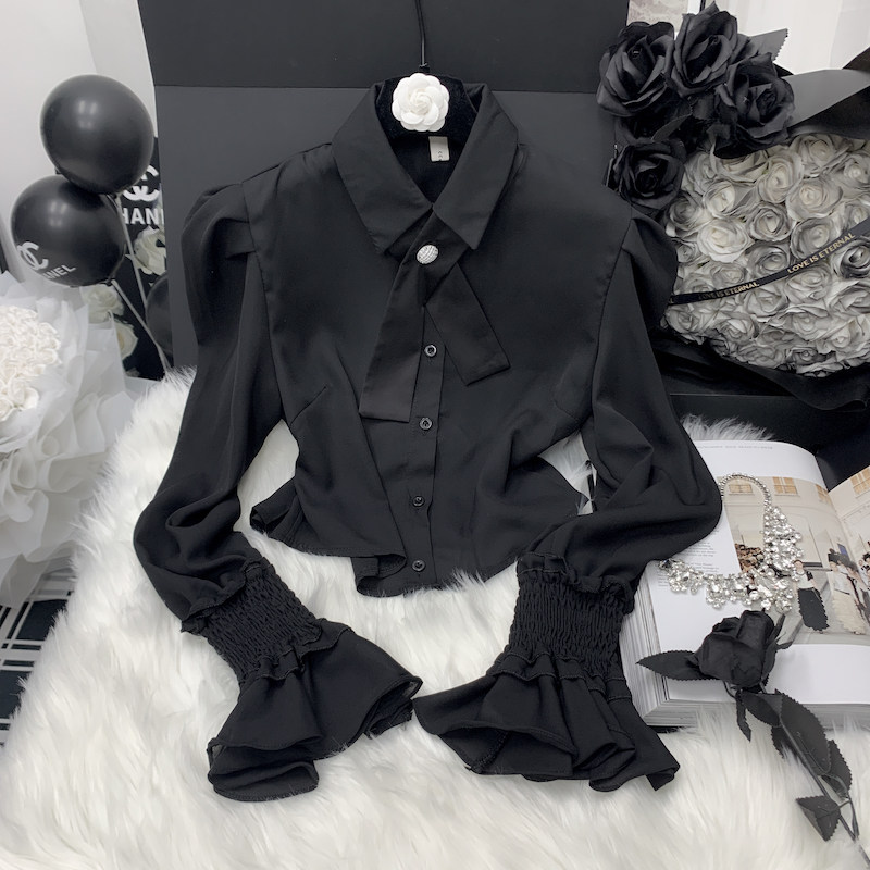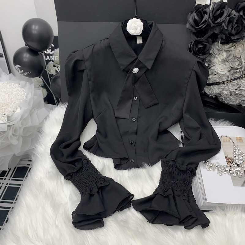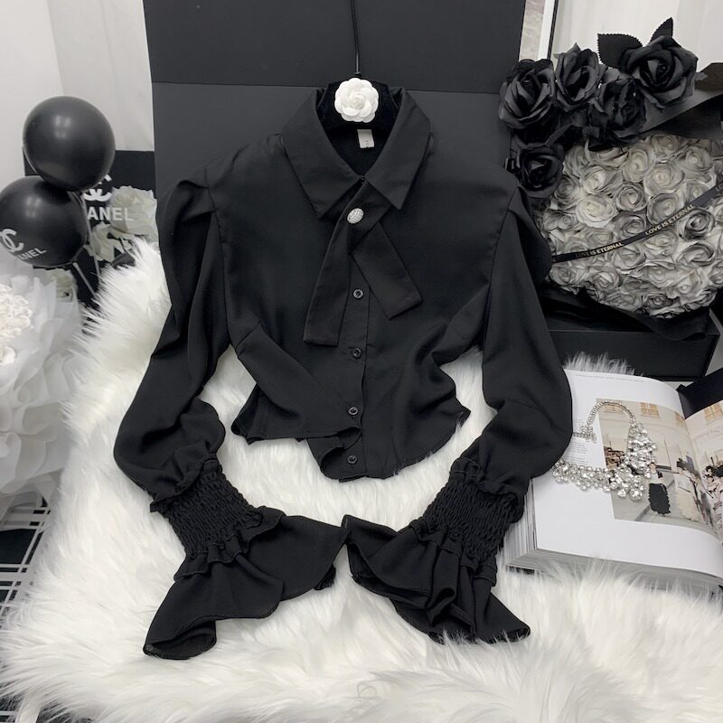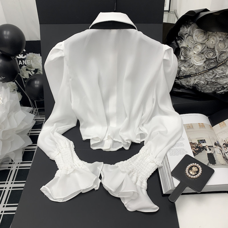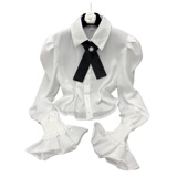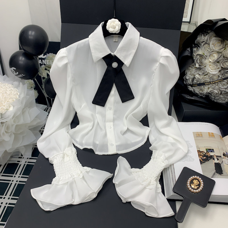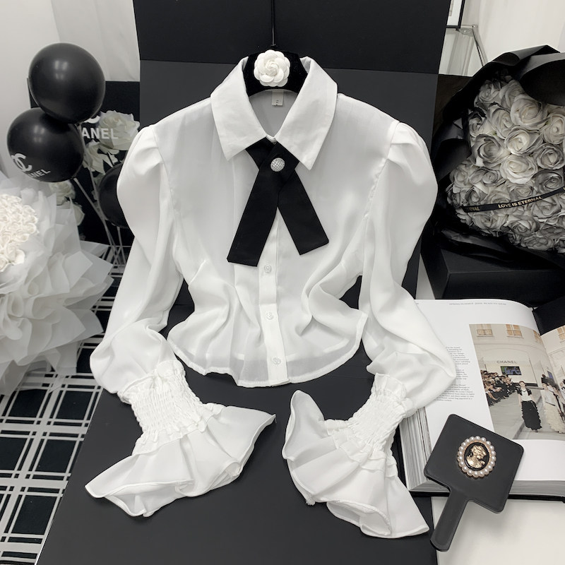 Осенняя рубашка с бантиком, дизайнерский белый мегафон, французский стиль, воротник поло, коллекция 2023, новая коллекция