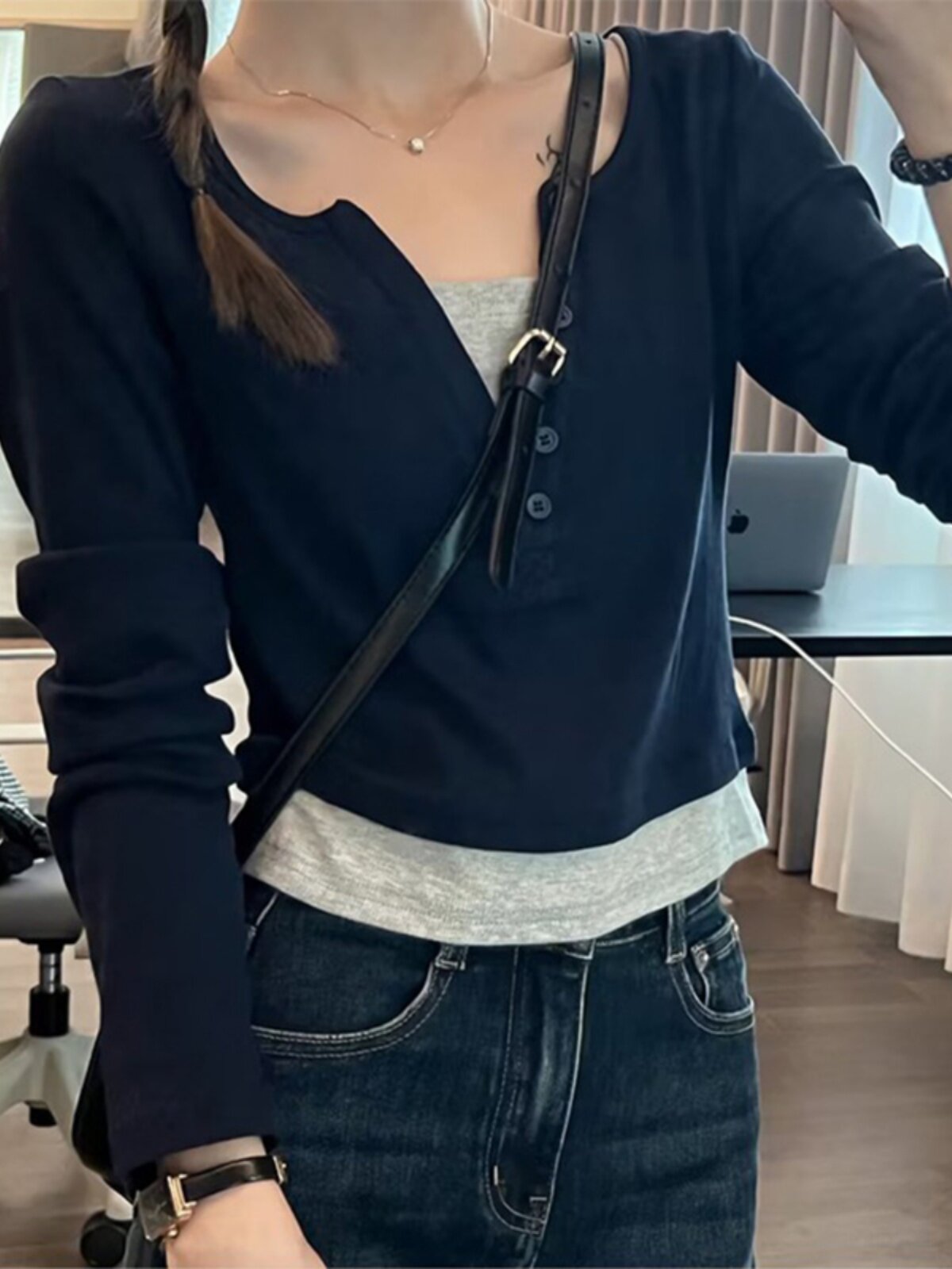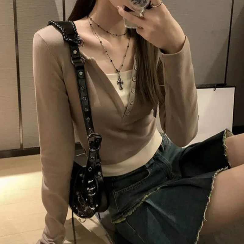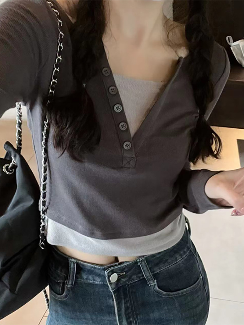 Дизайнерский комплект, осенний приталенный короткий базовый лонгслив, тренд сезона, V-образный вырез