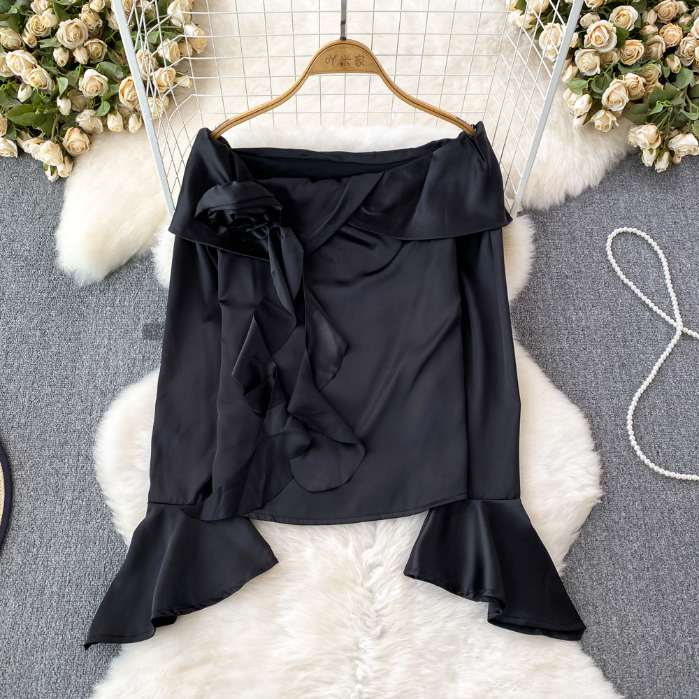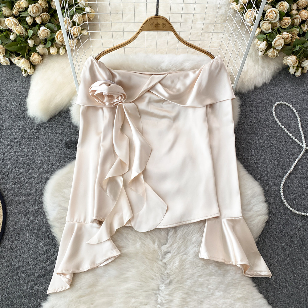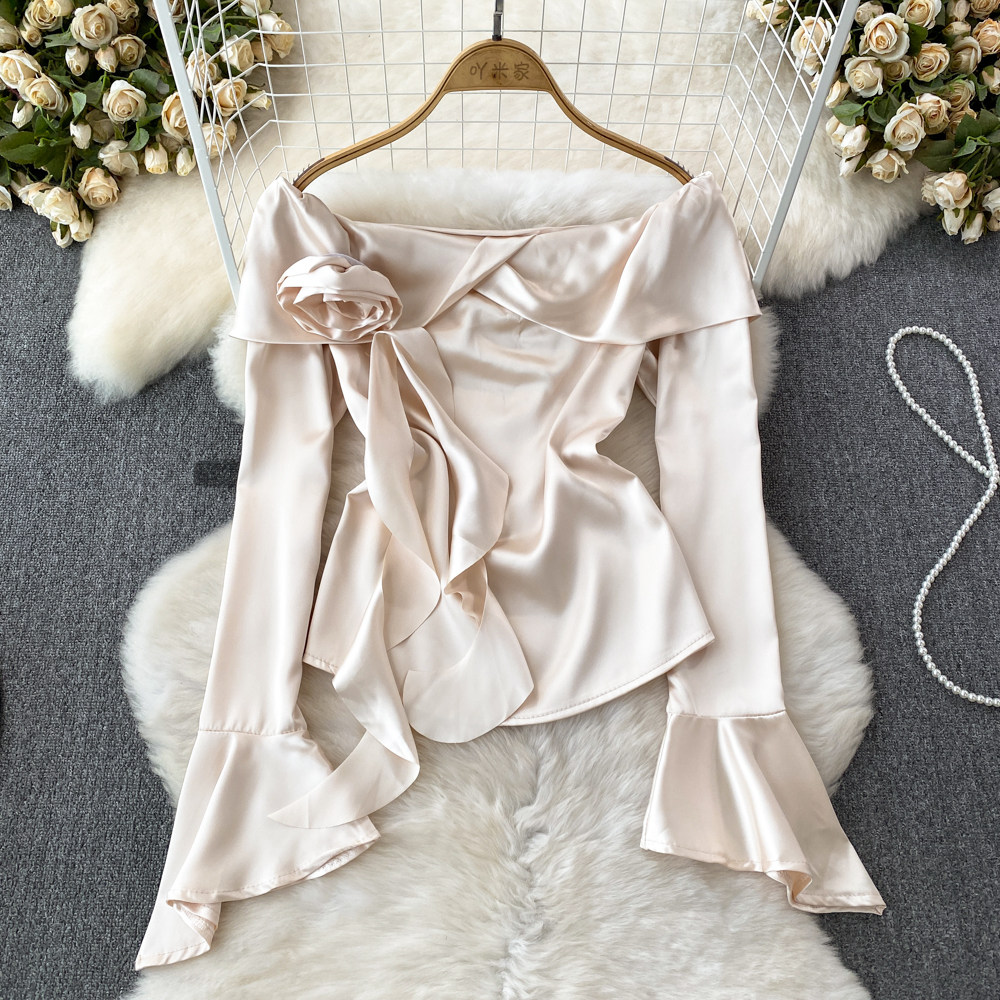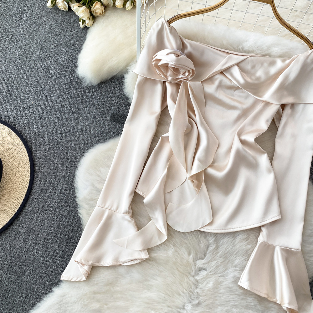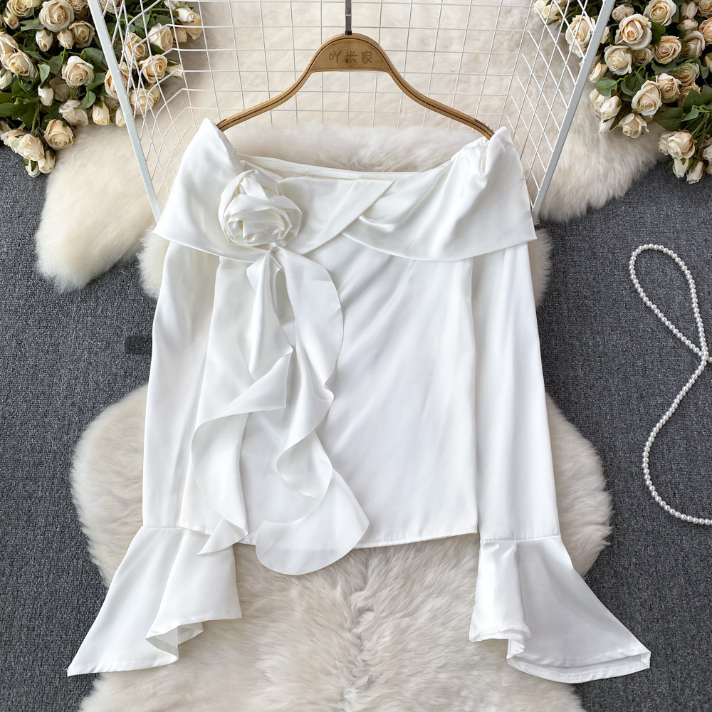 Мегафон, трехмерный лонгслив, рубашка, в корейском стиле, в цветочек, открытые плечи, облегающий крой, в западном стиле