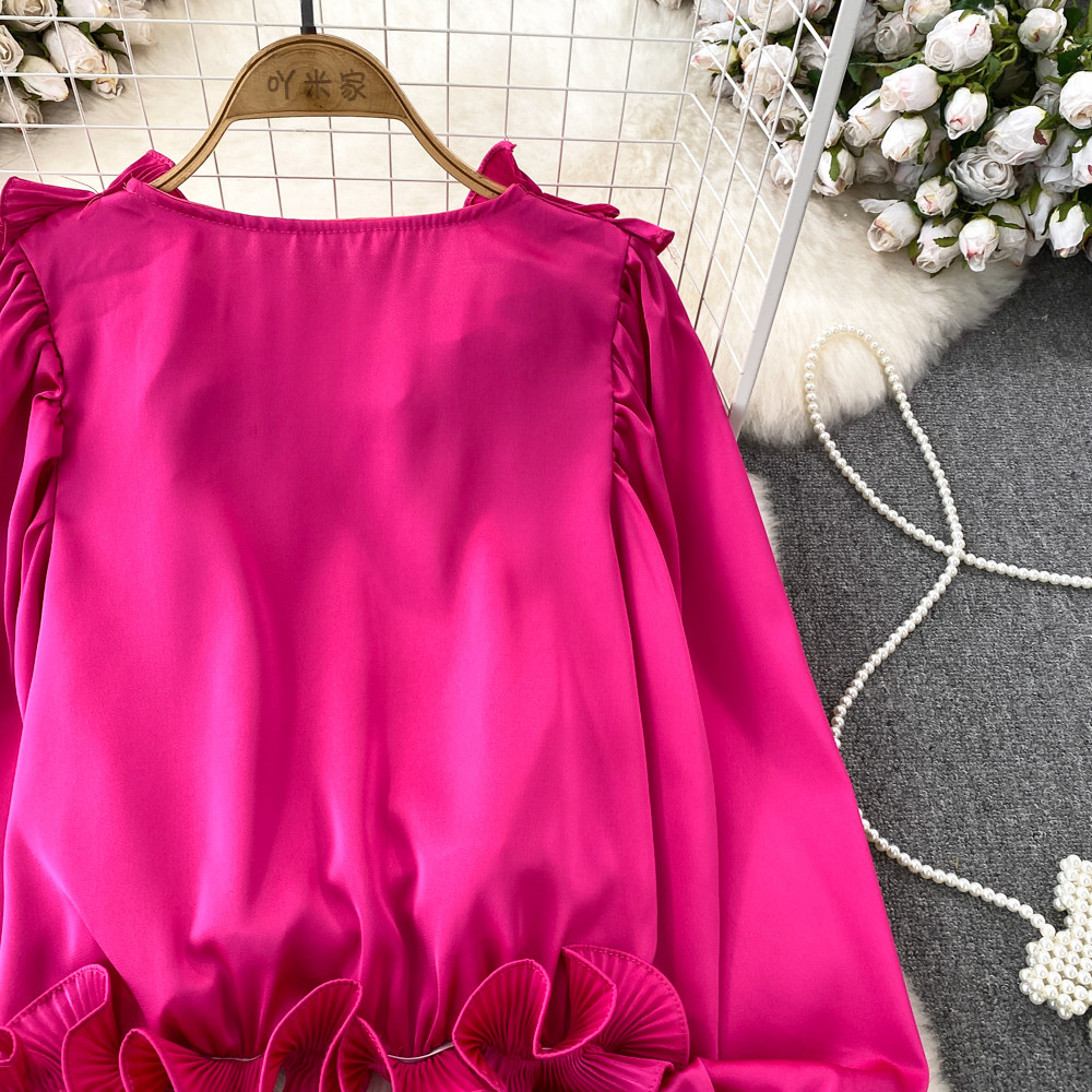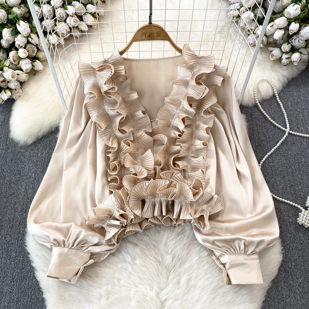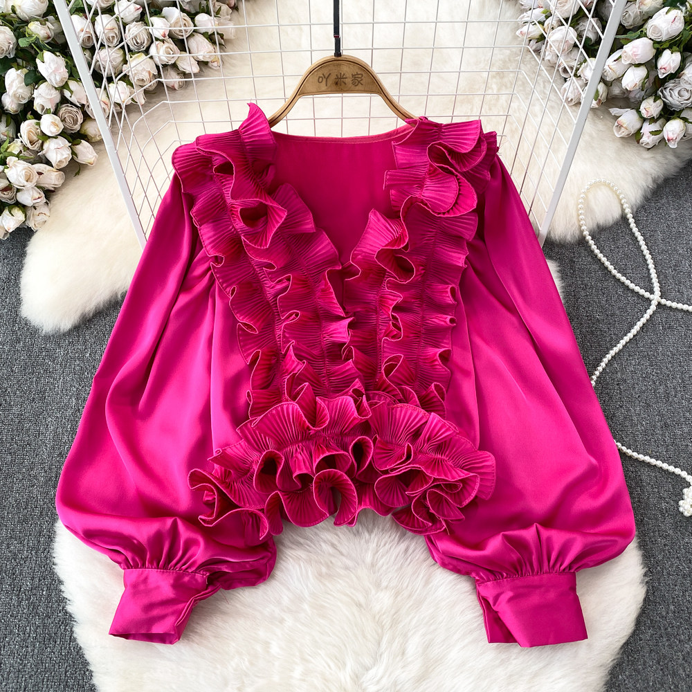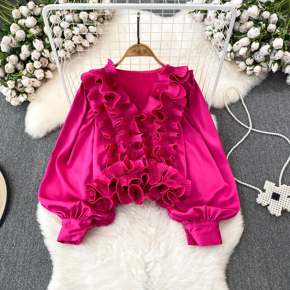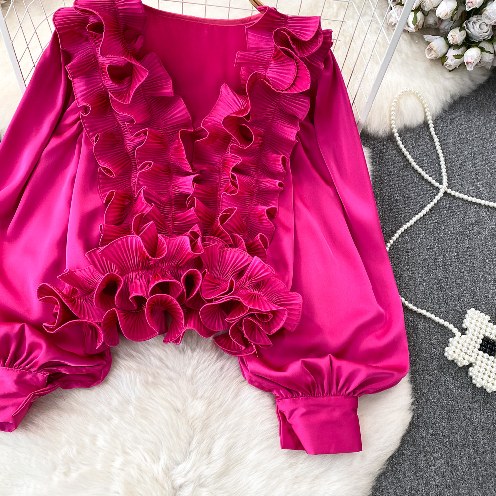 Фонарь, трехмерный лонгслив, рубашка для отдыха, в цветочек, V-образный вырез, свободный крой