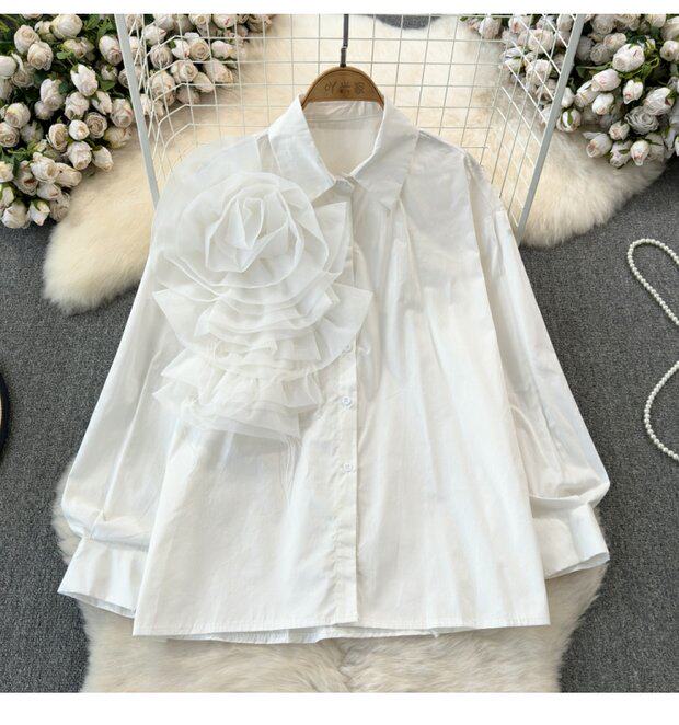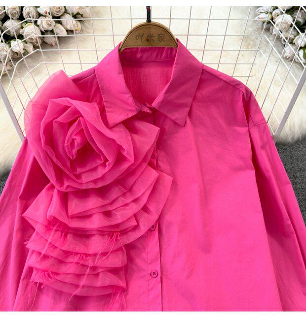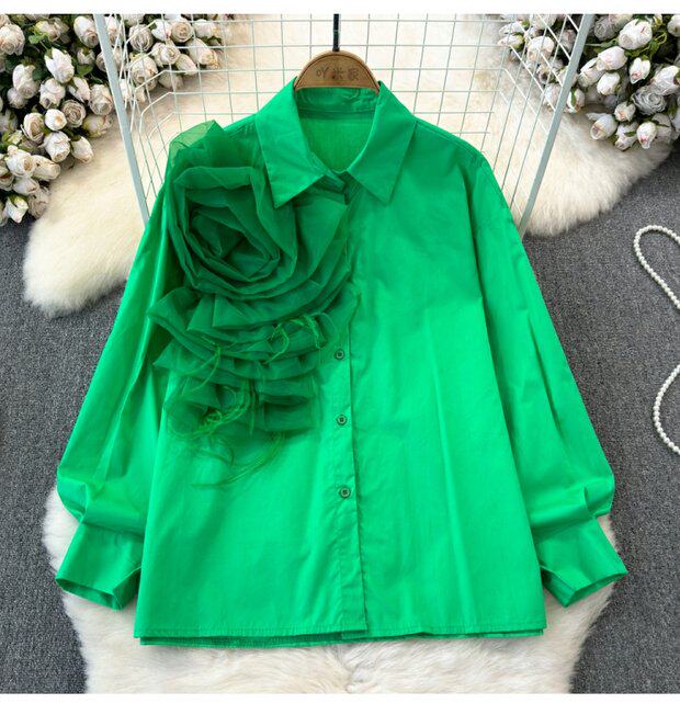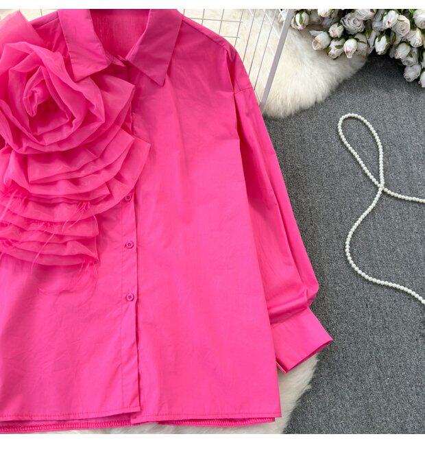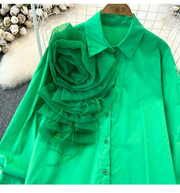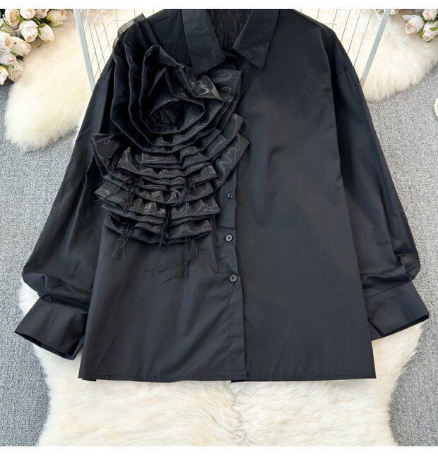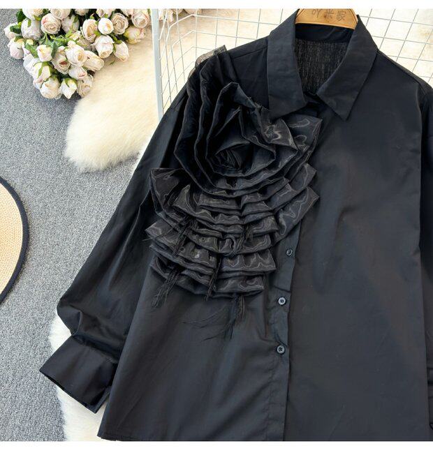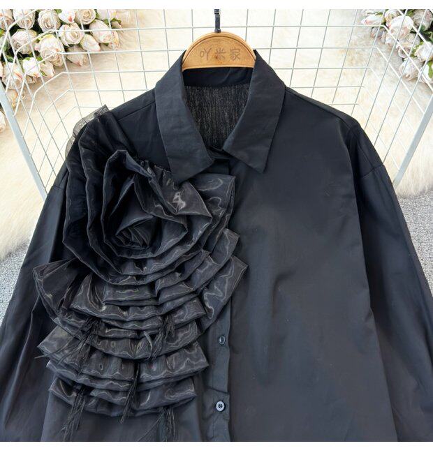 Модный дизайнерский трехмерный лонгслив, рубашка для отдыха, тренд сезона, в цветочек, воротник поло, свободный крой