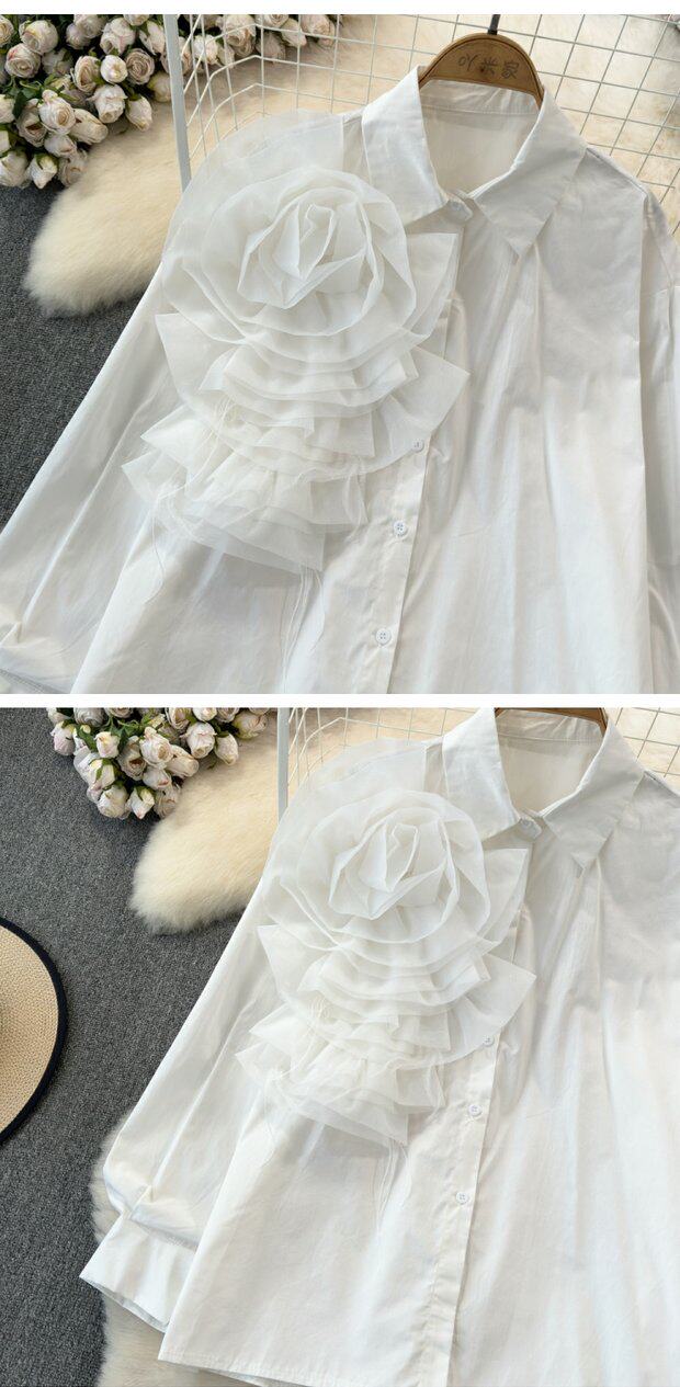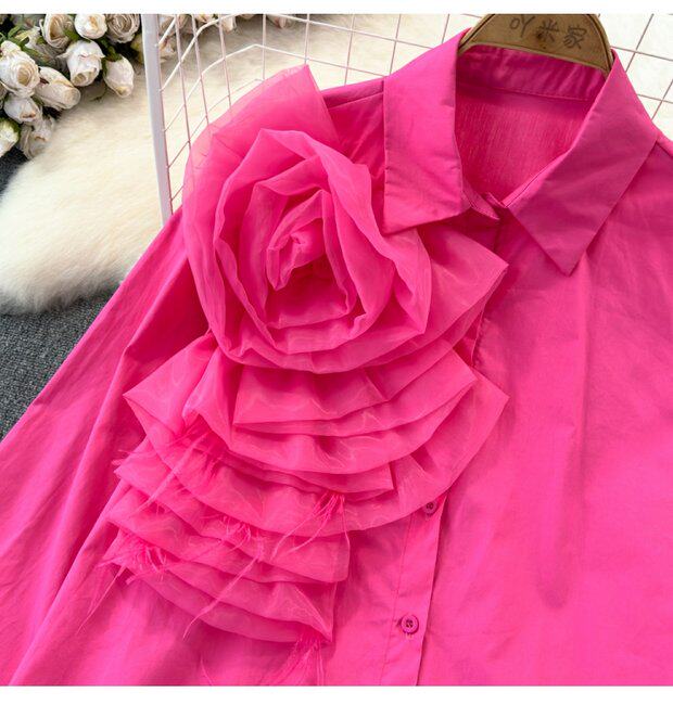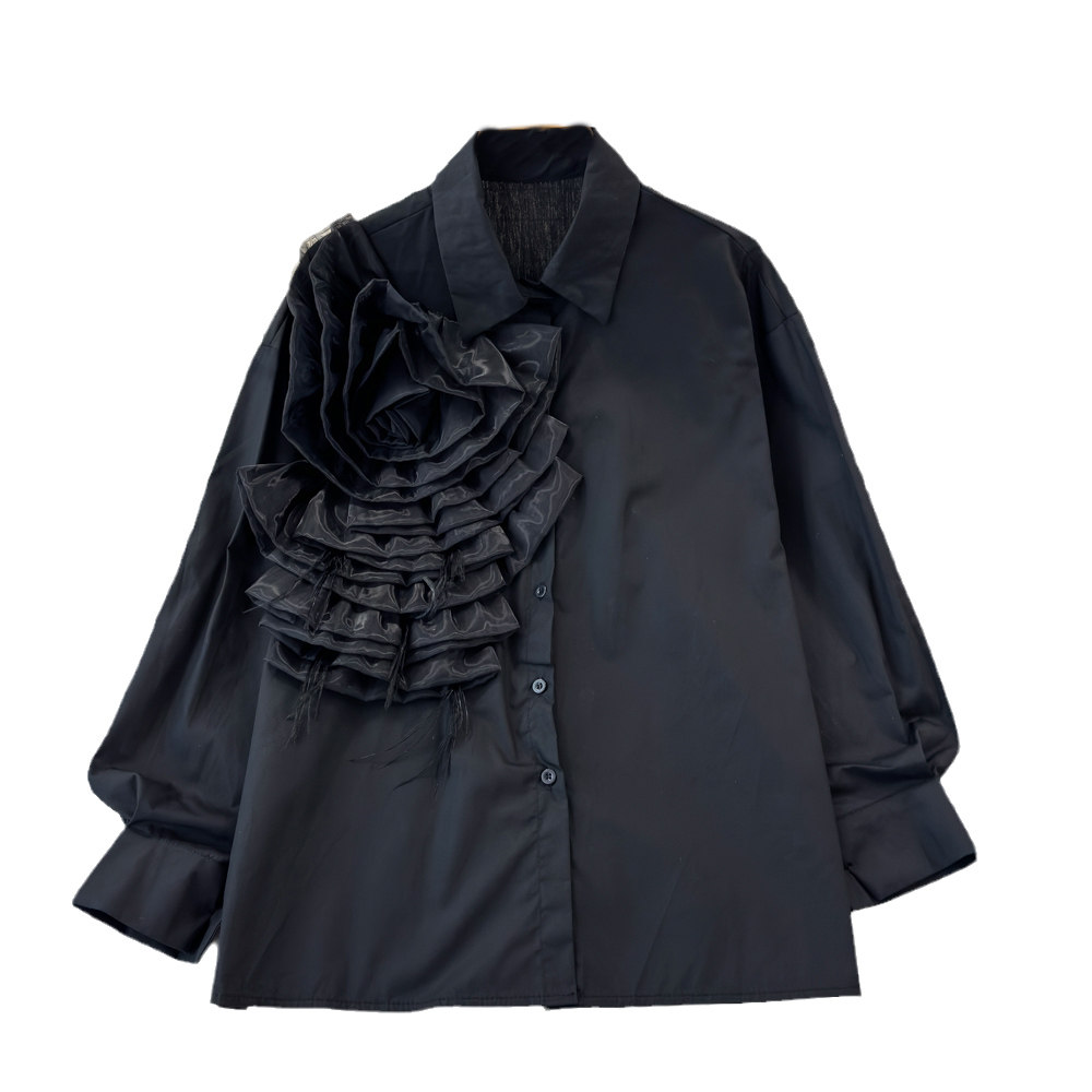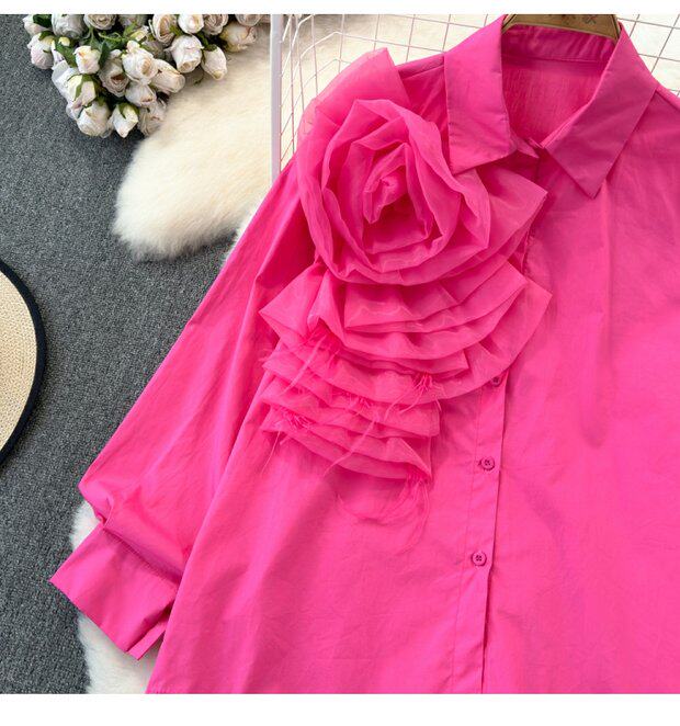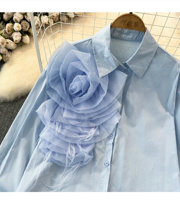 Модный дизайнерский трехмерный лонгслив, рубашка для отдыха, тренд сезона, в цветочек, воротник поло, свободный крой