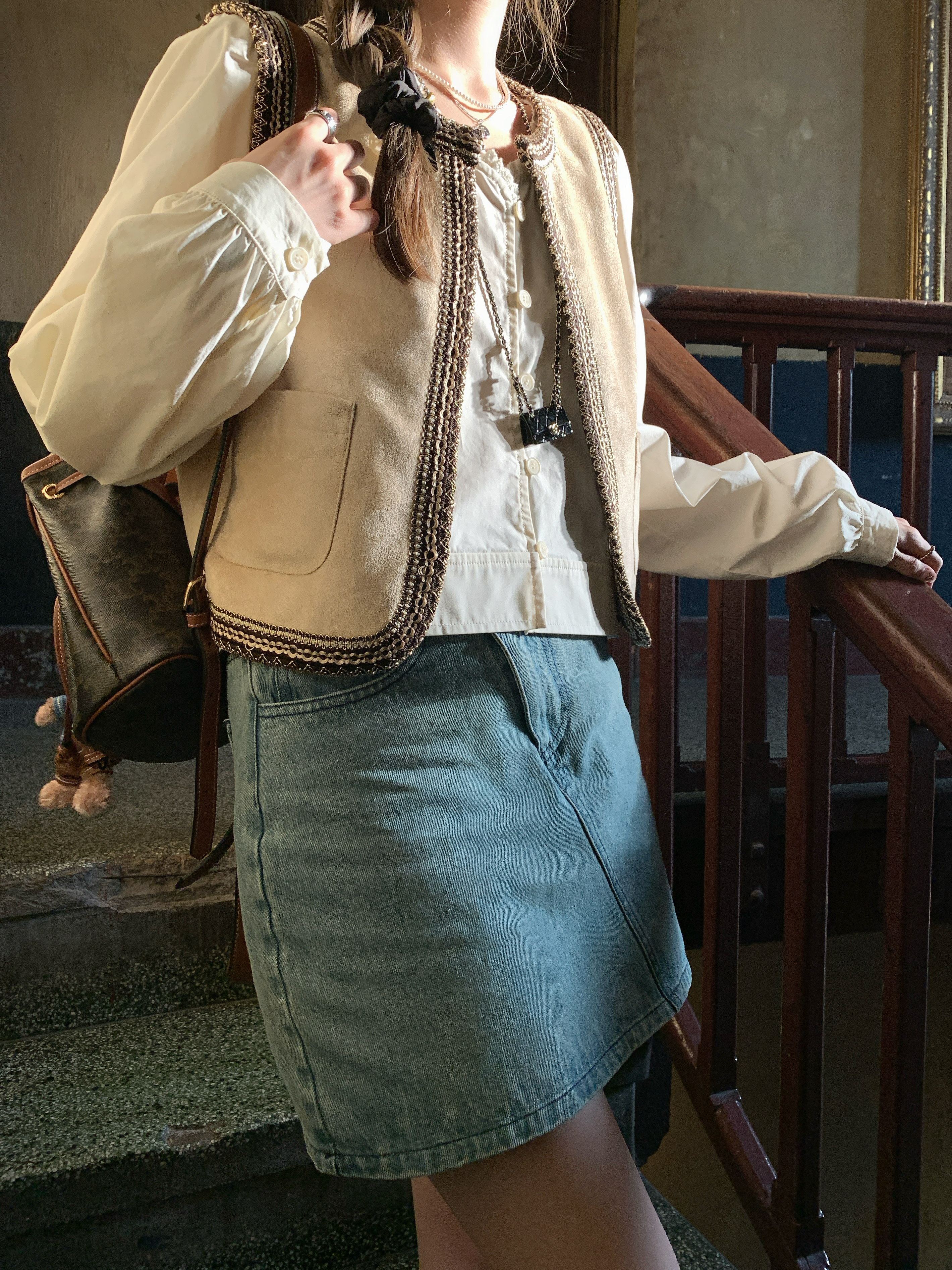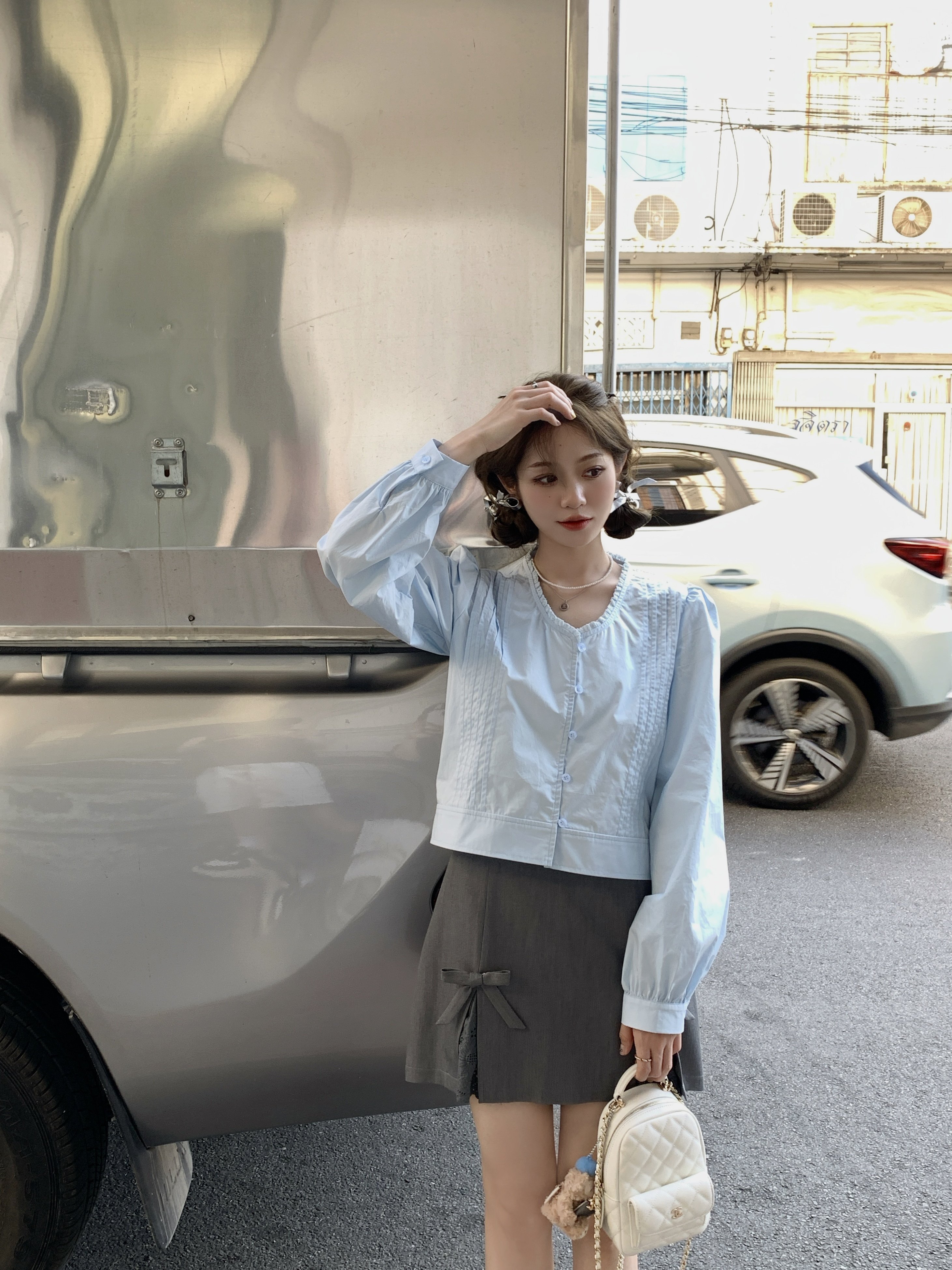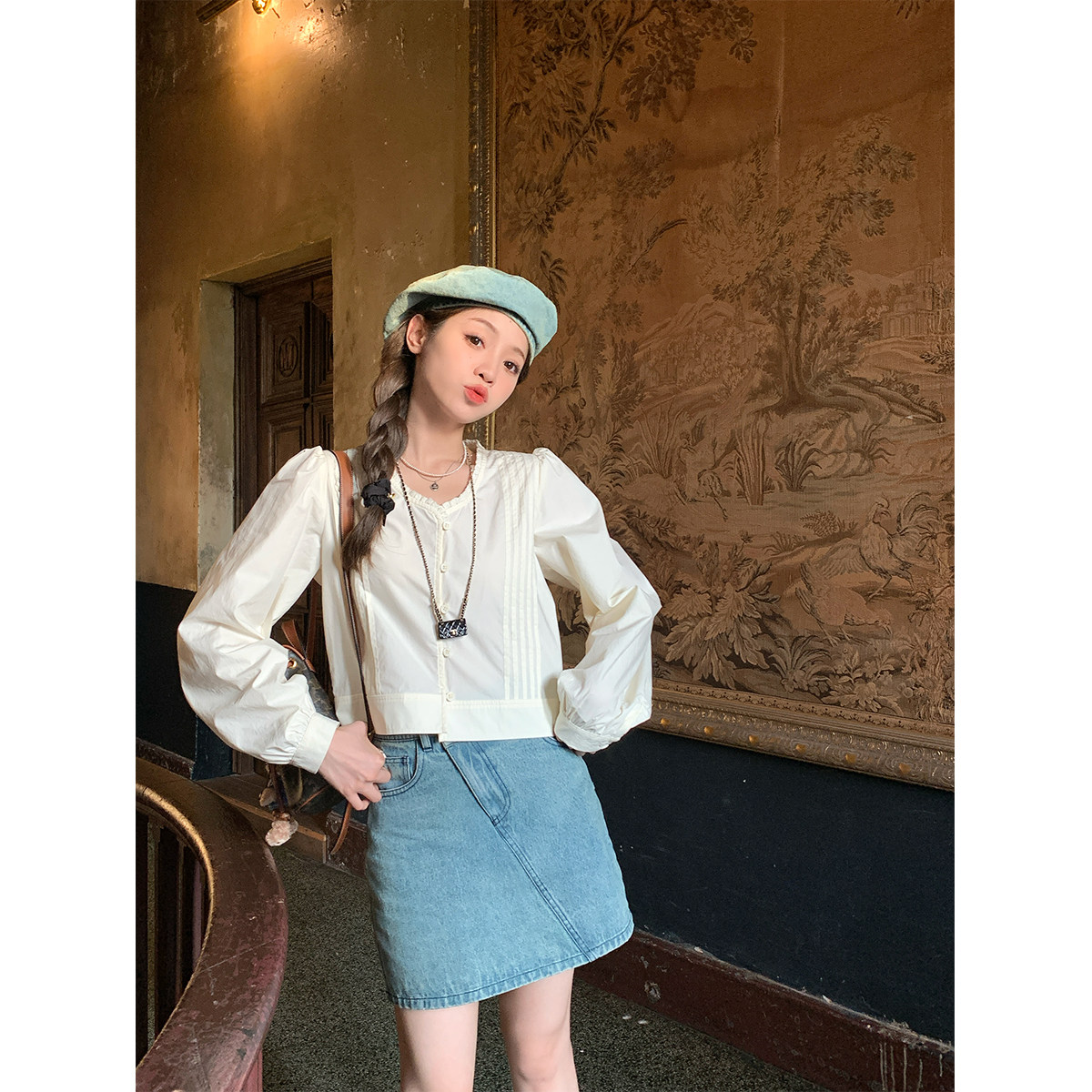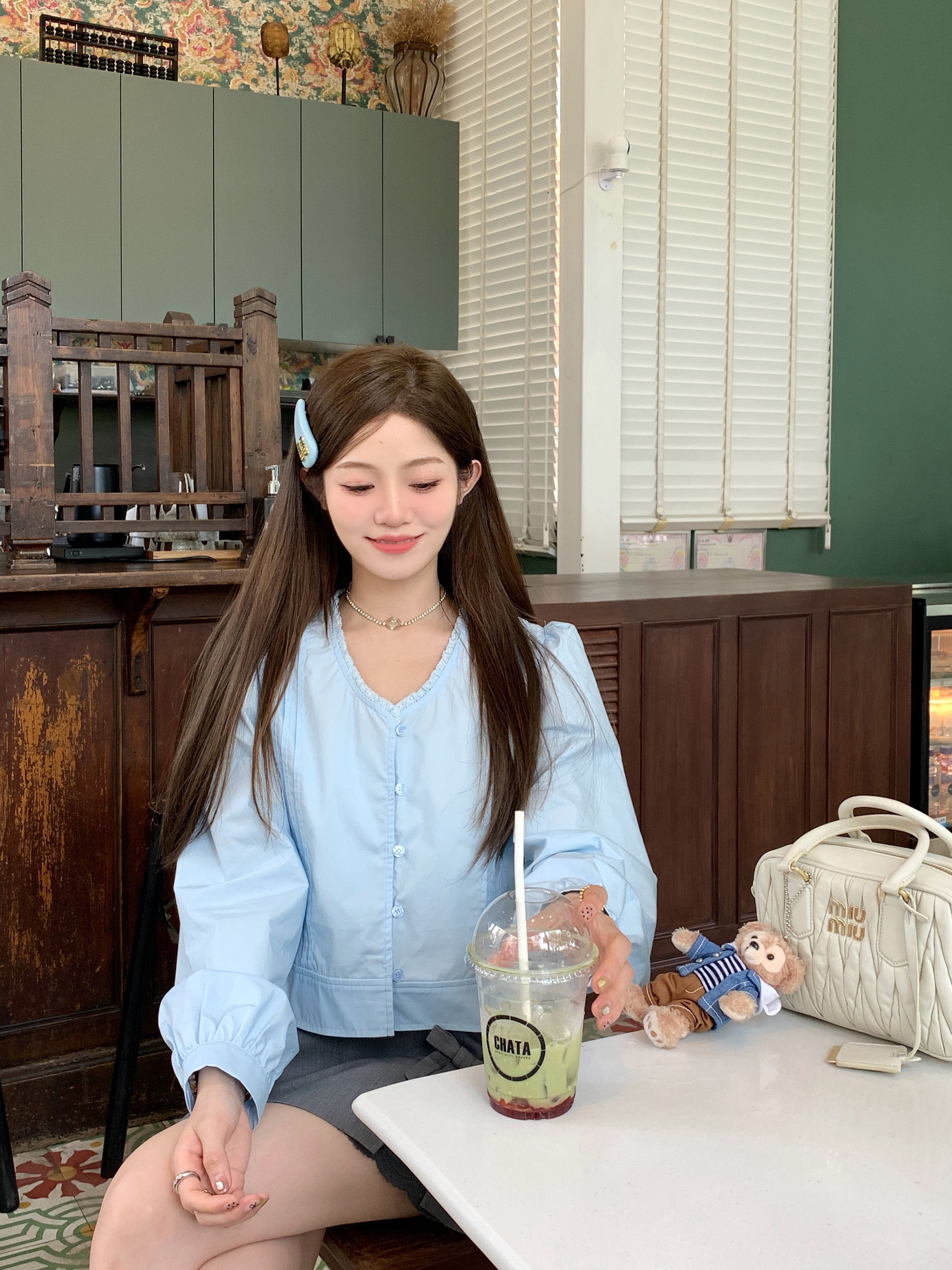 Голубая дочь Мадлен Корейская двухцветная кружевная рубашка с гленкой.