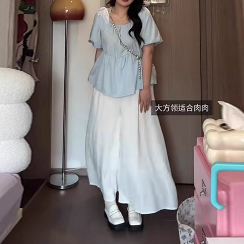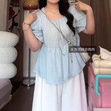 Летняя милая дизайнерская рубашка, большой размер, рукава фонарики, тренд сезона, квадратный вырез