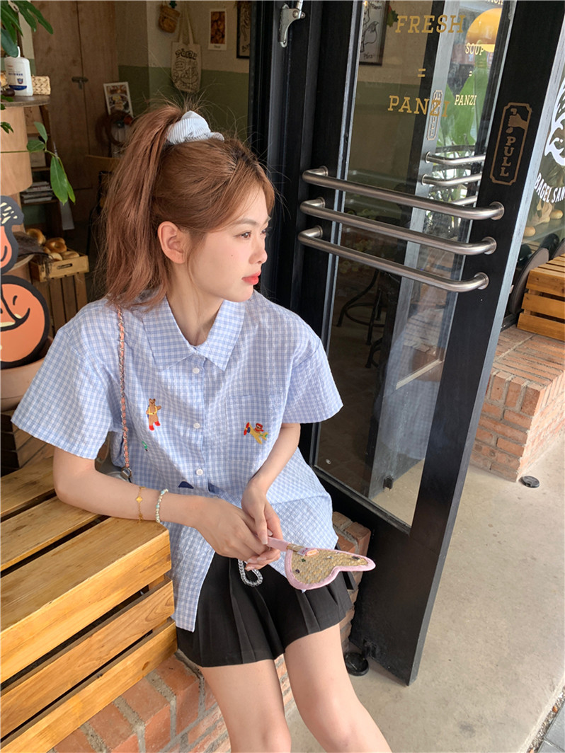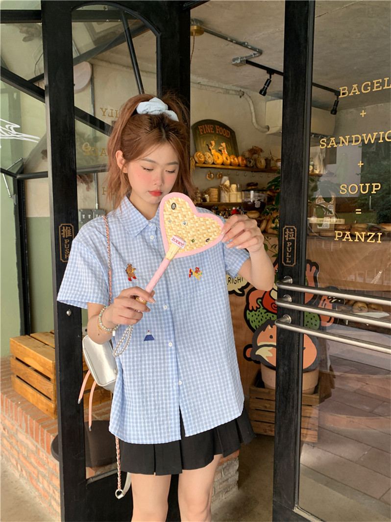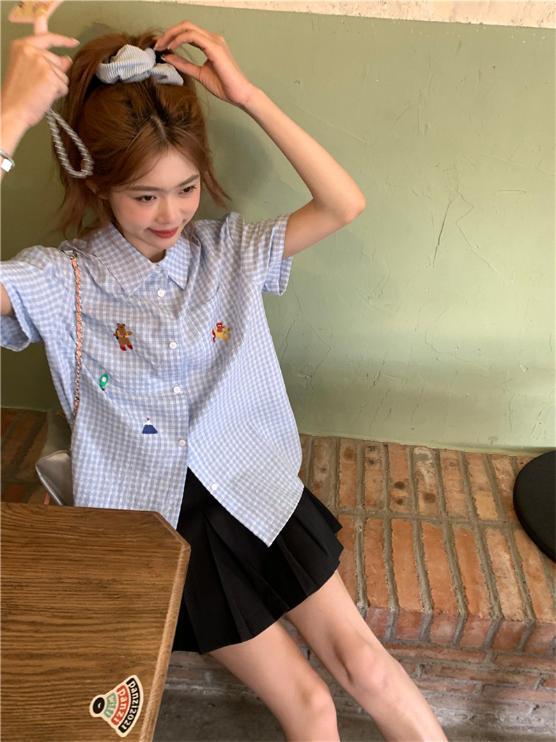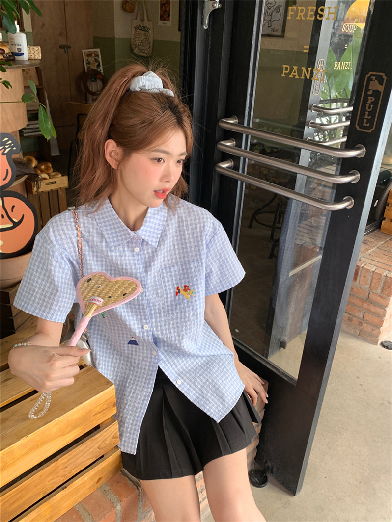 Синяя летняя рубашка, воротник поло, с вышивкой