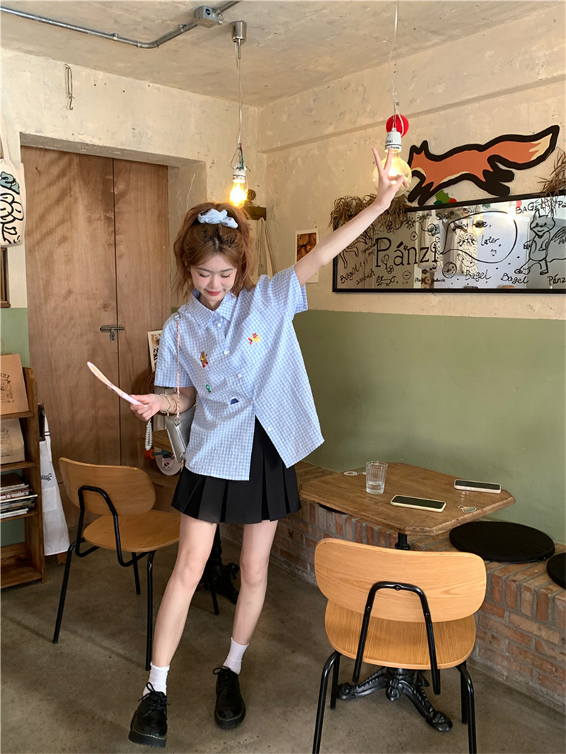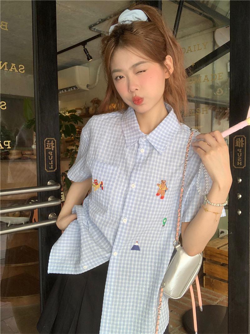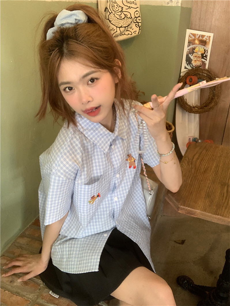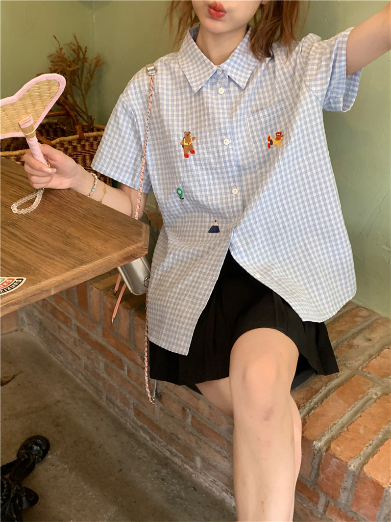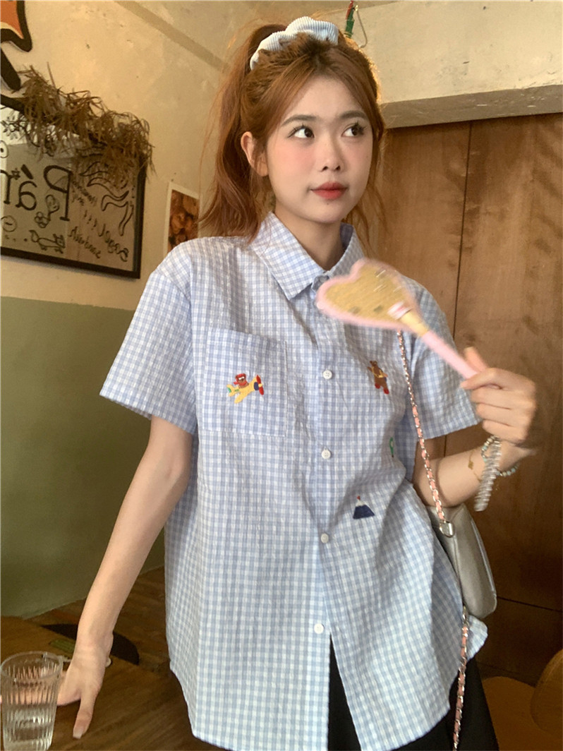 Синяя летняя рубашка, воротник поло, с вышивкой