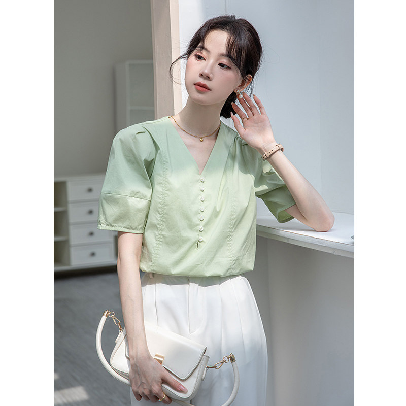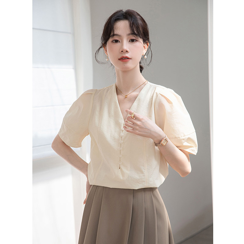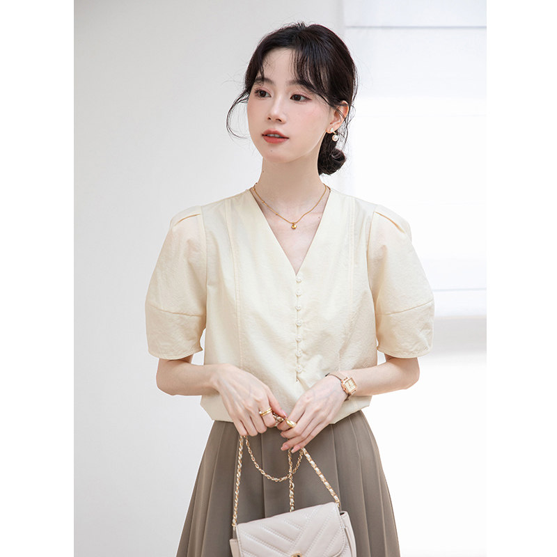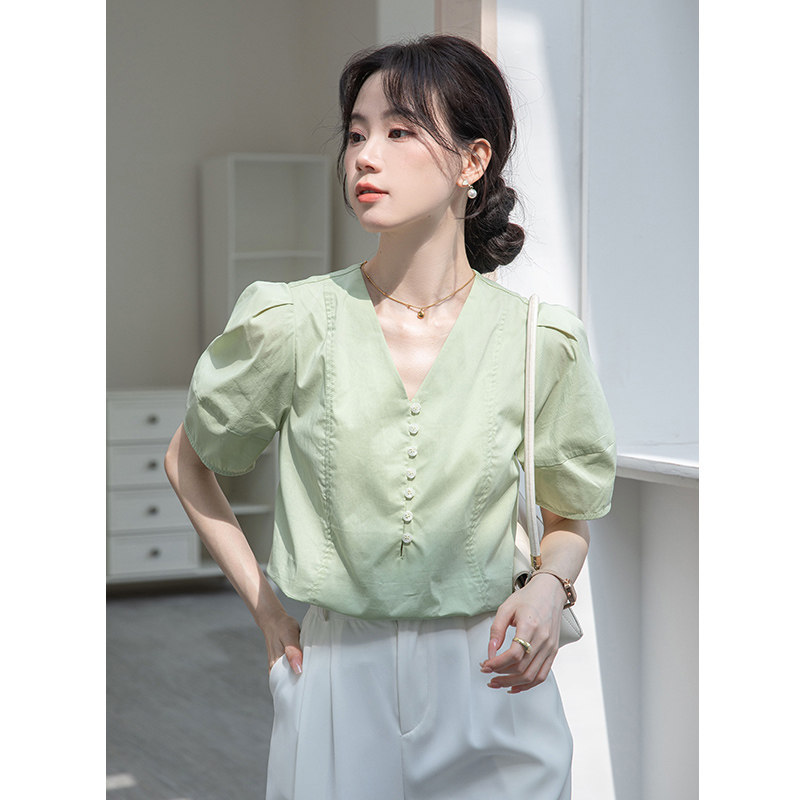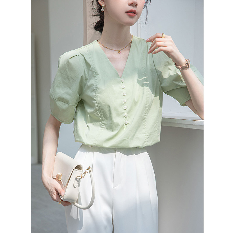 Дизайнерская летняя атмосферная рубашка, французский стиль, V-образный вырез, рукава фонарики