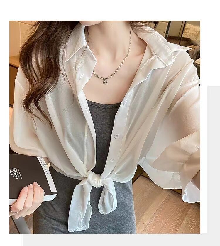 Белая весенняя летняя рубашка, дизайнерский тонкий кардиган, шифоновая куртка, защита от солнца, тренд сезона, с лямками