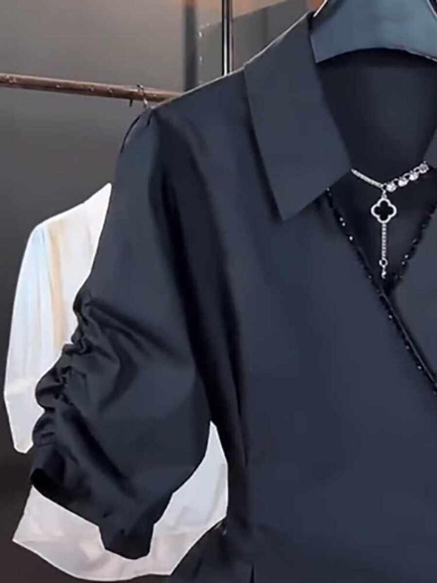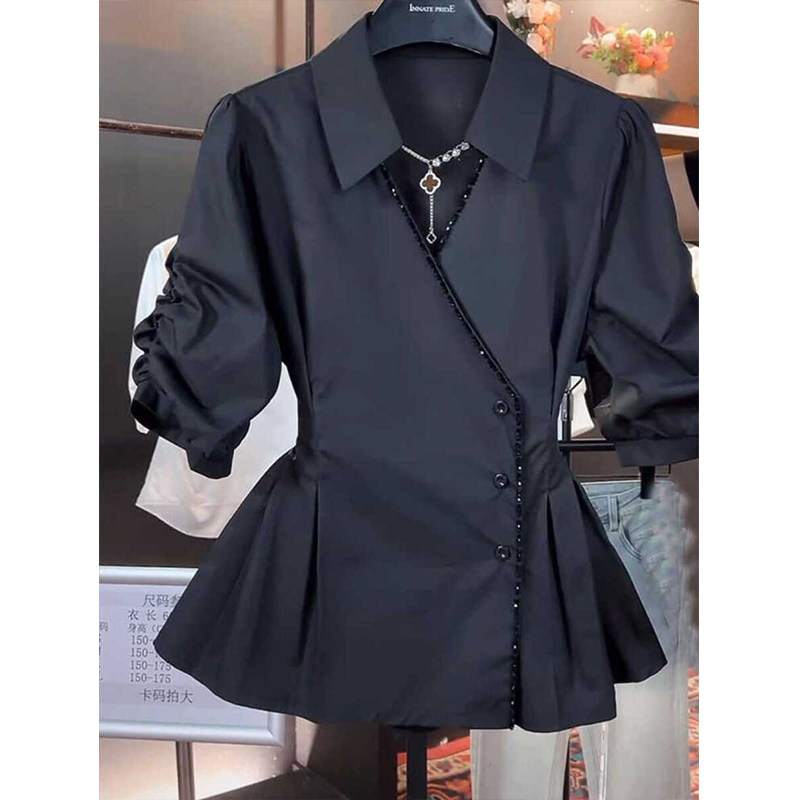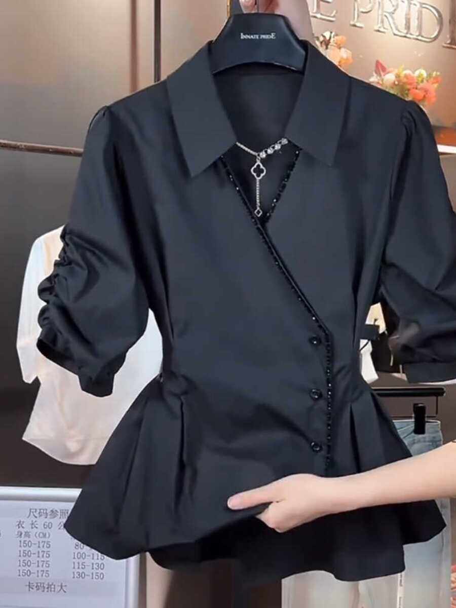 Черная рубашка, приталенный корсет, большой размер, французский стиль, изысканный стиль, V-образный вырез