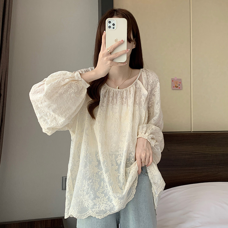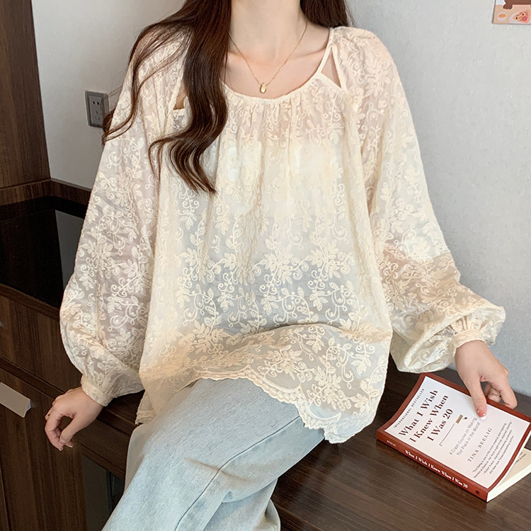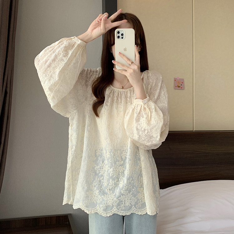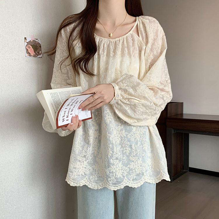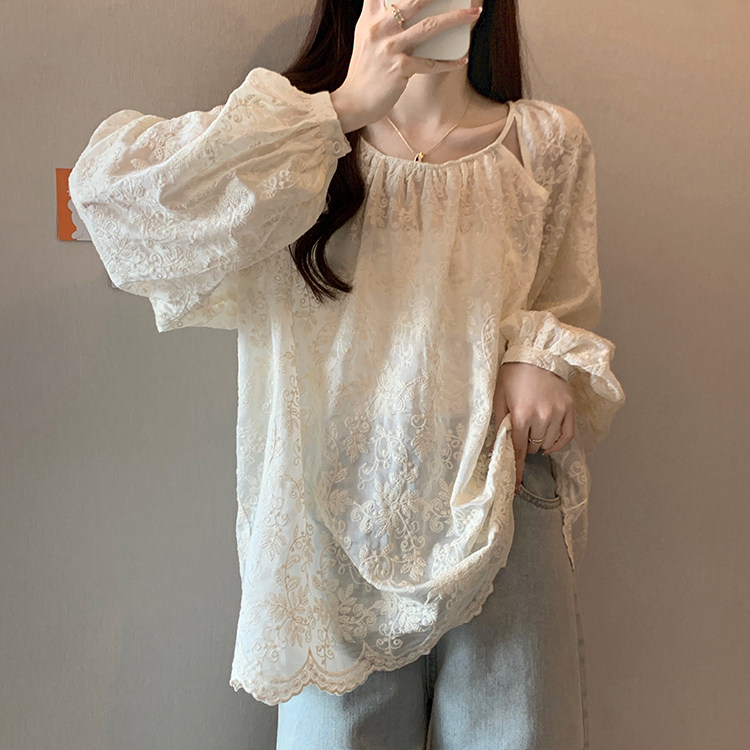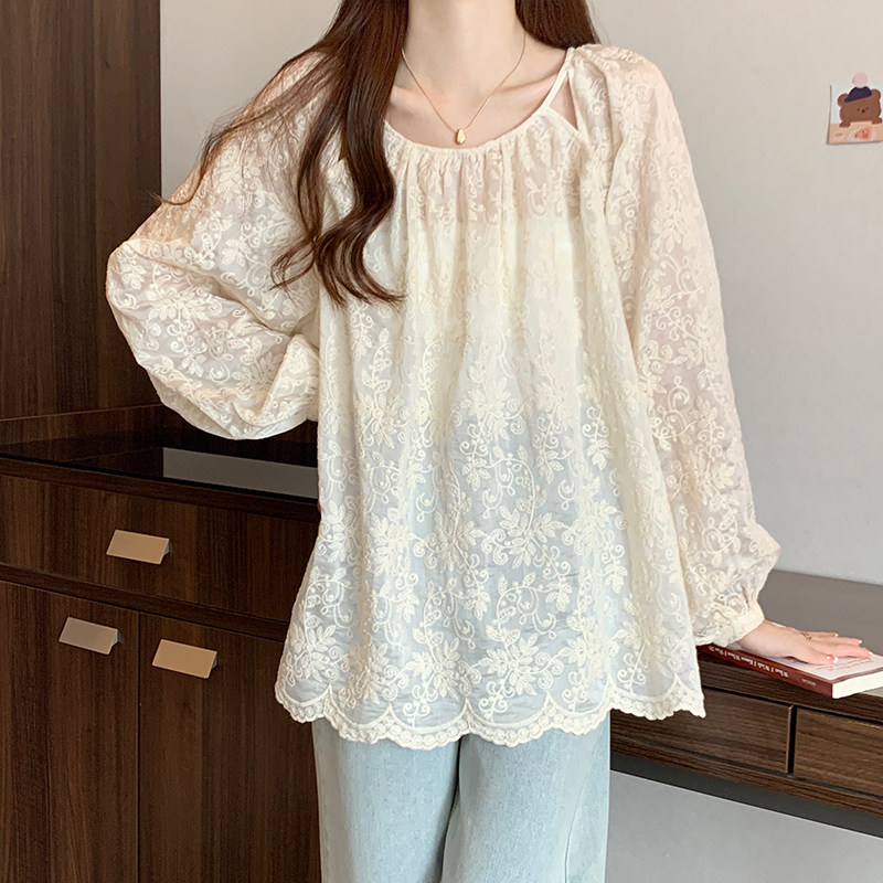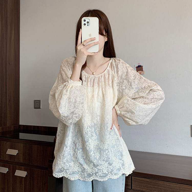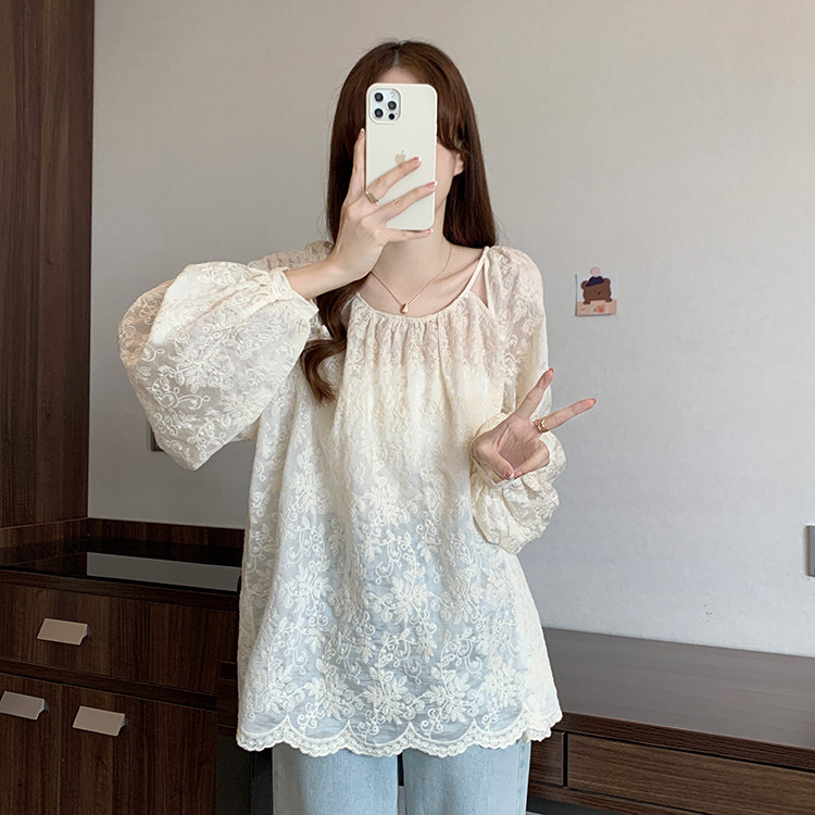 Кружевная длинная рубашка, в корейском стиле, с вышивкой, большой размер, средней длины