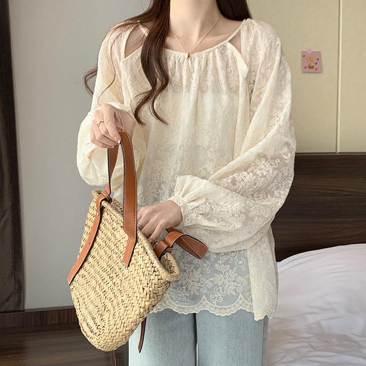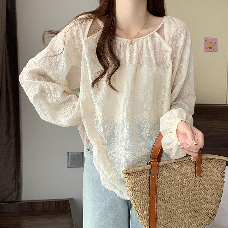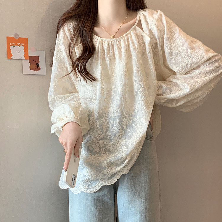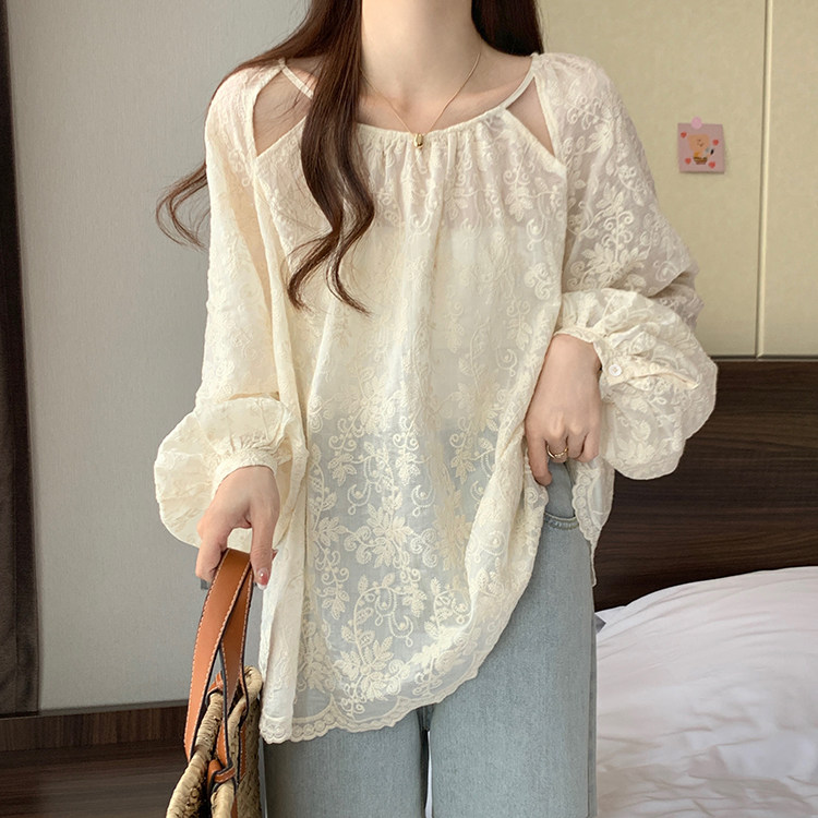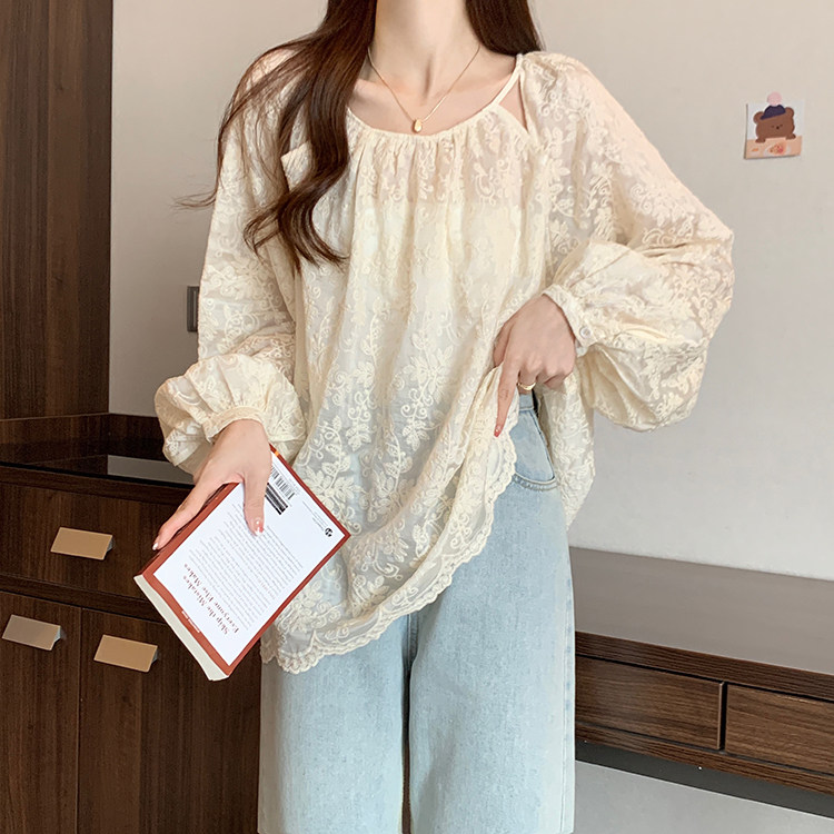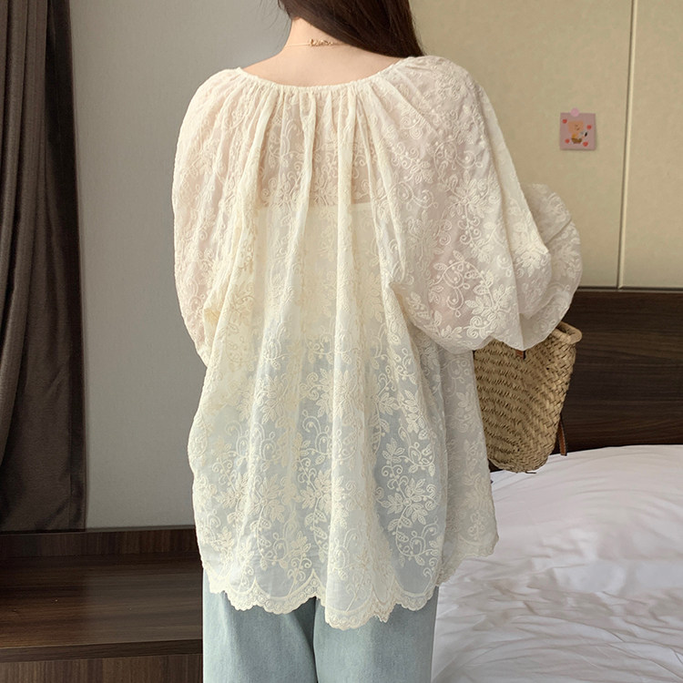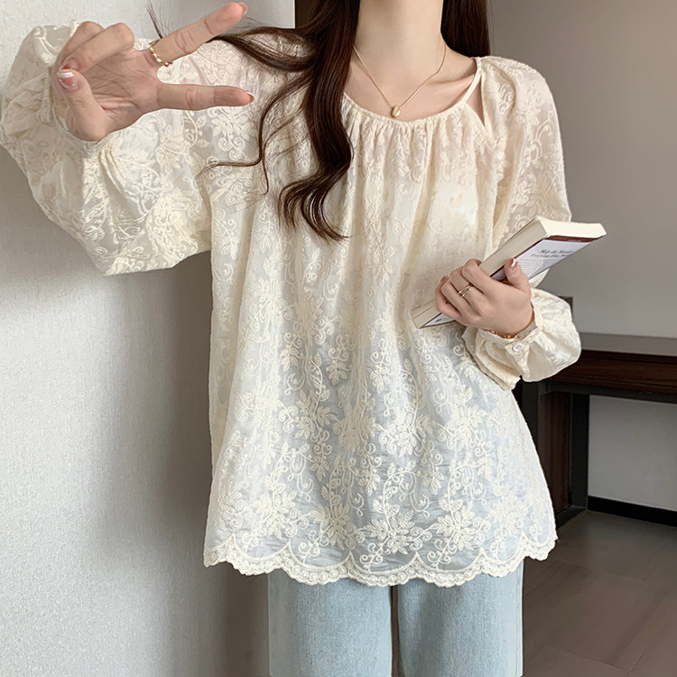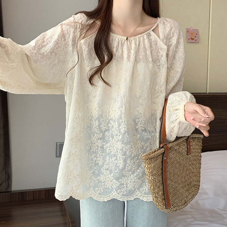 Кружевная длинная рубашка, в корейском стиле, с вышивкой, большой размер, средней длины