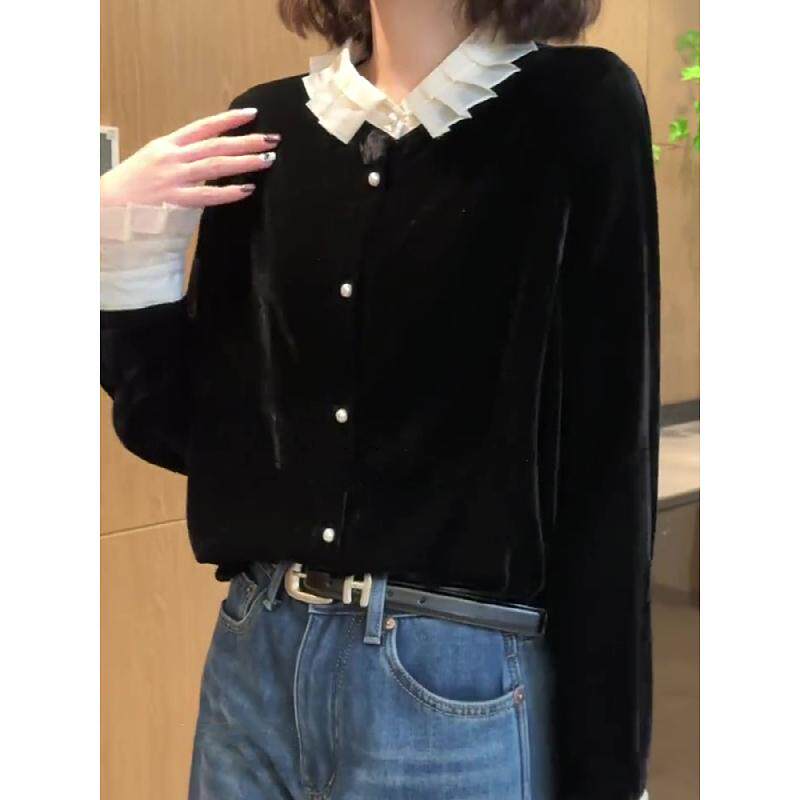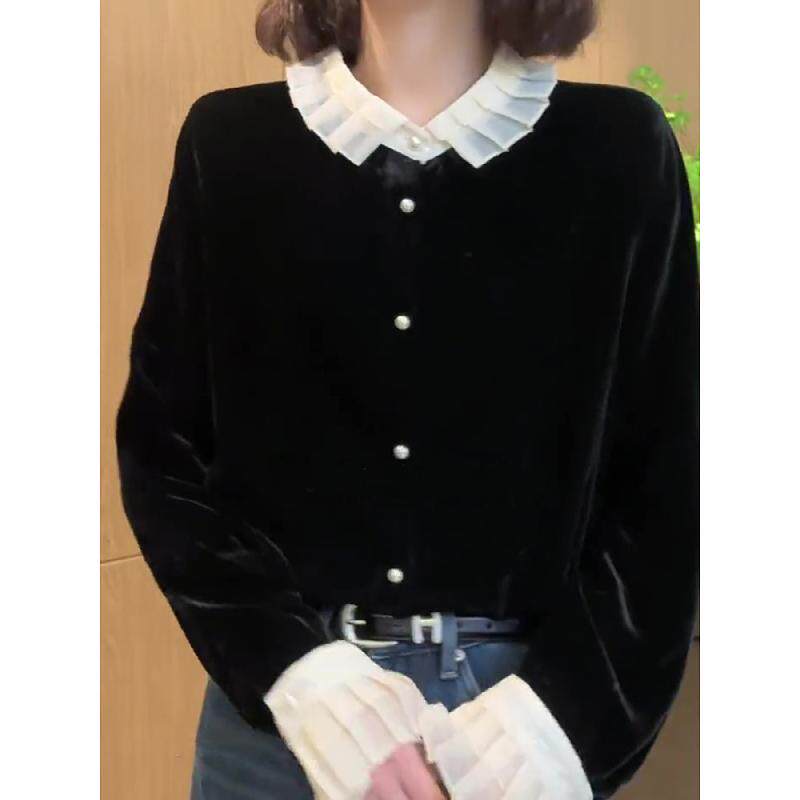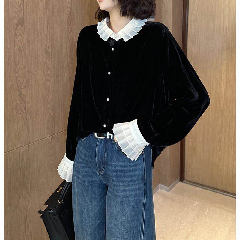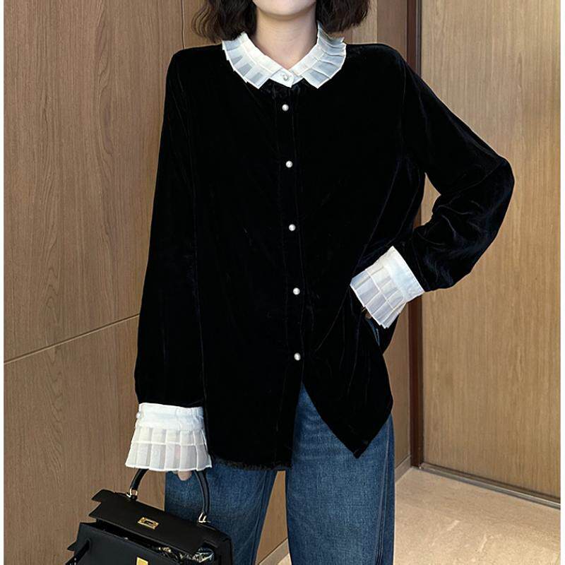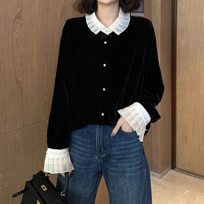Черная кукла, бархатная осенняя базовая приятная телу утеплённая рубашка, французский стиль, кукольный воротник, новая коллекция
