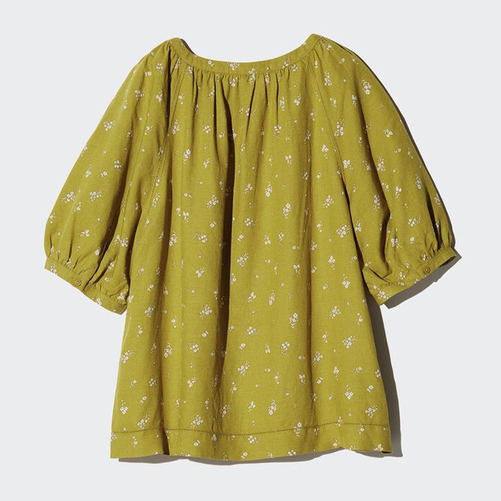 Uniqlo женская льняная футболка с объемными рукавами и принтом, рубашка с короткими рукавами, плиссированная 25, весна-лето, ретро 477604