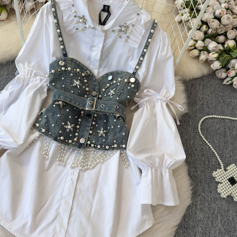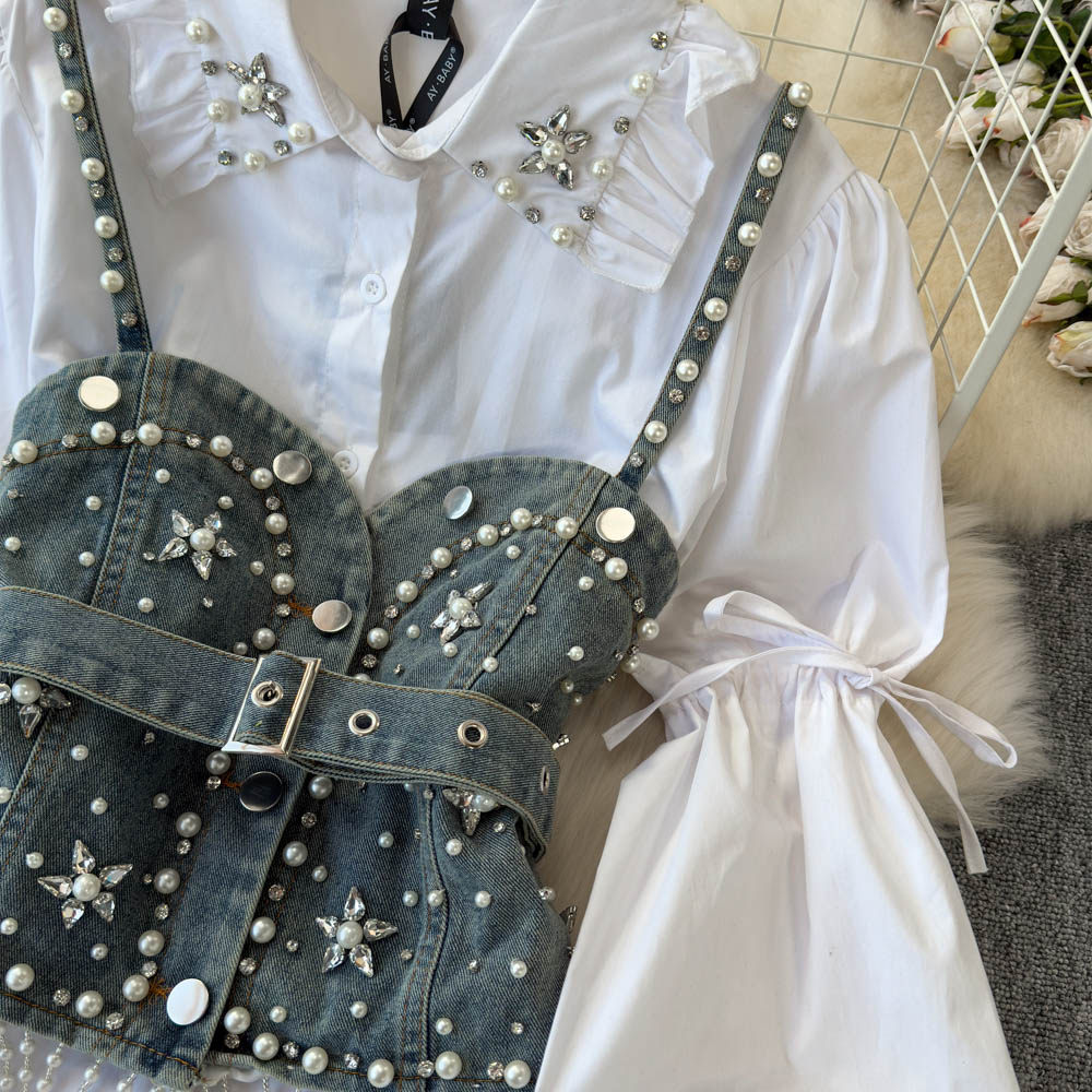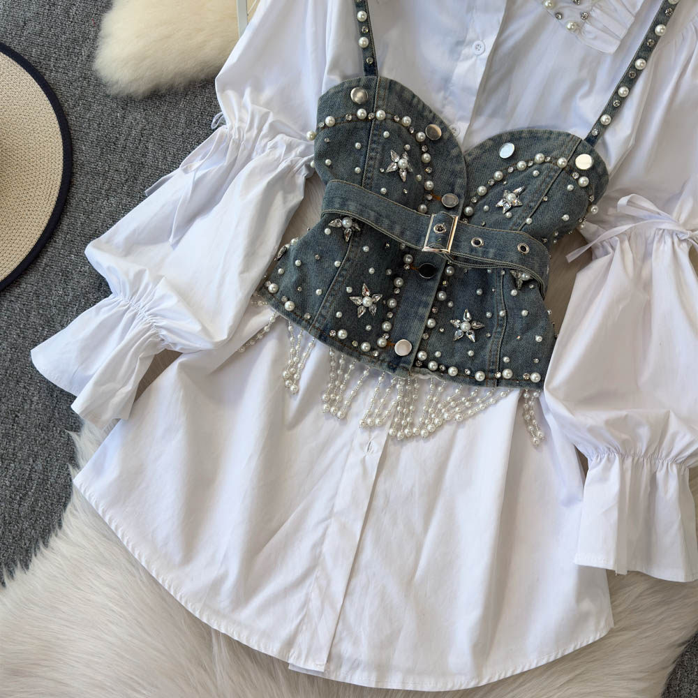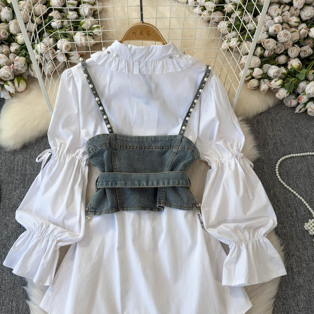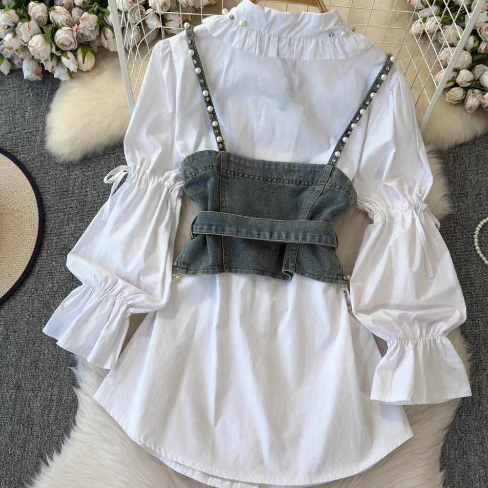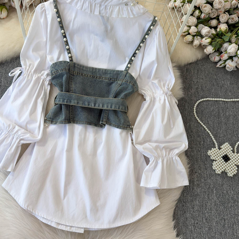 Ретро рубашка, фонарь, джинсовый топ с чашечками, комплект, с рукавом