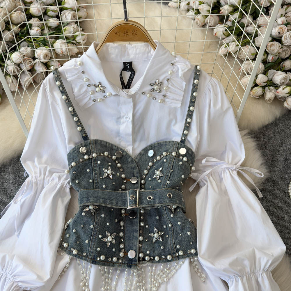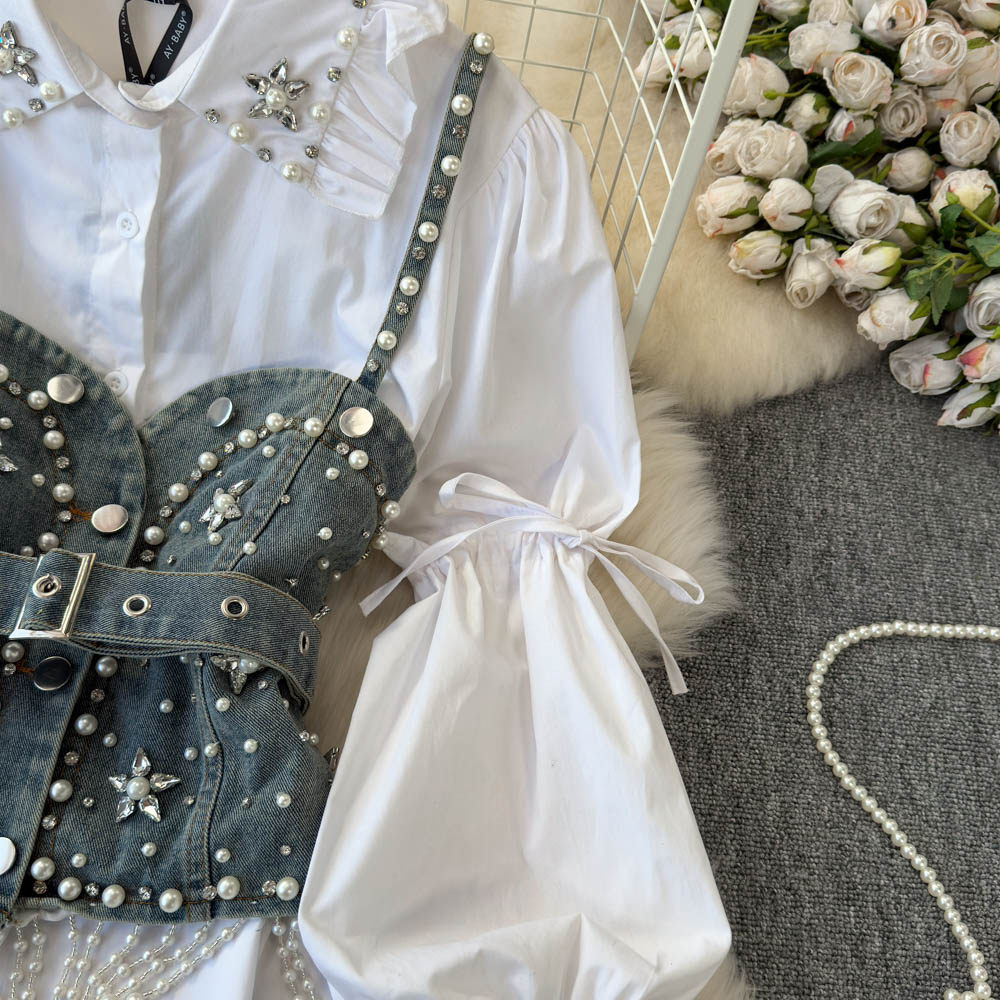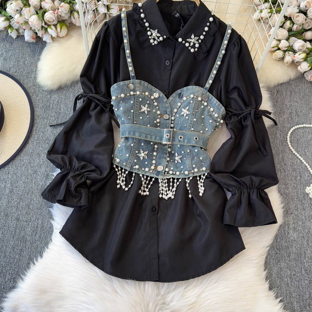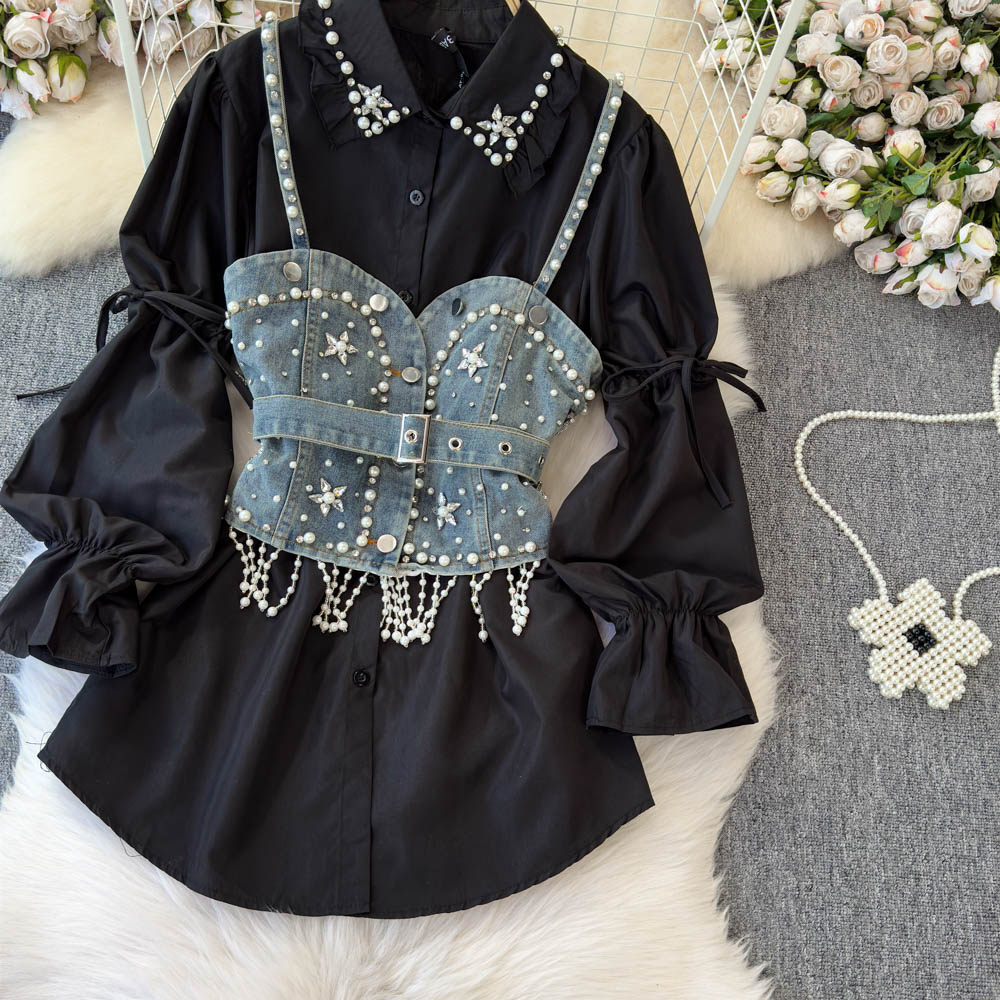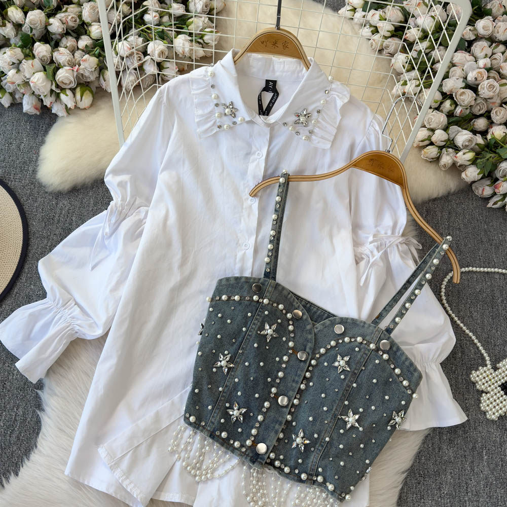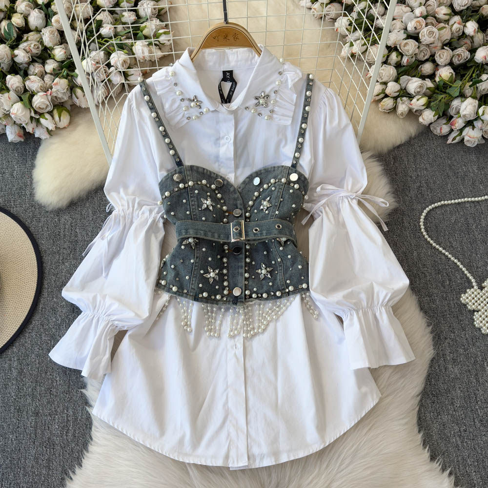 Ретро рубашка, фонарь, джинсовый топ с чашечками, комплект, с рукавом