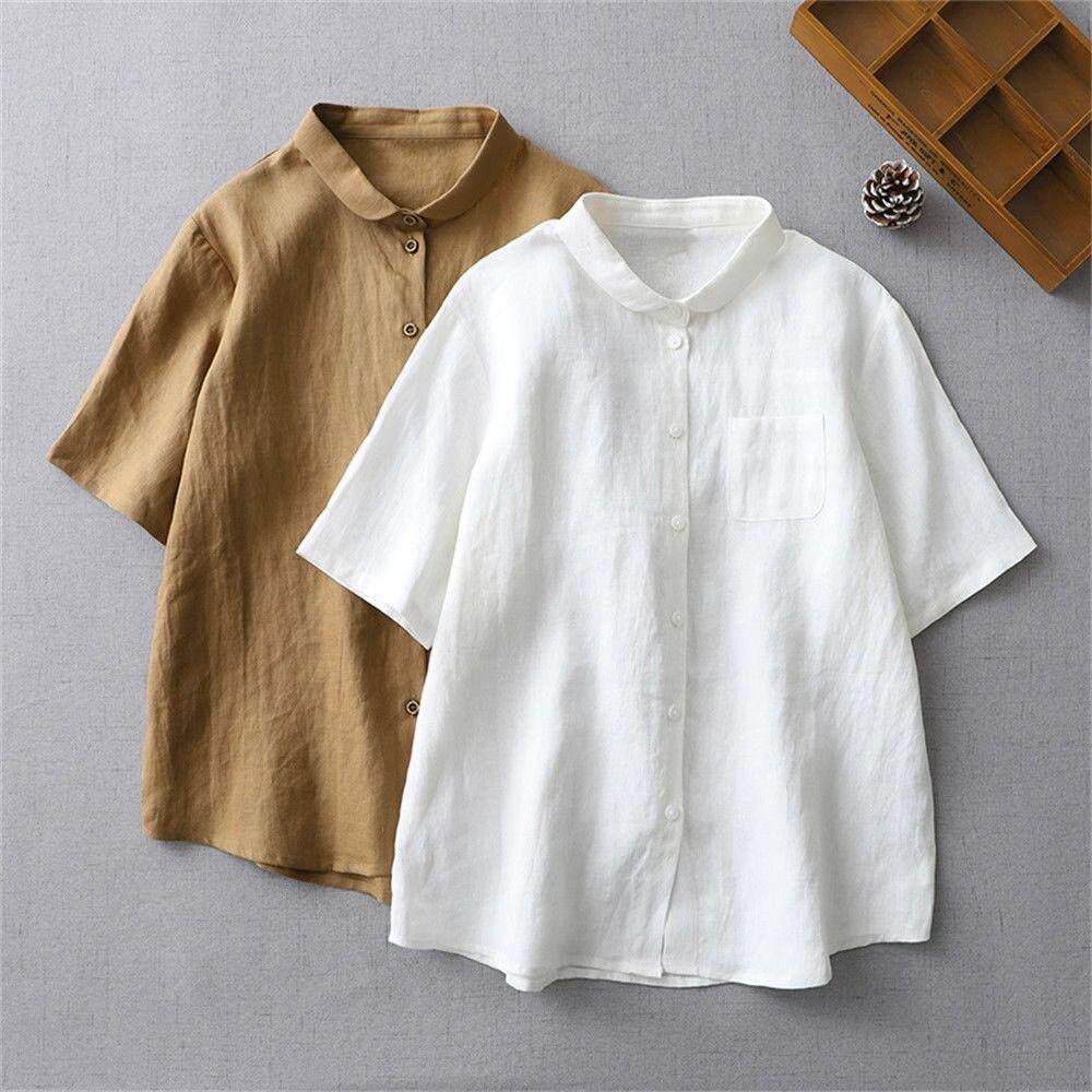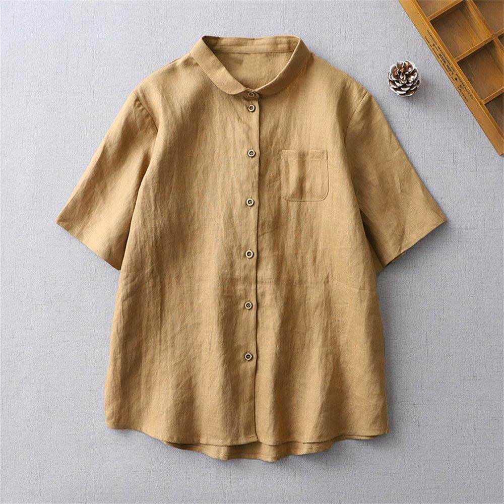 Летняя ретро рубашка, короткий рукав, свободный крой, из хлопка и льна