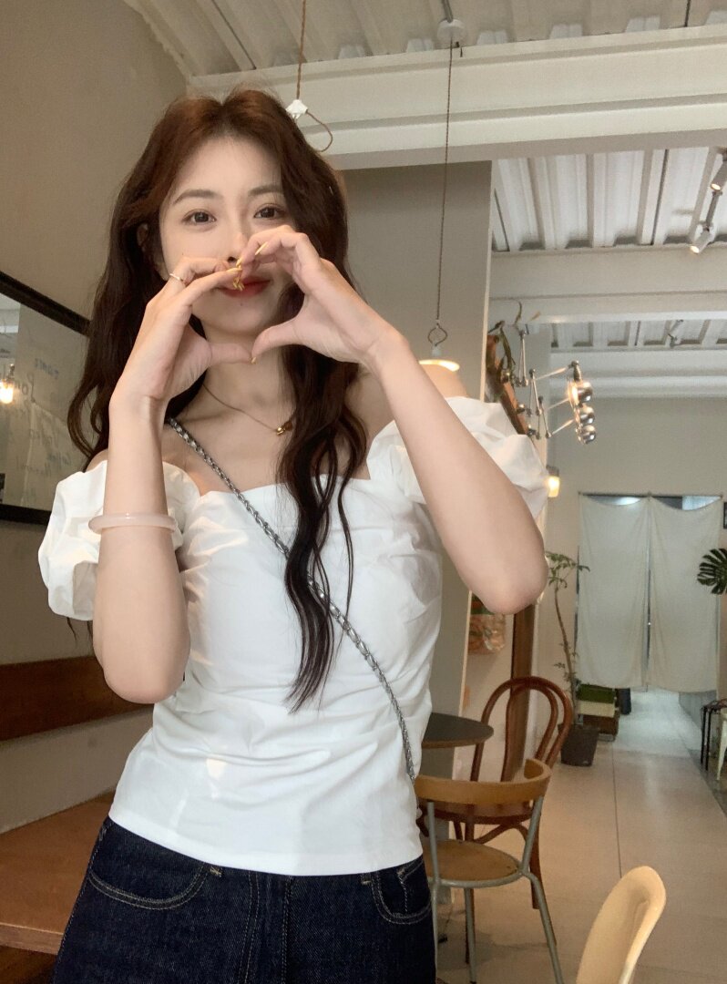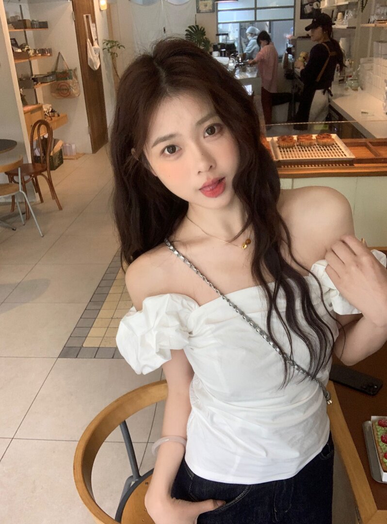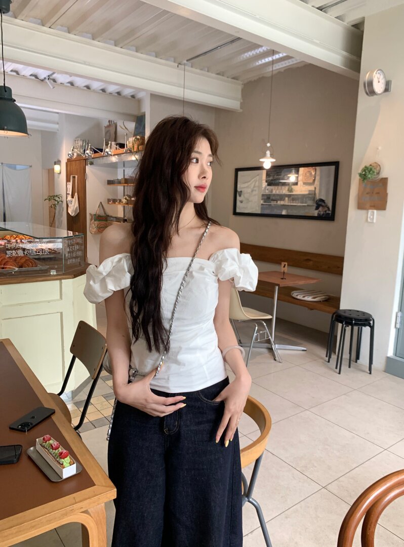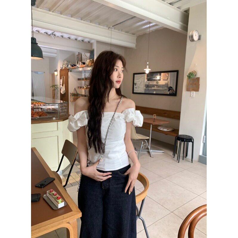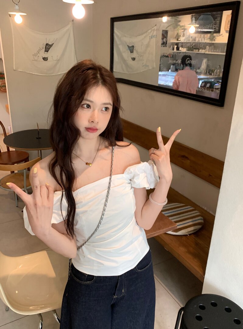 Белая летняя милая приталенная дизайнерская рубашка, открытые плечи, тренд сезона