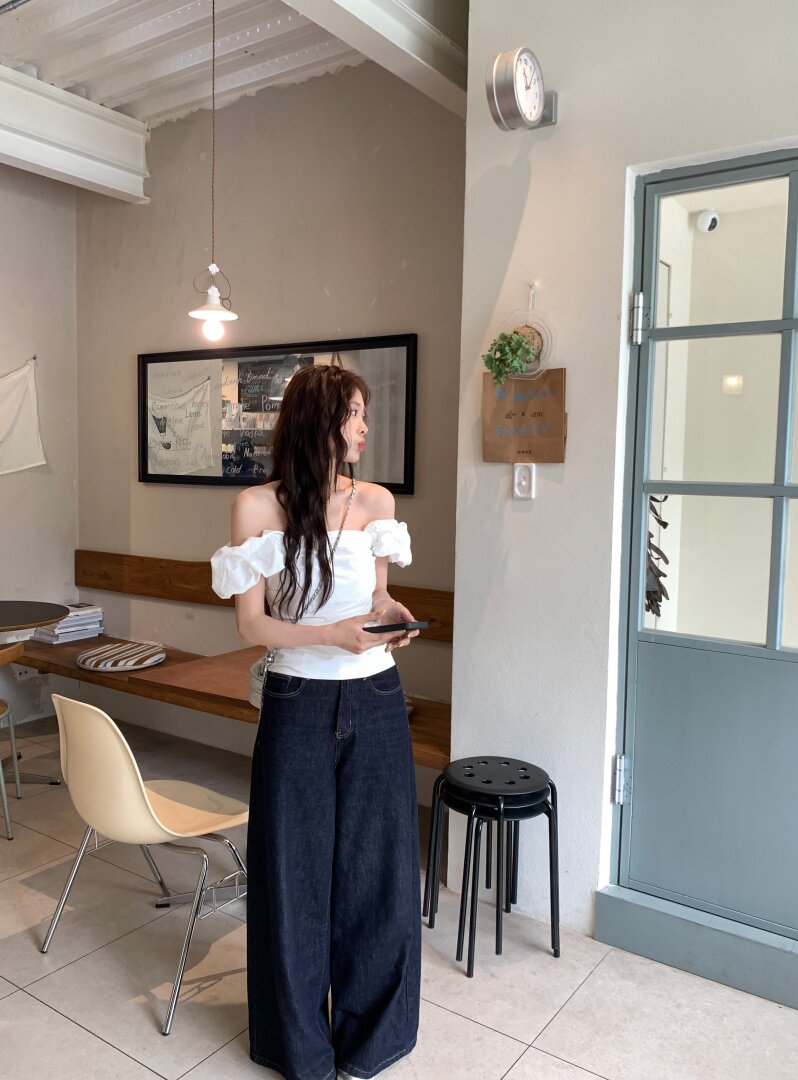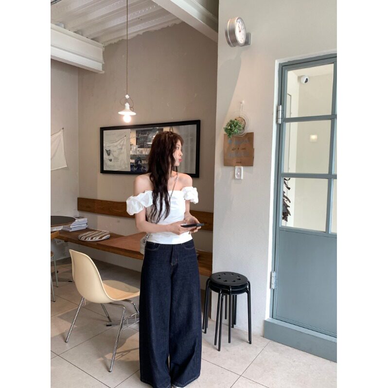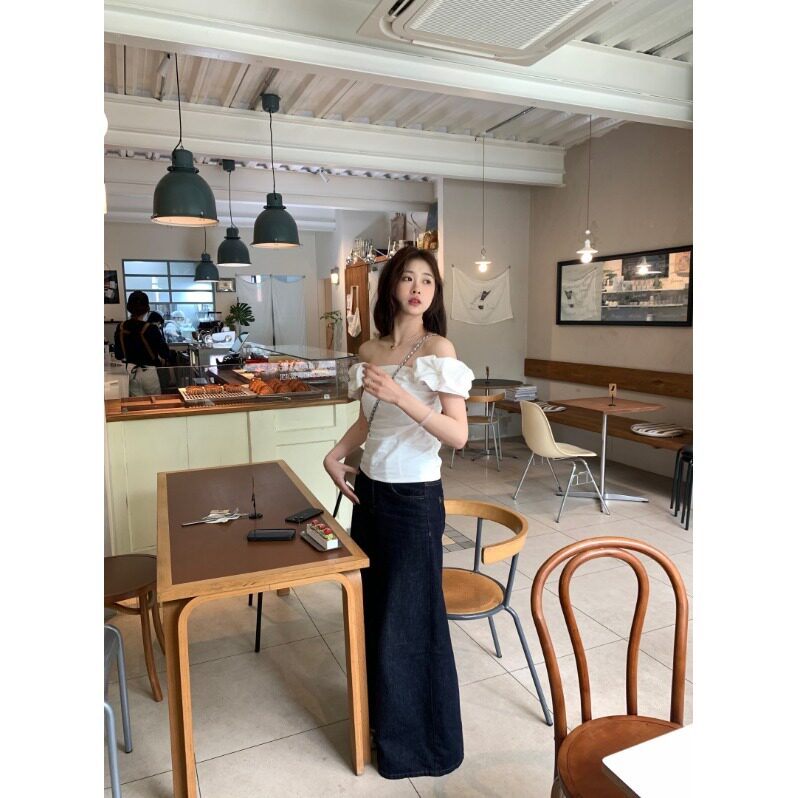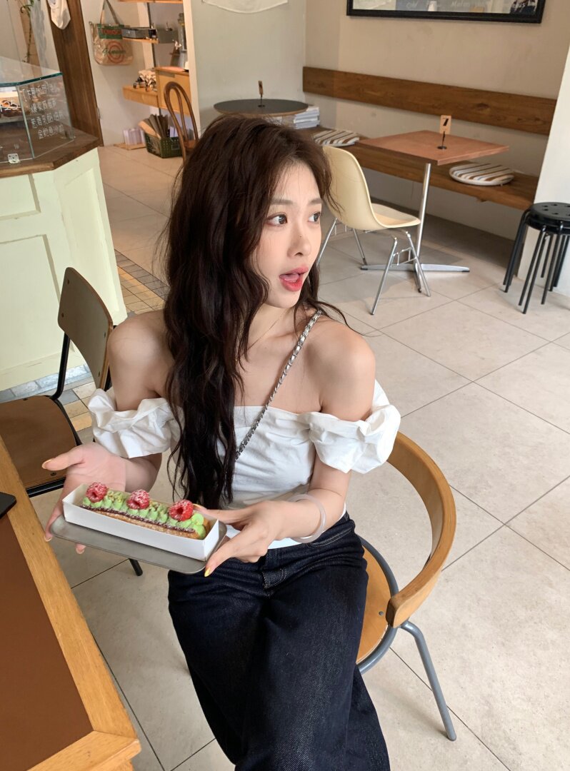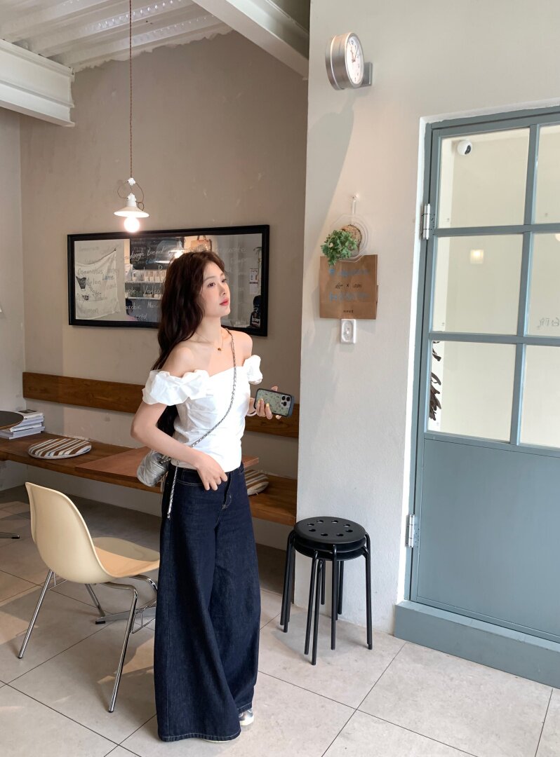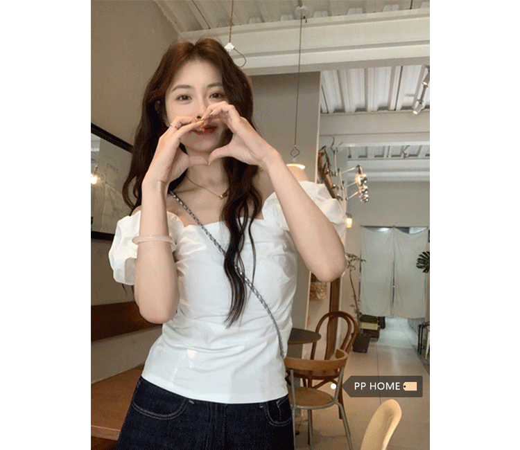 Белая летняя милая приталенная дизайнерская рубашка, открытые плечи, тренд сезона