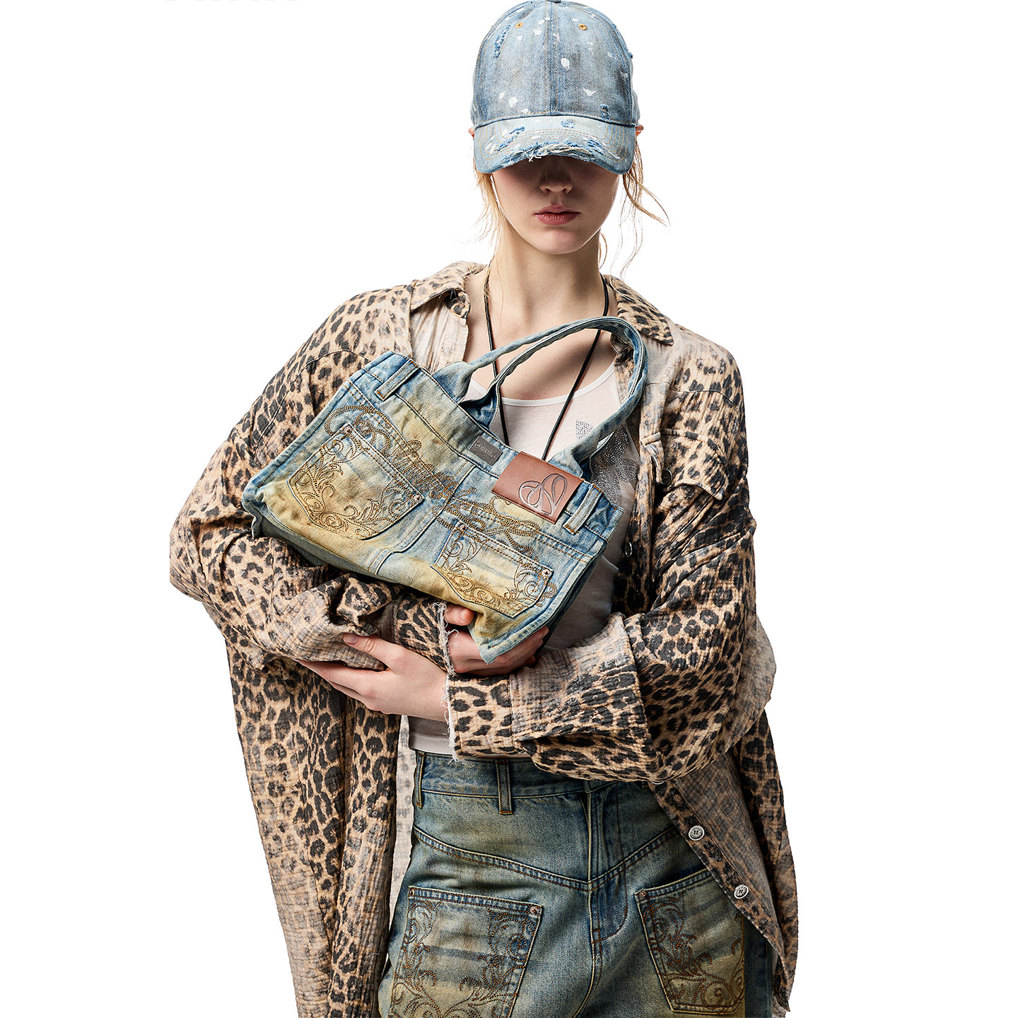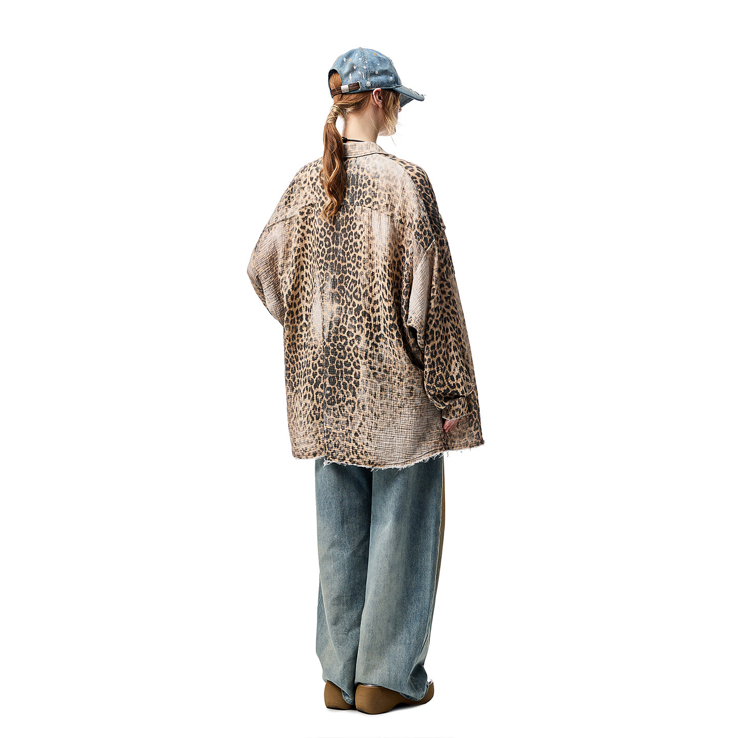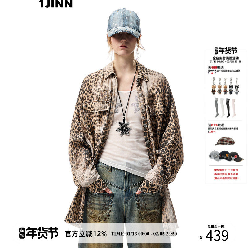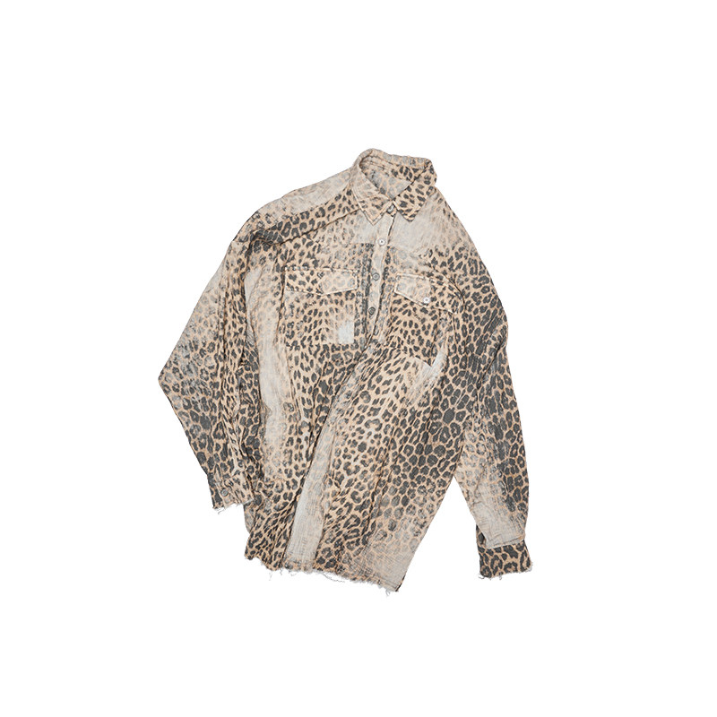 [Тот же стиль, что и звезды] 1JINN STUDIO Рубашка в стиле ретро с потертостями и леопардовым принтом в американском стиле с необработанными краями