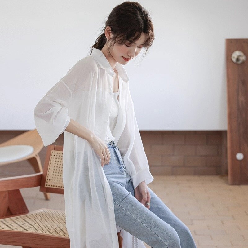 Длинная рубашка, летний лонгслив, топ с чашечками, майка топ, шелковая накидка, средней длины, защита от солнца
