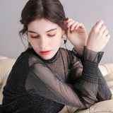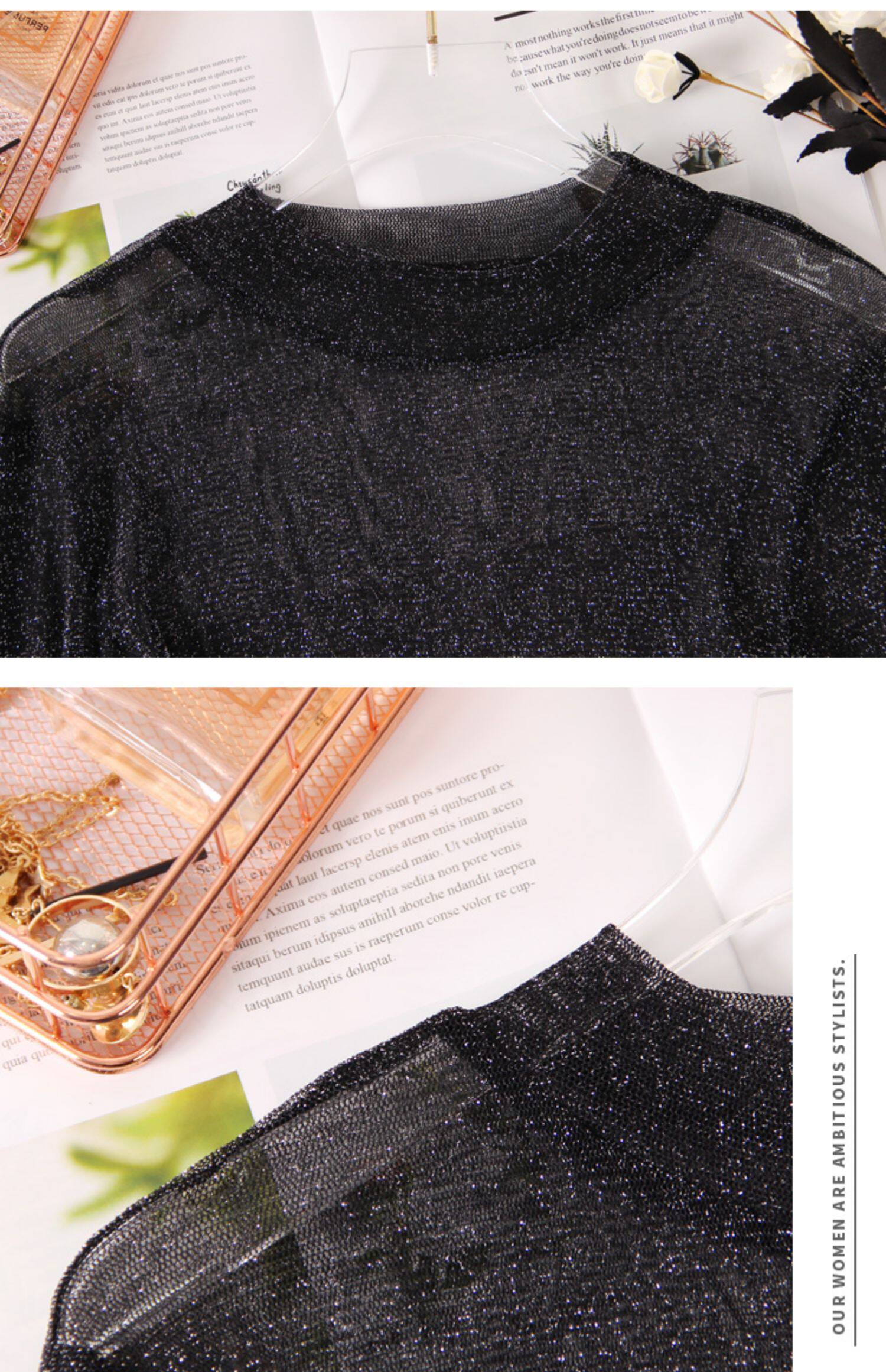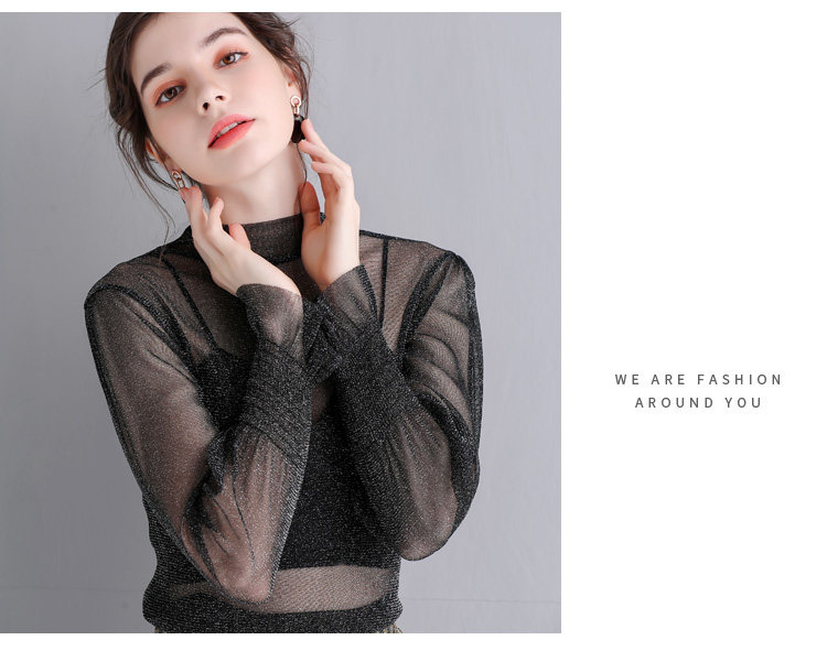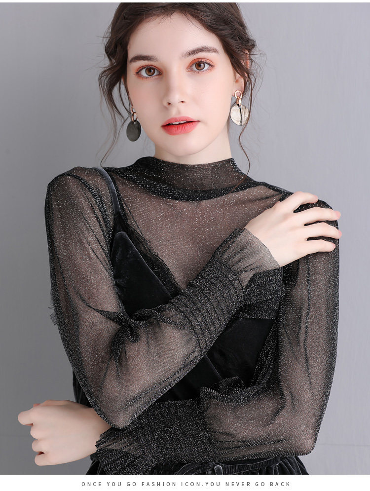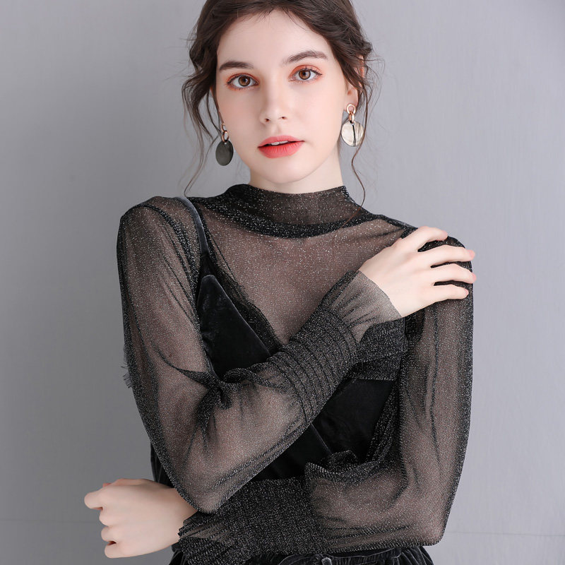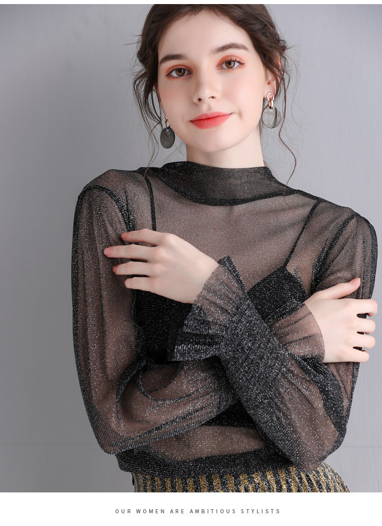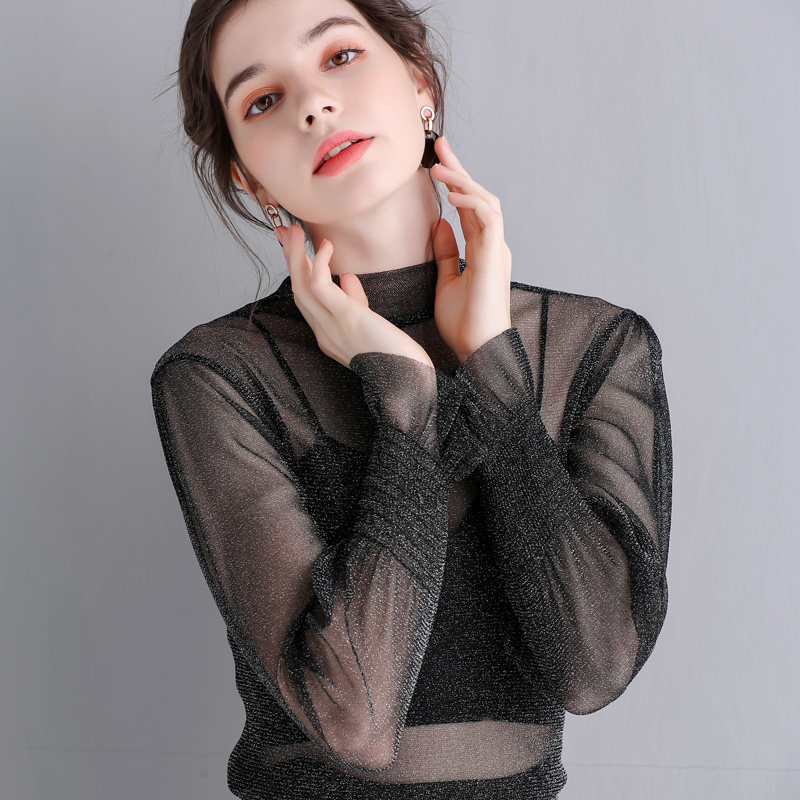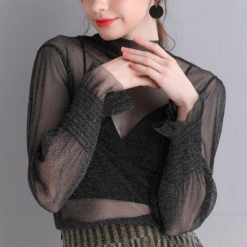 Яркая шелковая сетчатая рубашка для женщин для женщин с тонкой рубашкой с золотой и серебряной проволокой Сексуальная кружевная топ черный