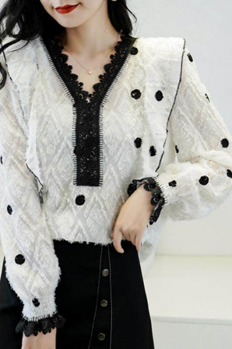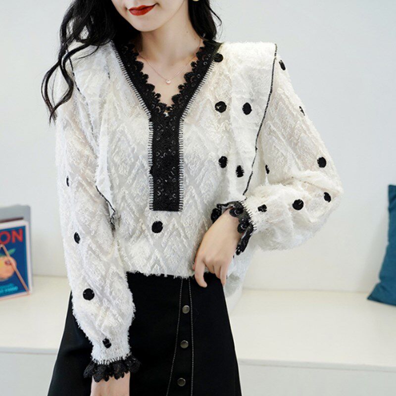 Кружевная базовая рубашка, осенний модный шифоновый лонгслив, в западном стиле, большой размер, V-образный вырез