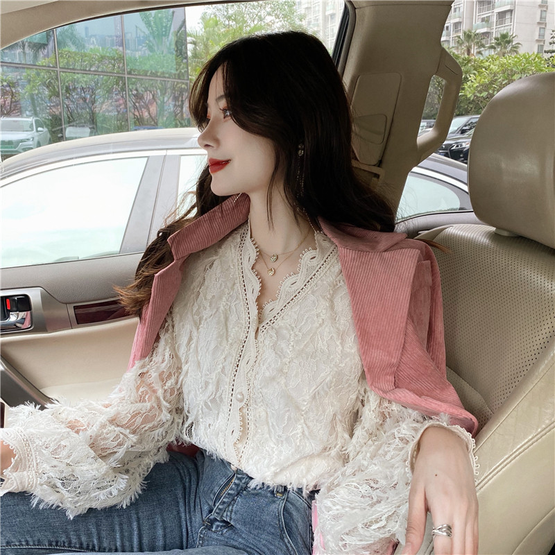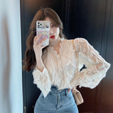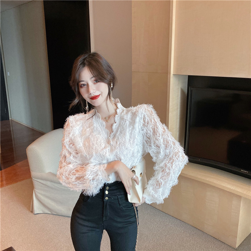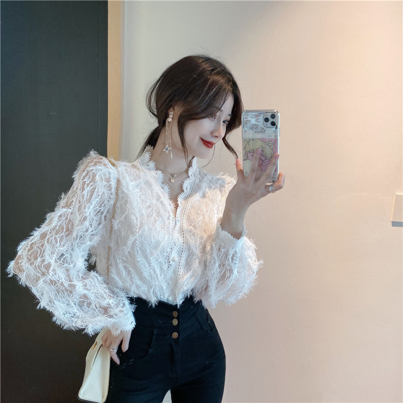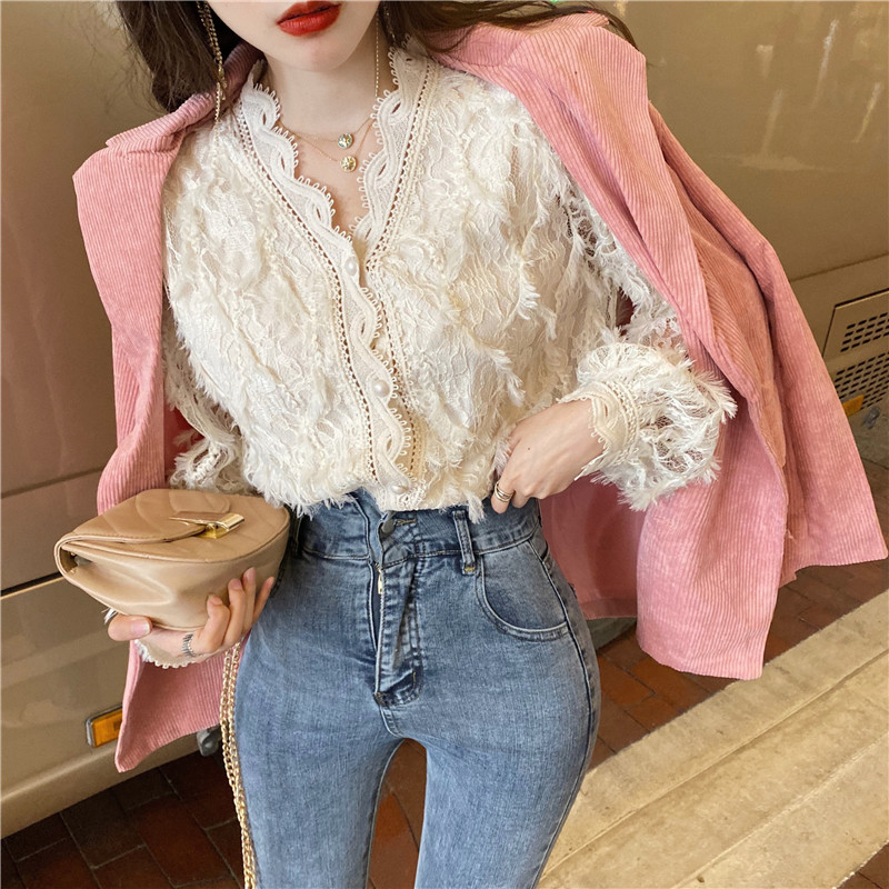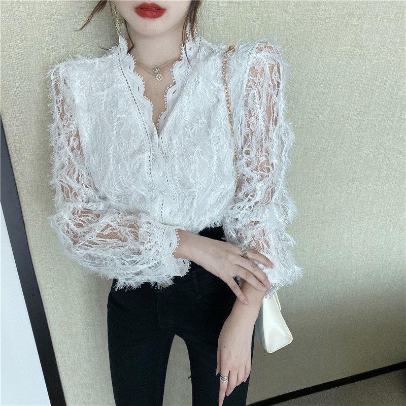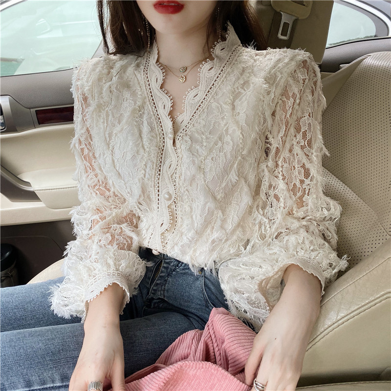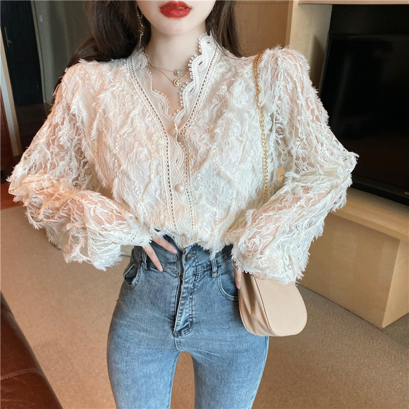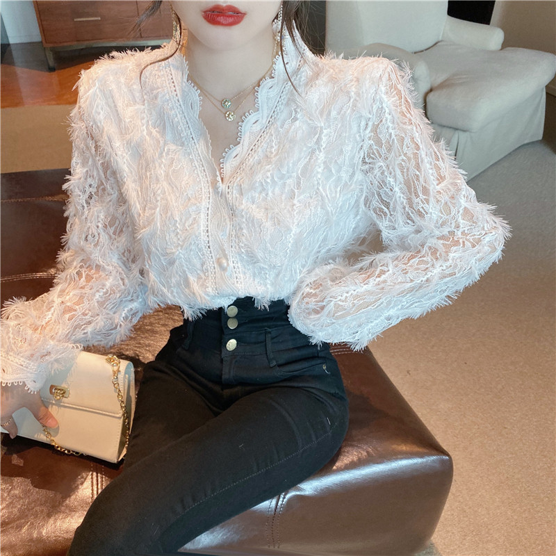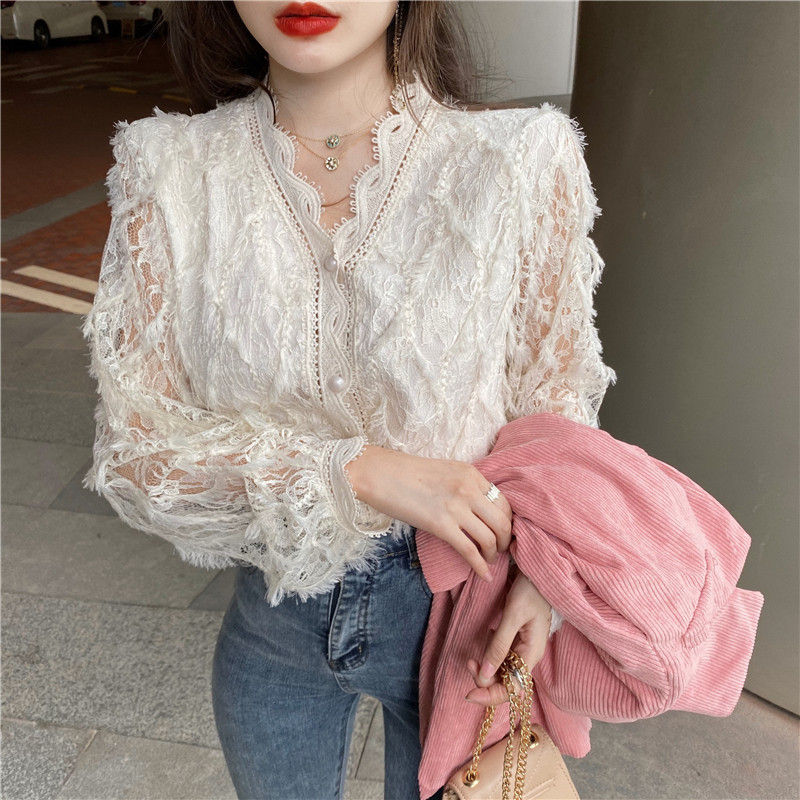 V-образное полость кружевная рубашка для женщин весной и осенью носить модную супер-сказочную рубашку 2024 Новый высококачественный топ темперамент