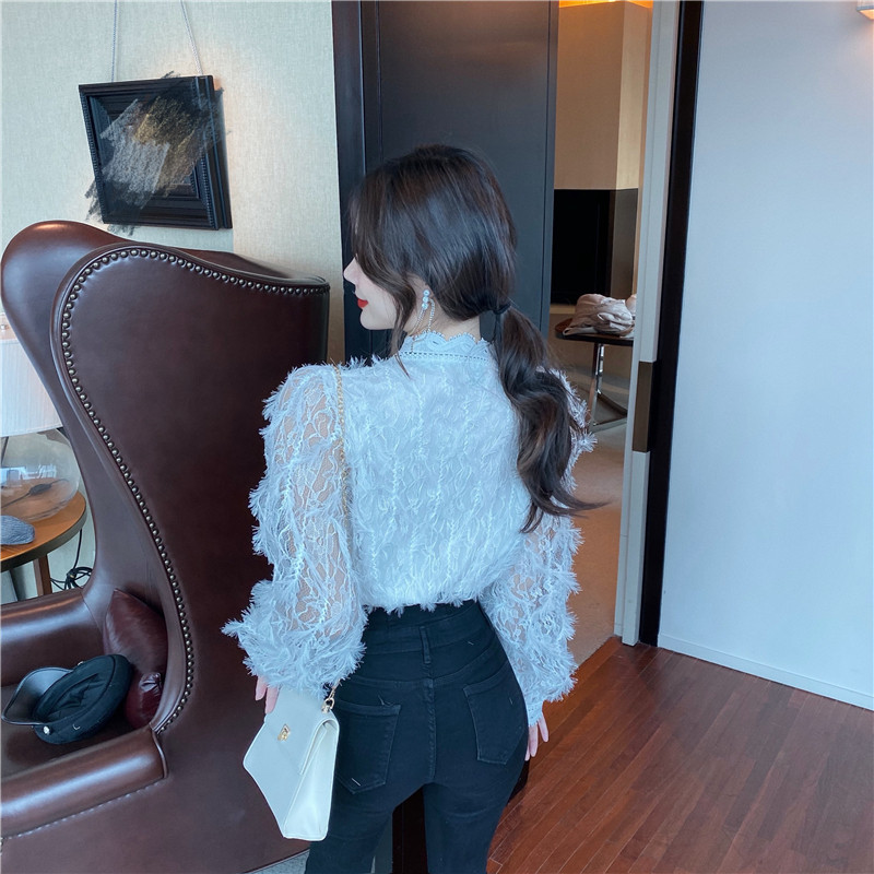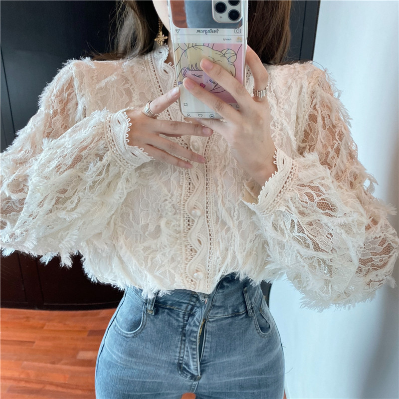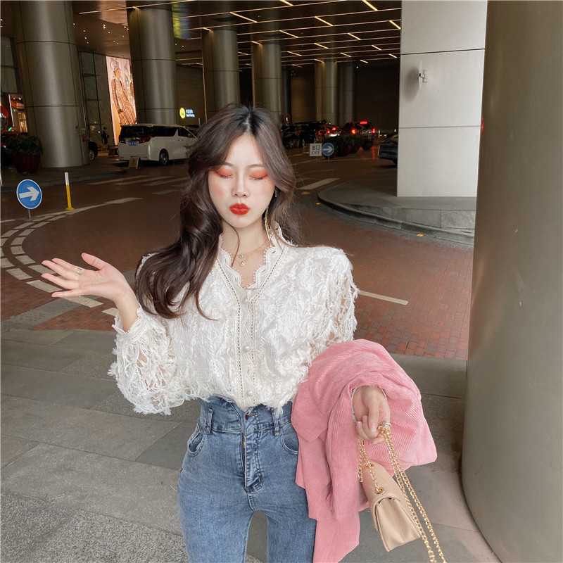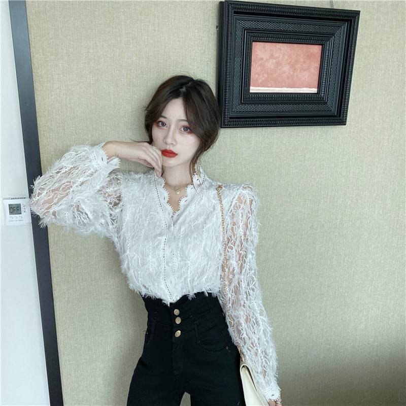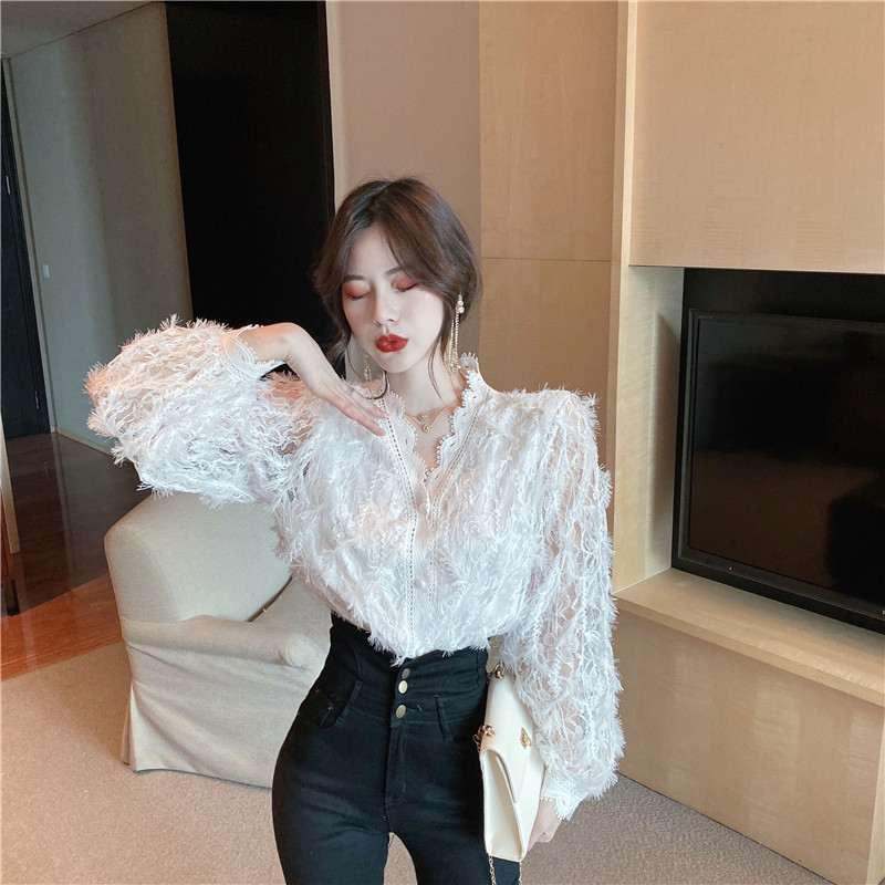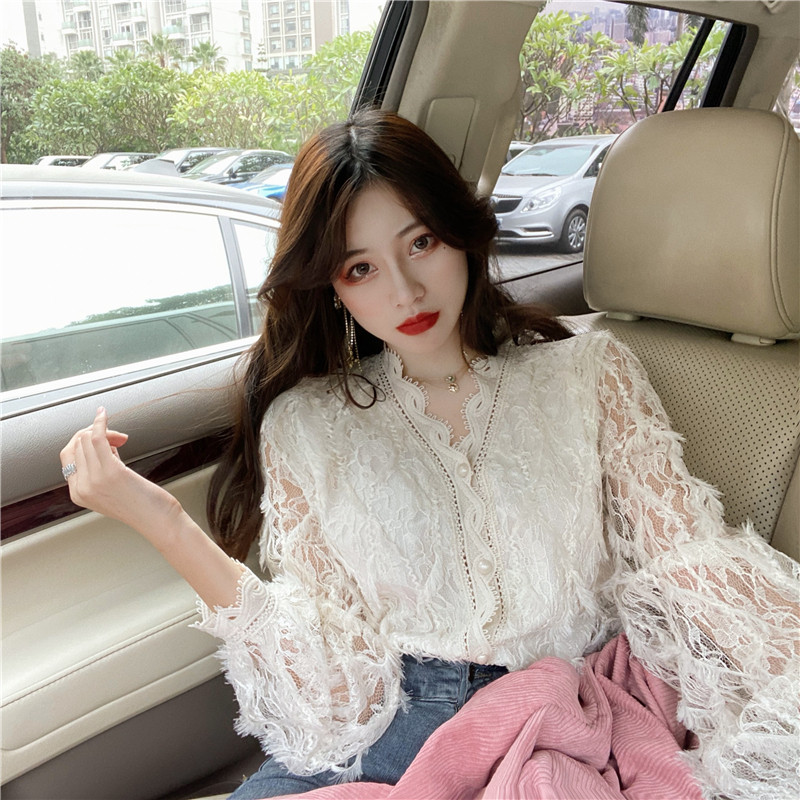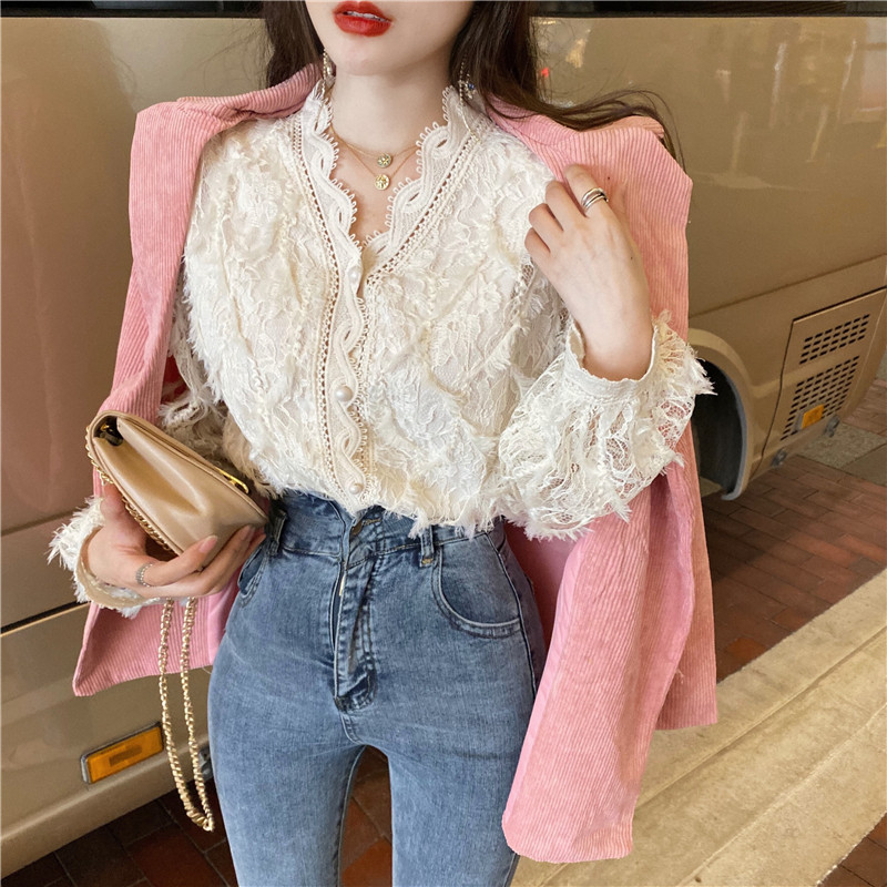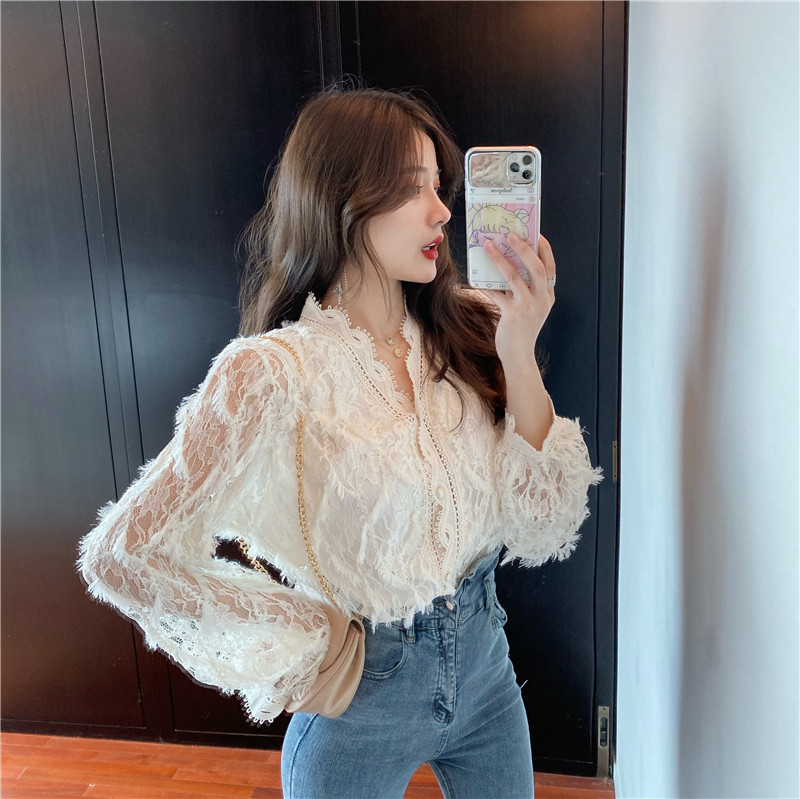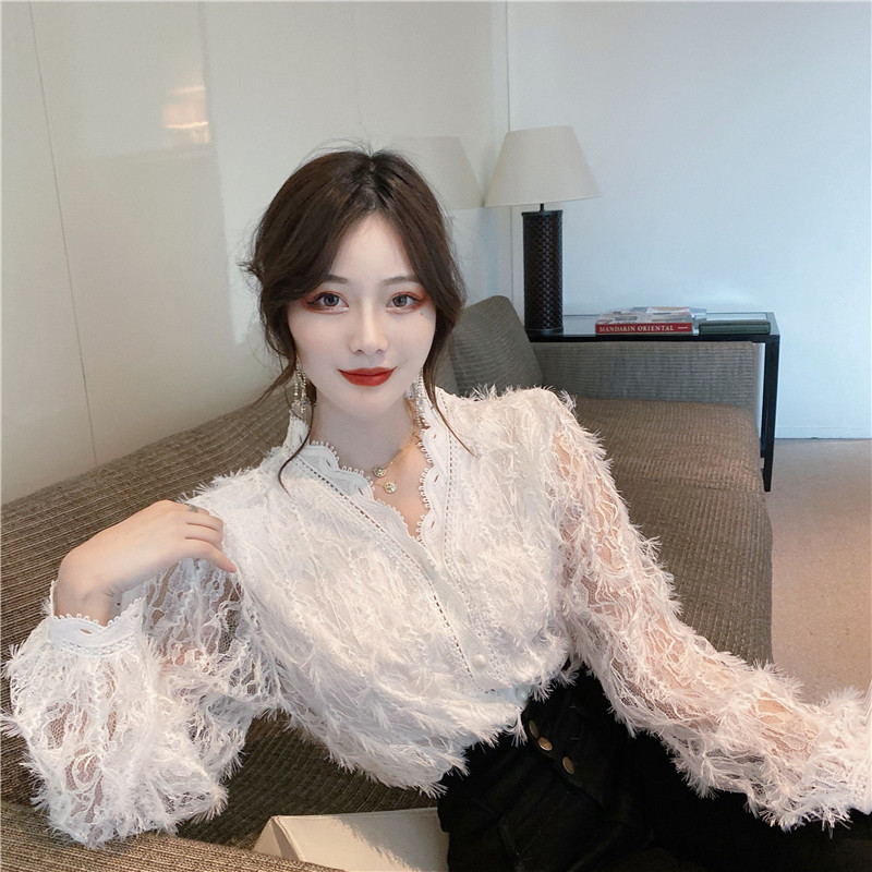 V-образное полость кружевная рубашка для женщин весной и осенью носить модную супер-сказочную рубашку 2024 Новый высококачественный топ темперамент