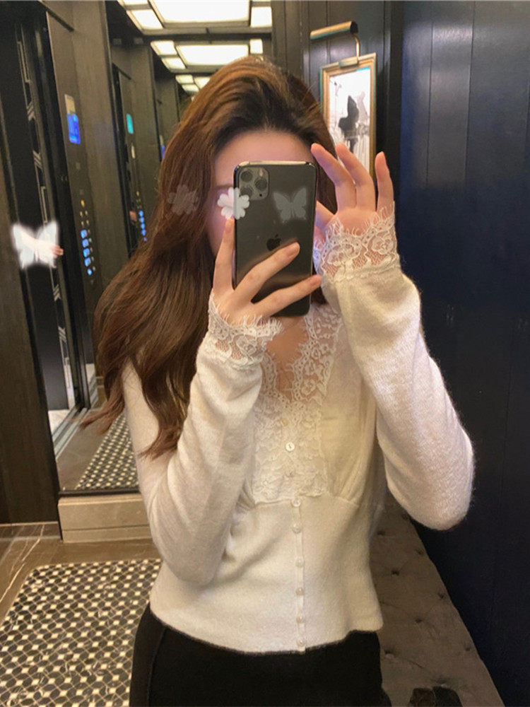 Осенняя белая шелковая кружевная приятная телу рубашка, коллекция 2021, в западном стиле, французский стиль, V-образный вырез