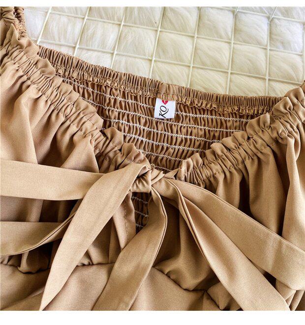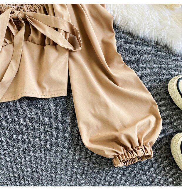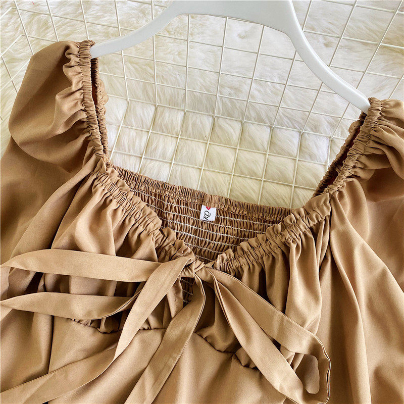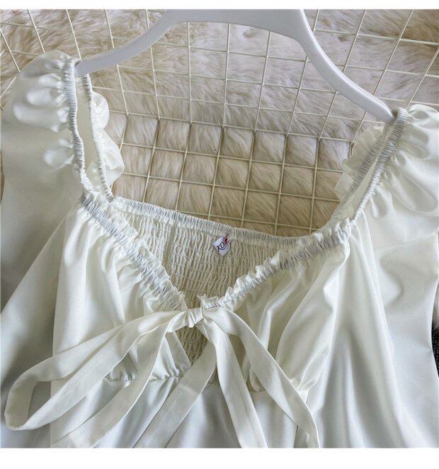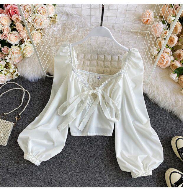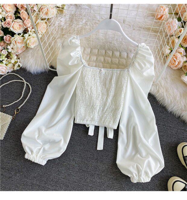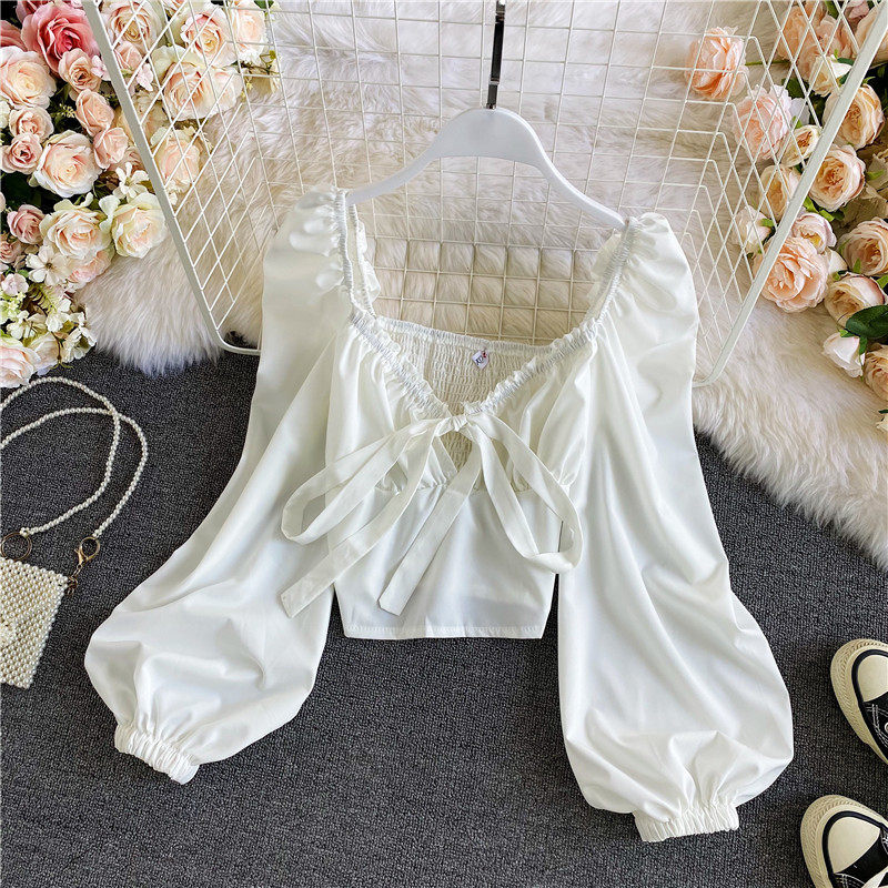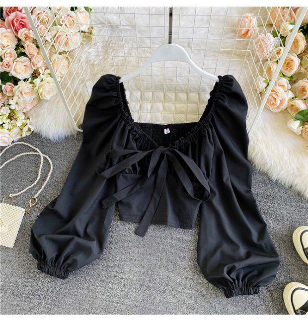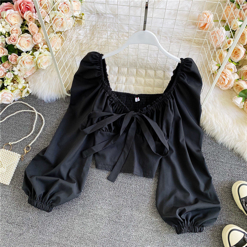 Осенняя короткая шифоновая футболка с бантиком, рукава фонарики, V-образный вырез, облегающий крой