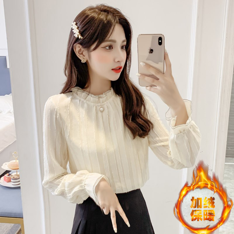 Бархатный утолщенная кружевная рубашка для женщин 2021 Весна и осень Новый Сладкий Внутренний Внутренний воротник Универсальный и модный топ.