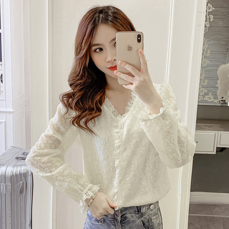 Демисезонная кружевная рубашка, 2021 года, в корейском стиле, в западном стиле, V-образный вырез