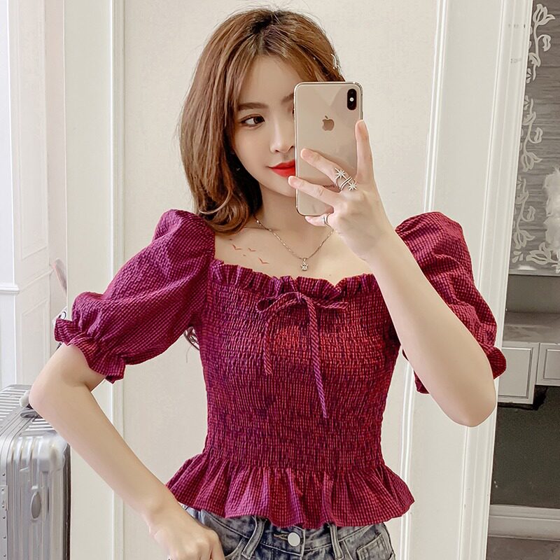 Шифоновая летняя одежда, приталенный короткий корсет, квадратный вырез, 2021 года, в корейском стиле, рукава фонарики