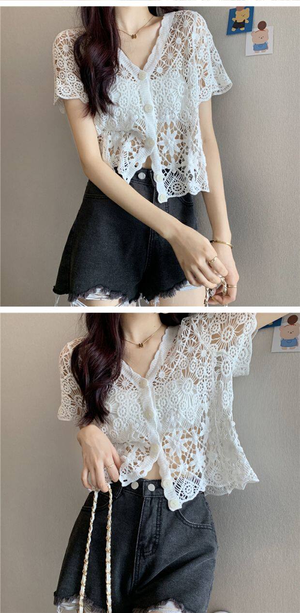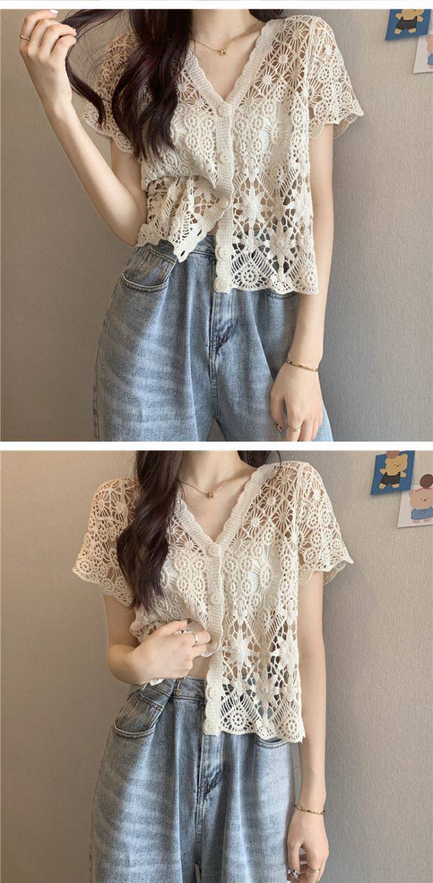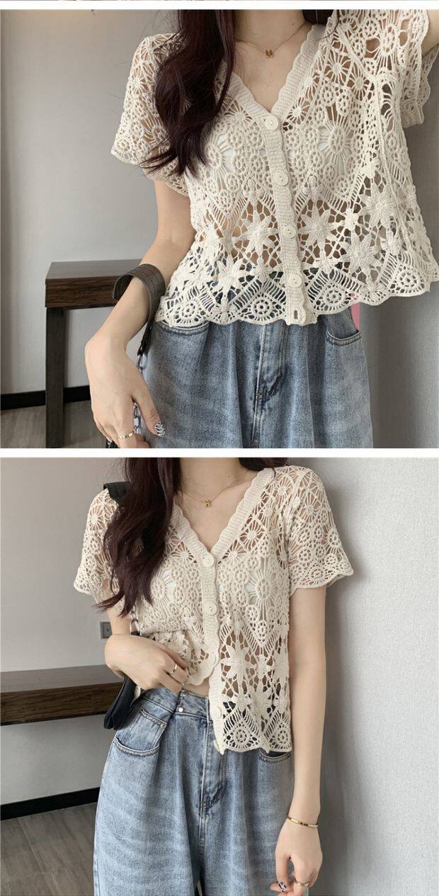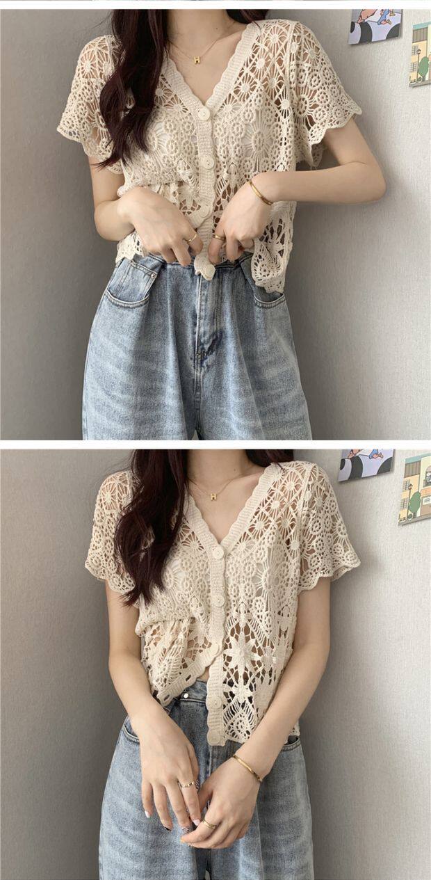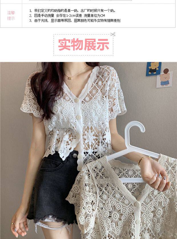 Кружевной кардиган, в корейском стиле, V-образный вырез, в западном стиле, короткий рукав