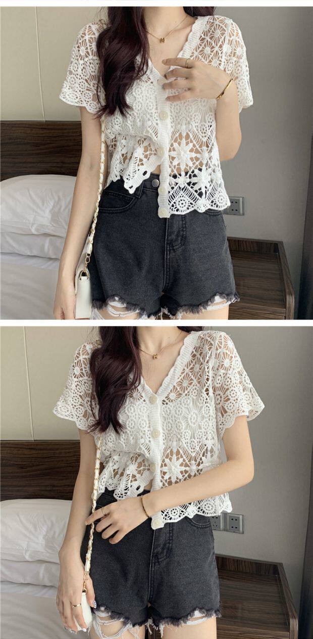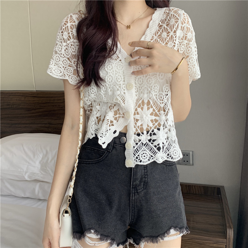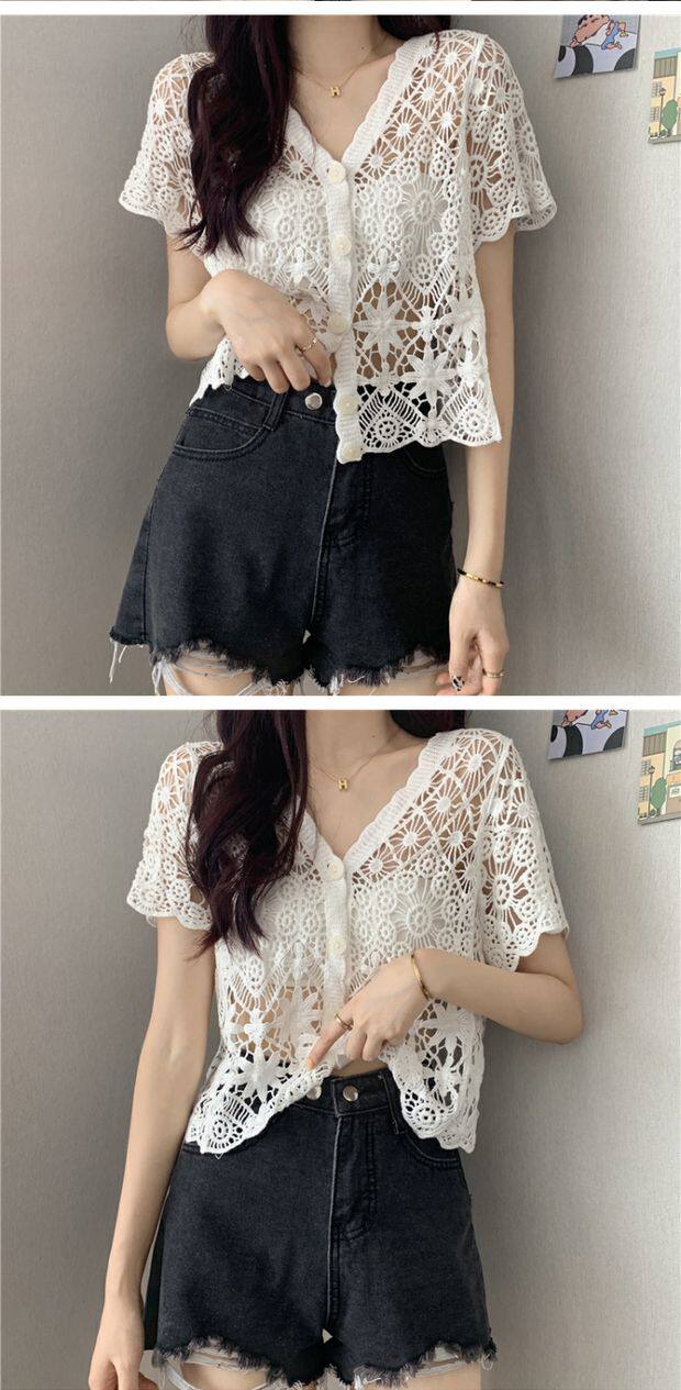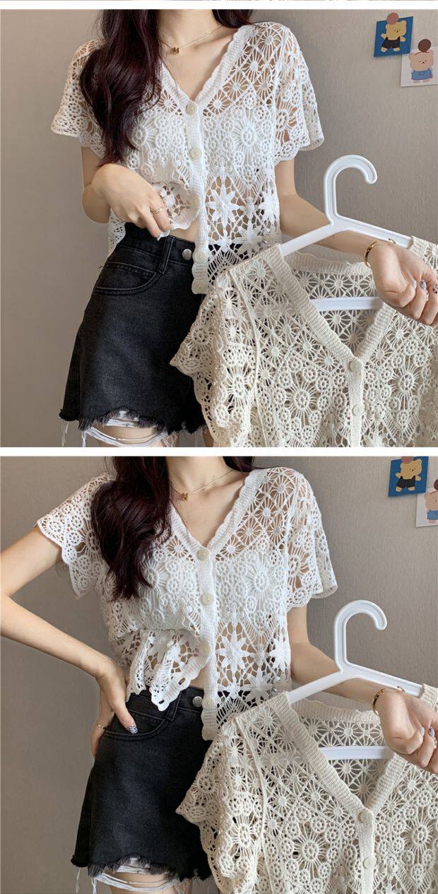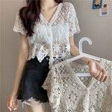 Кружевной кардиган, в корейском стиле, V-образный вырез, в западном стиле, короткий рукав
