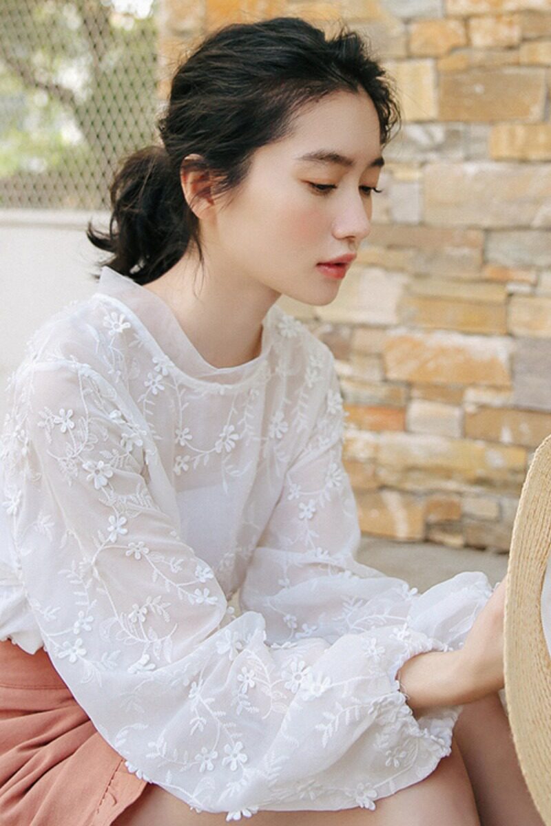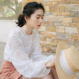 Кружевная летняя однотонная пляжная рубашка с круглым воротником, рукава фонарики, с вышивкой, защита от солнца, свободный крой