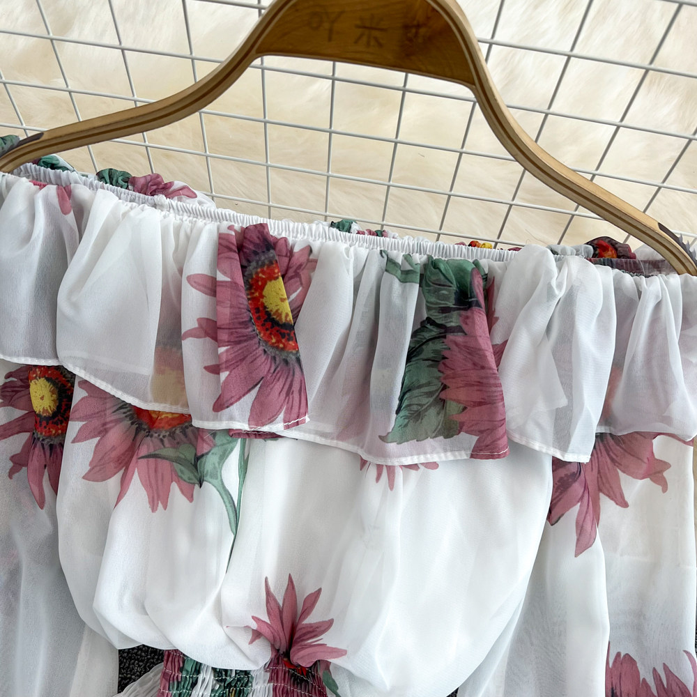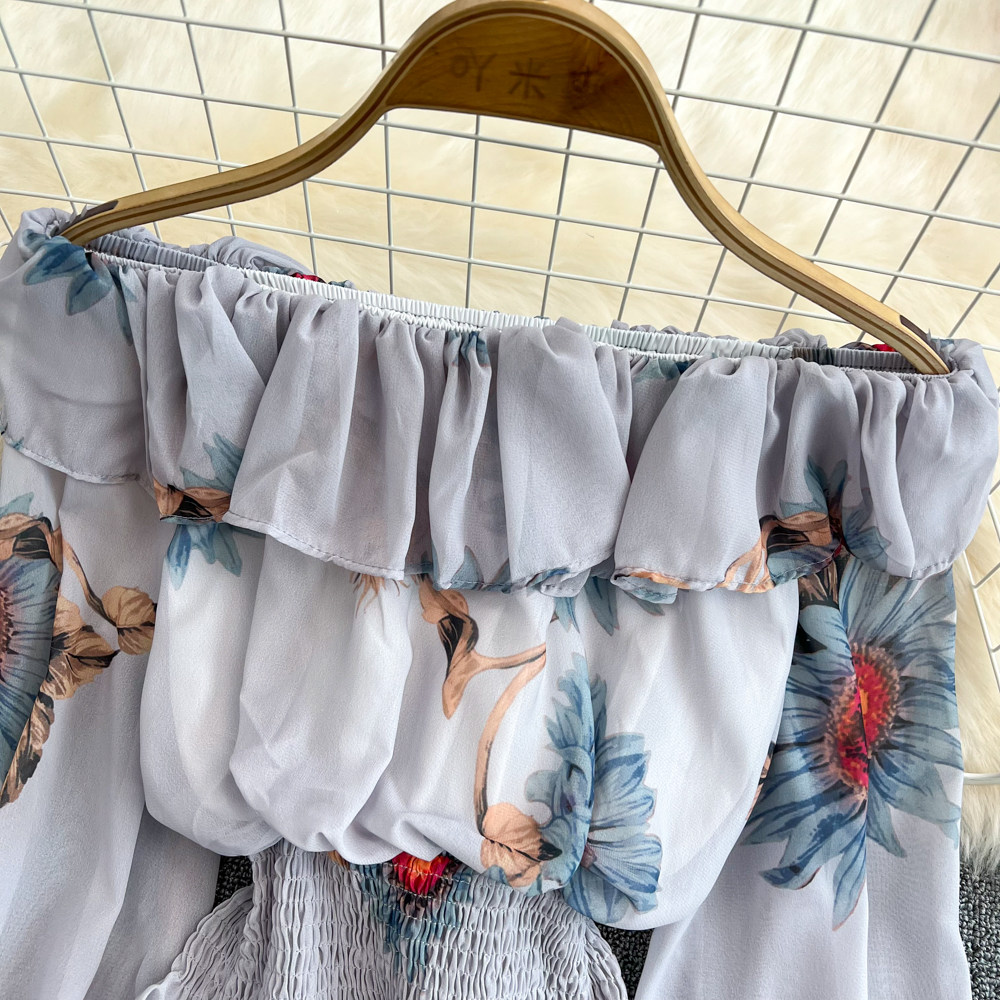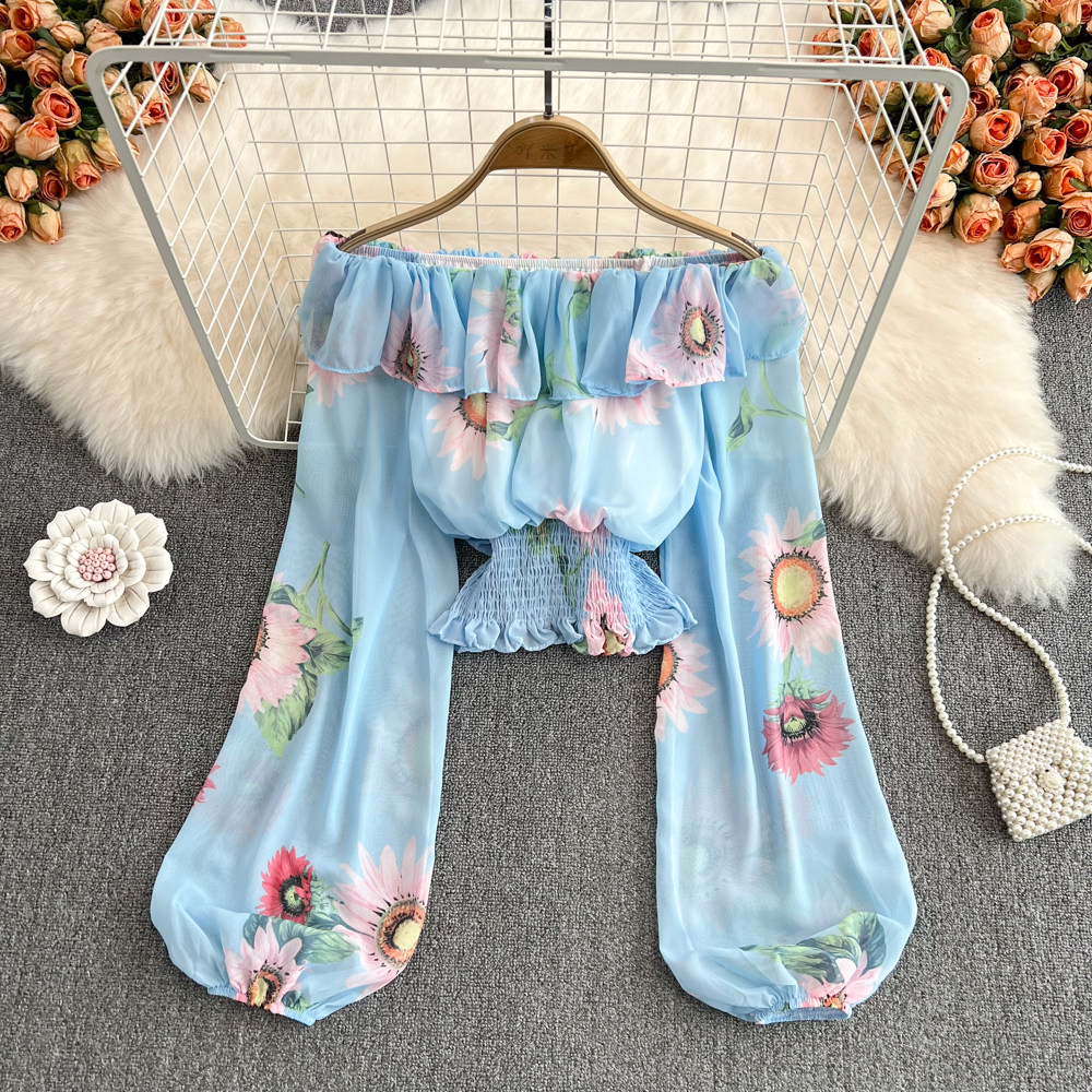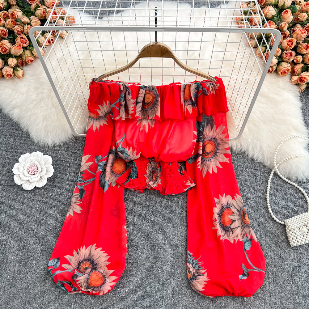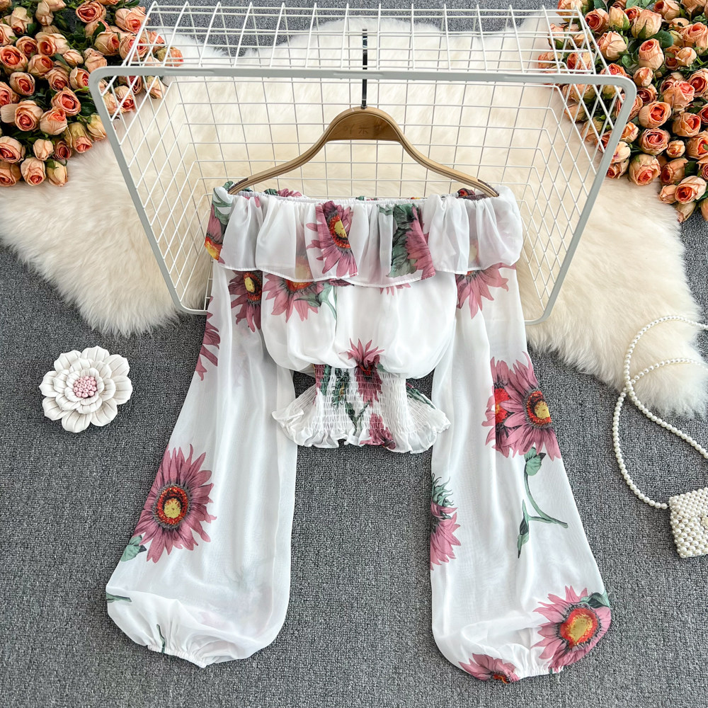 Шифоновый короткий корсет, весенний лонгслив, открытые плечи, шифоновый с принтом, в западном стиле