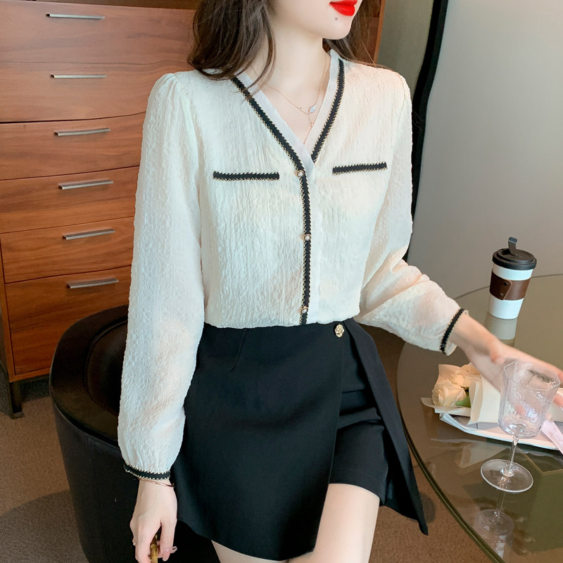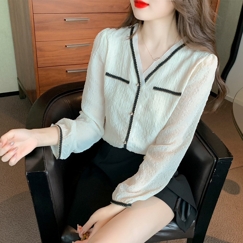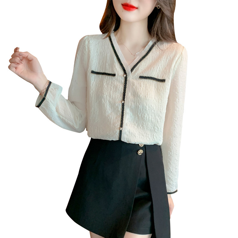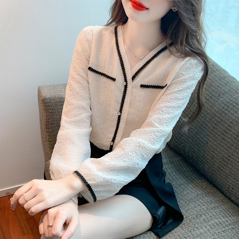 Шифоновая кружевная осенняя дизайнерская рубашка, французский стиль, V-образный вырез, коллекция 2023, тренд сезона