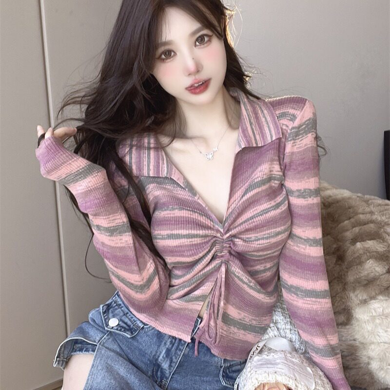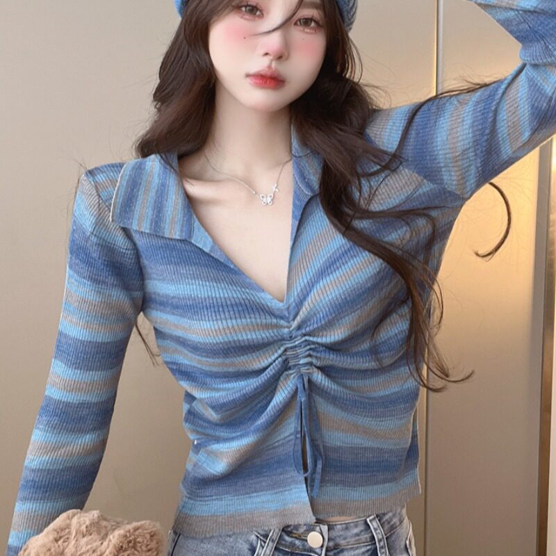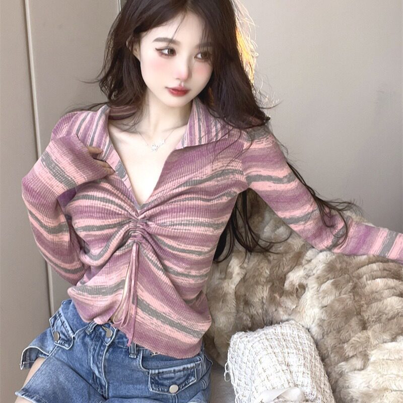 Осеннее тонкое трикотажное белье для повседневной носки, короткий приталенный лонгслив, V-образный вырез