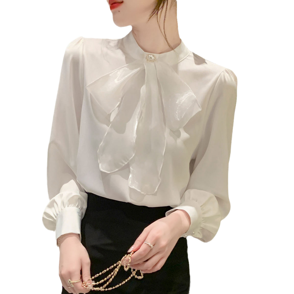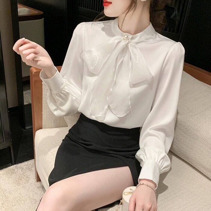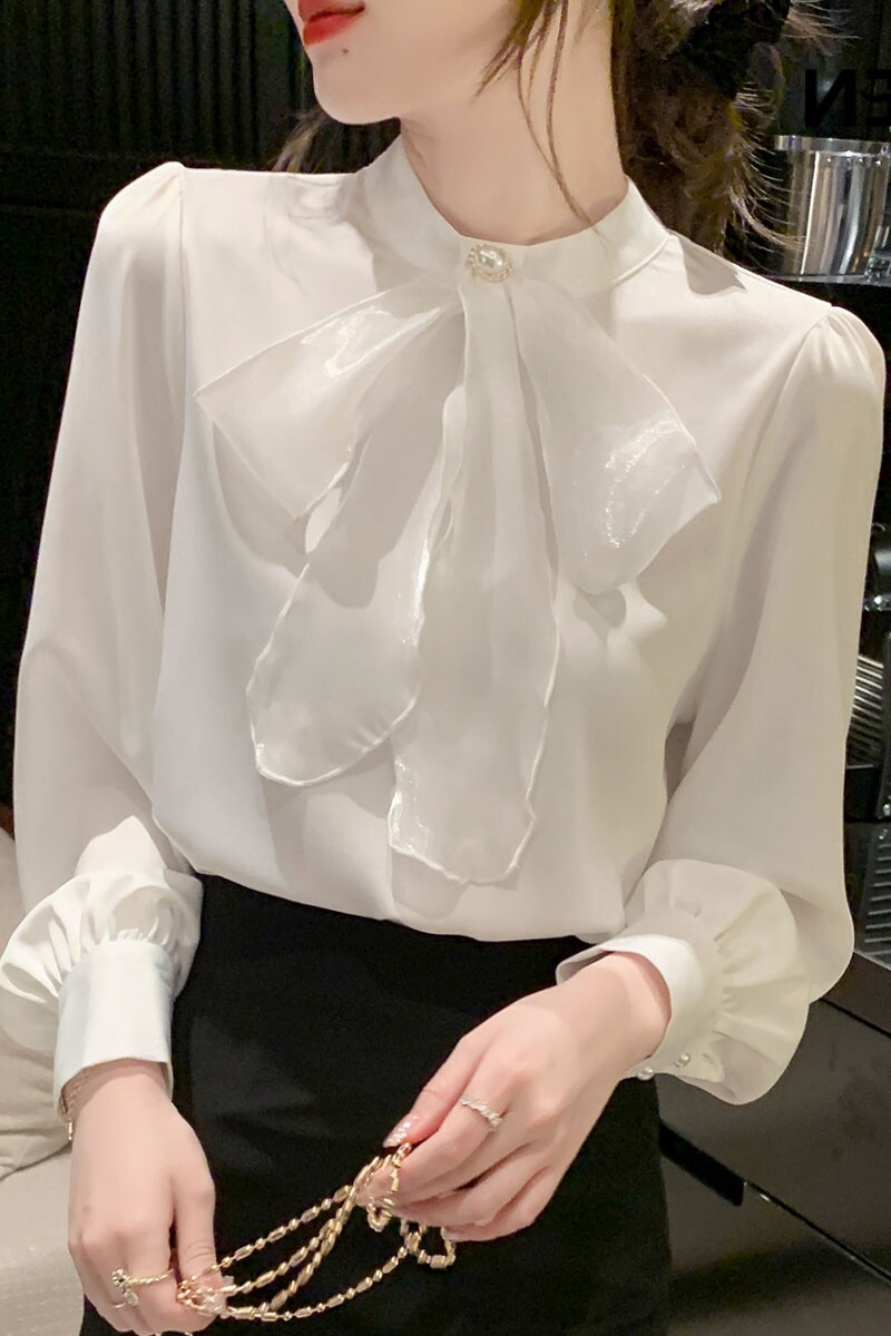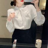 Белый шифоновый осенний модный лонгслив, рубашка с бантиком, коллекция 2023, в западном стиле