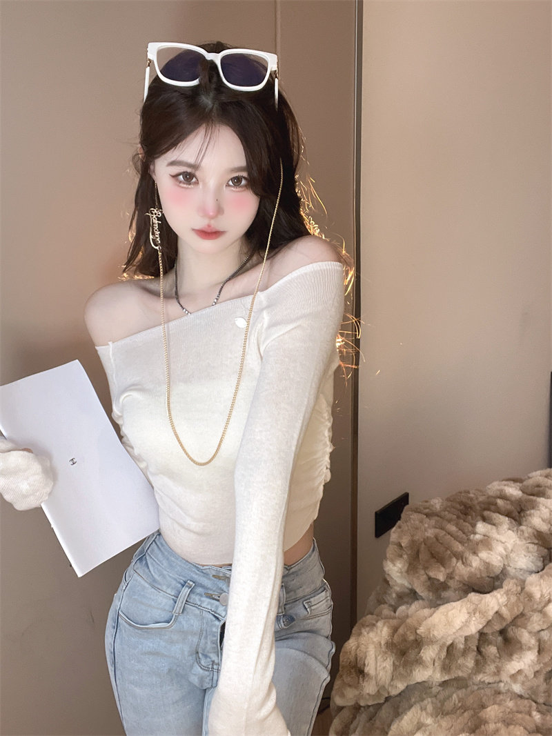 Розовая тонкая вязаная базовая рубашка для женщин осенью и зимней солнцезащитной блузкой Pure Sweet Hot Girl Сексуальная одноруба