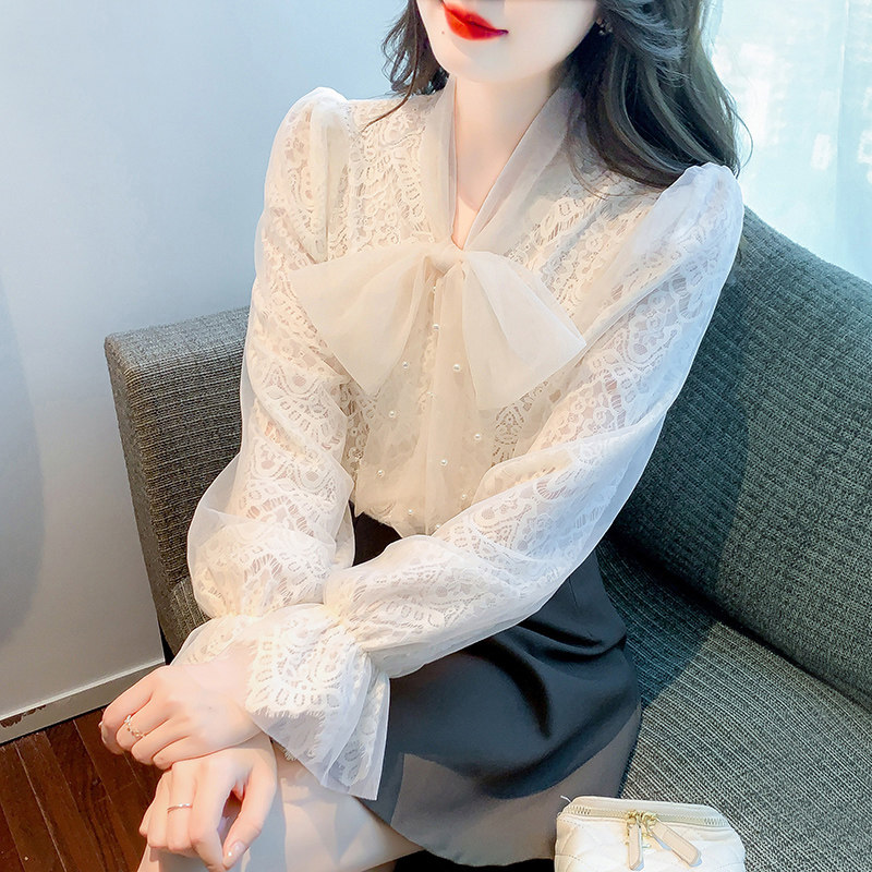 Кружевной шелковый приятный телу весенний лонгслив с бантиком, рубашка, 2023, тренд сезона, в западном стиле