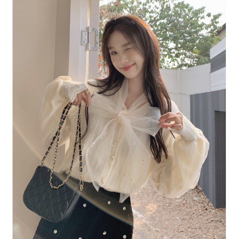 Осенняя рубашка с бантиком, лонгслив, французский стиль, коллекция 2023, изысканный стиль