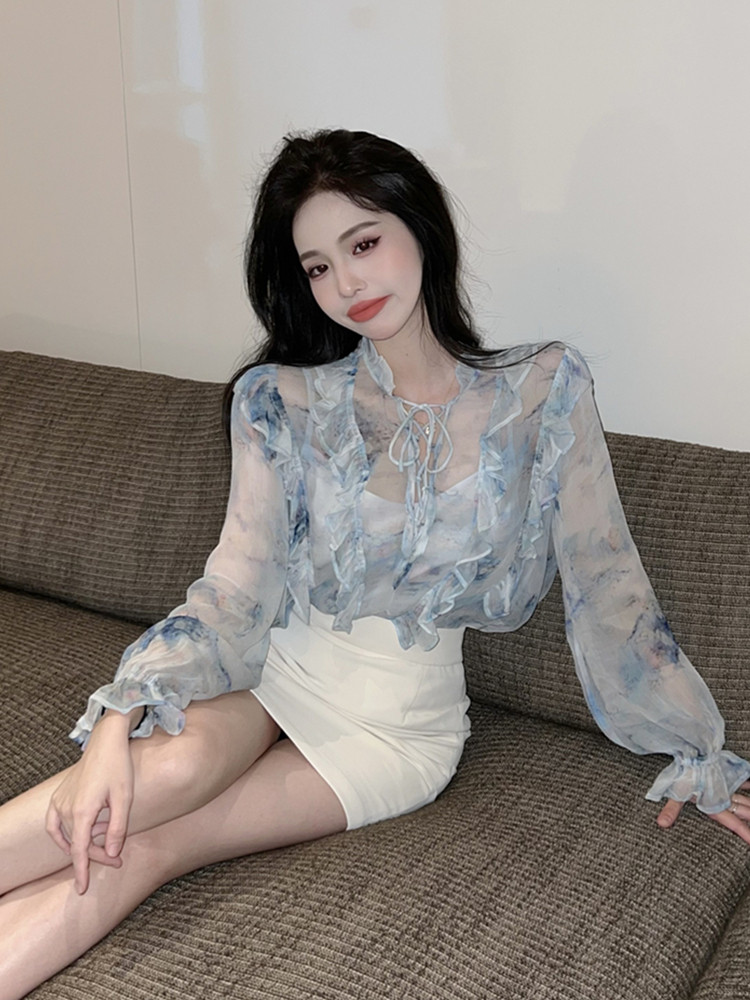Весенняя сексуальная рубашка, французский стиль, цветочный принт, рукава фонарики