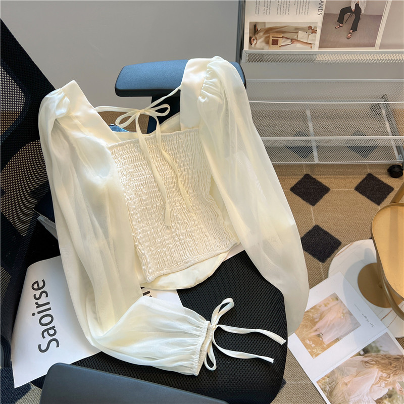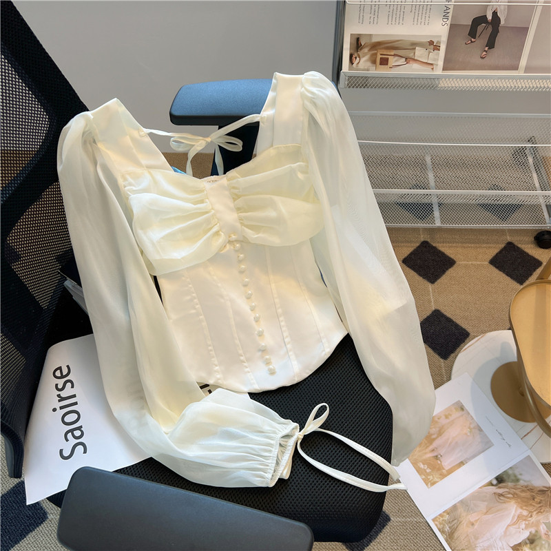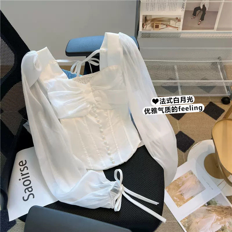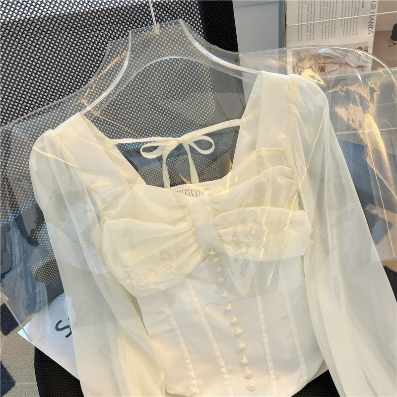 Весенний сексуальный короткий ремень, белая шифоновая рубашка, французский стиль, квадратный вырез