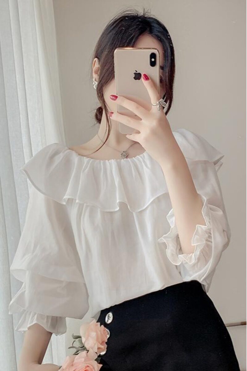 Летняя дизайнерская рубашка, французский стиль, коллекция 2023, тренд сезона, открытые плечи